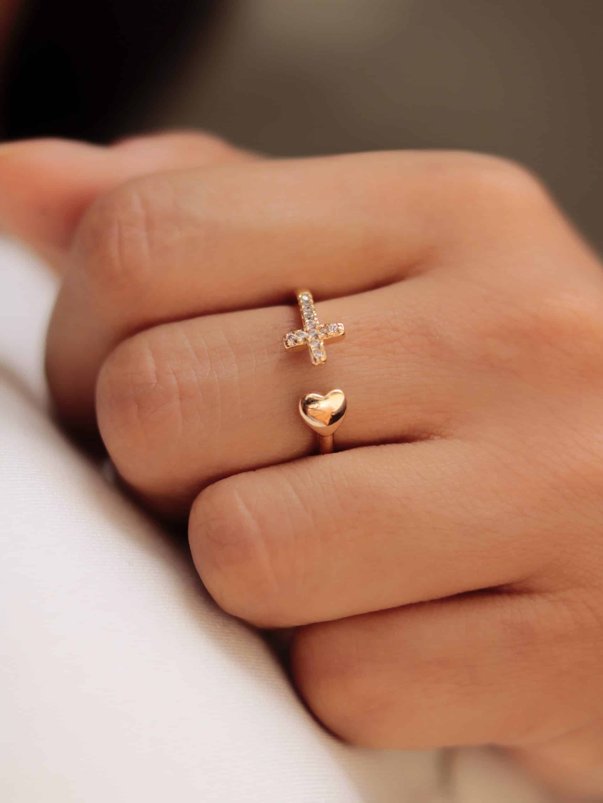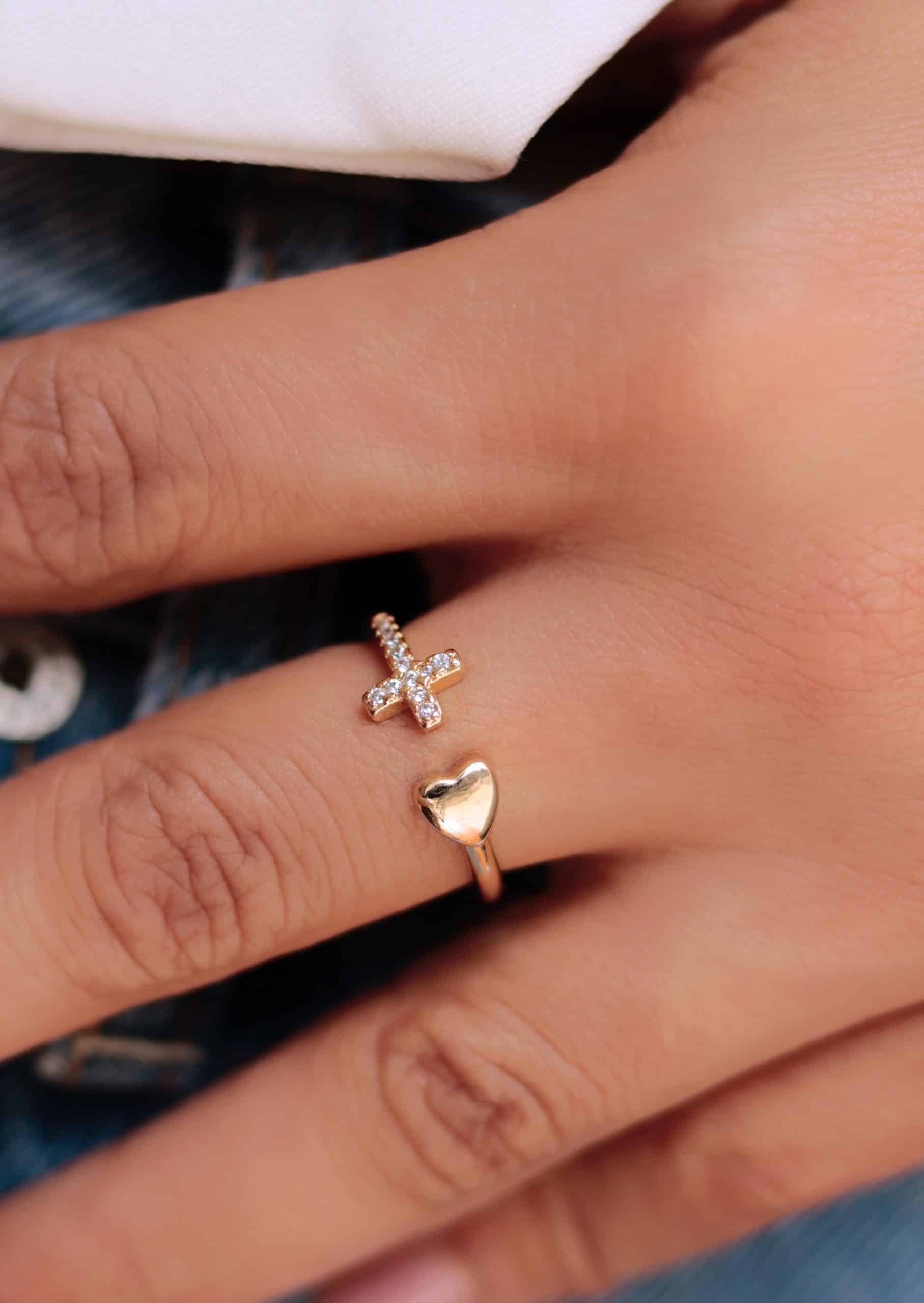 ANEL ZIRCONIA COM CRUZ CRAVEJADA E CORACAO LISO ABERTO