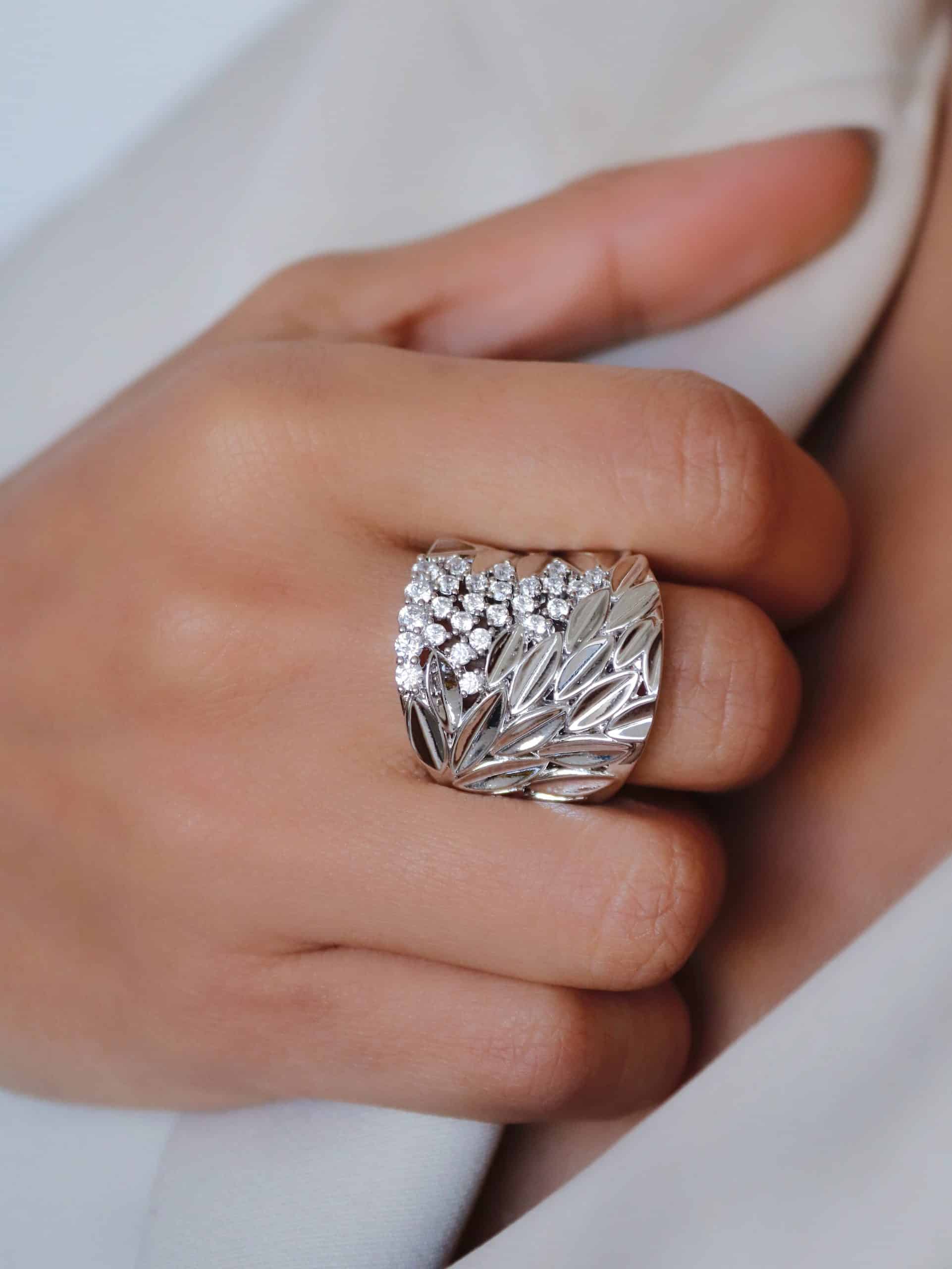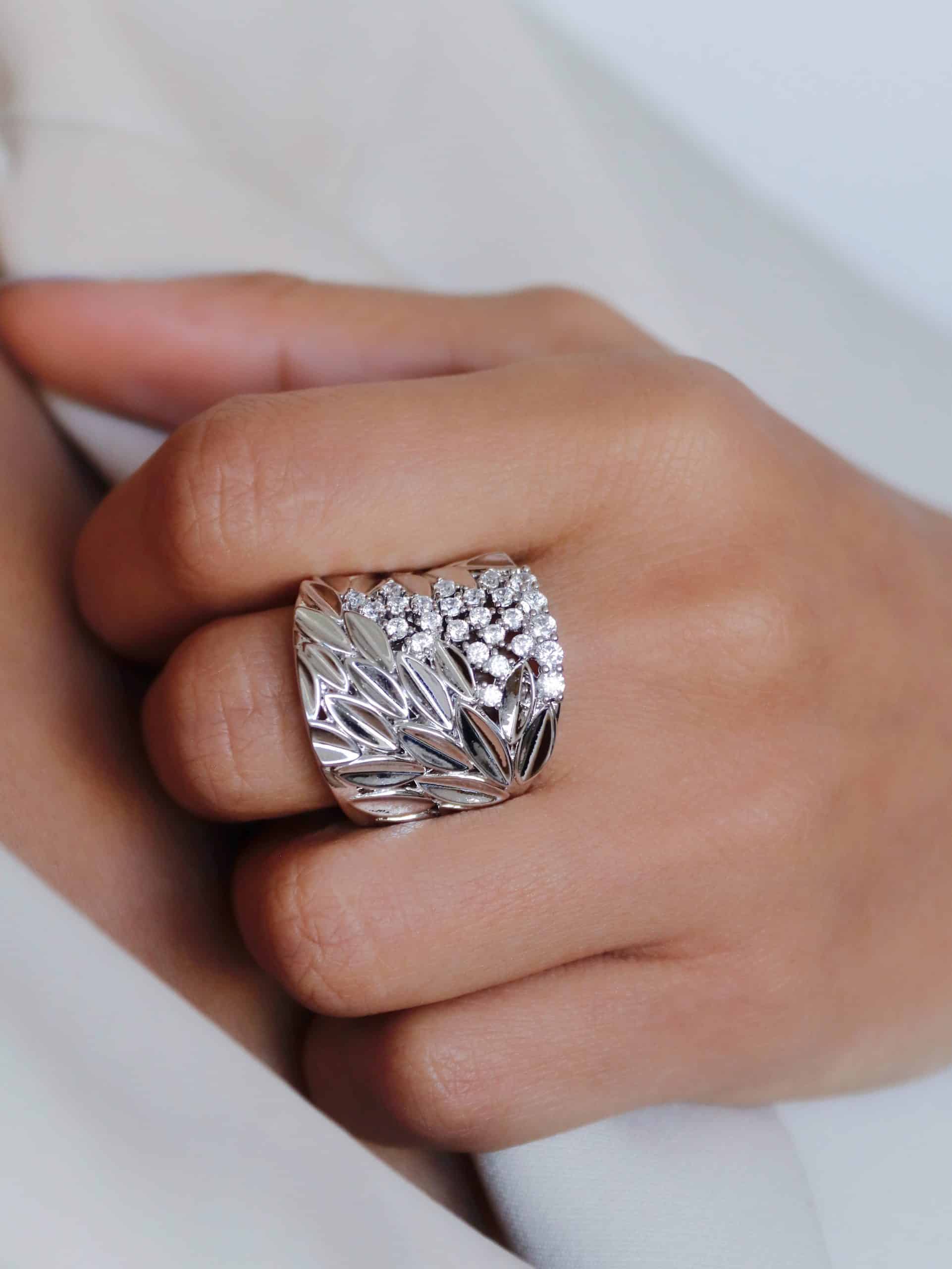 ANEL ZIRCONIA COM DUAS FAIXAS CRAVEJADAS E DUAS LISAS COM FORMATOS DE LOSANGOS