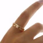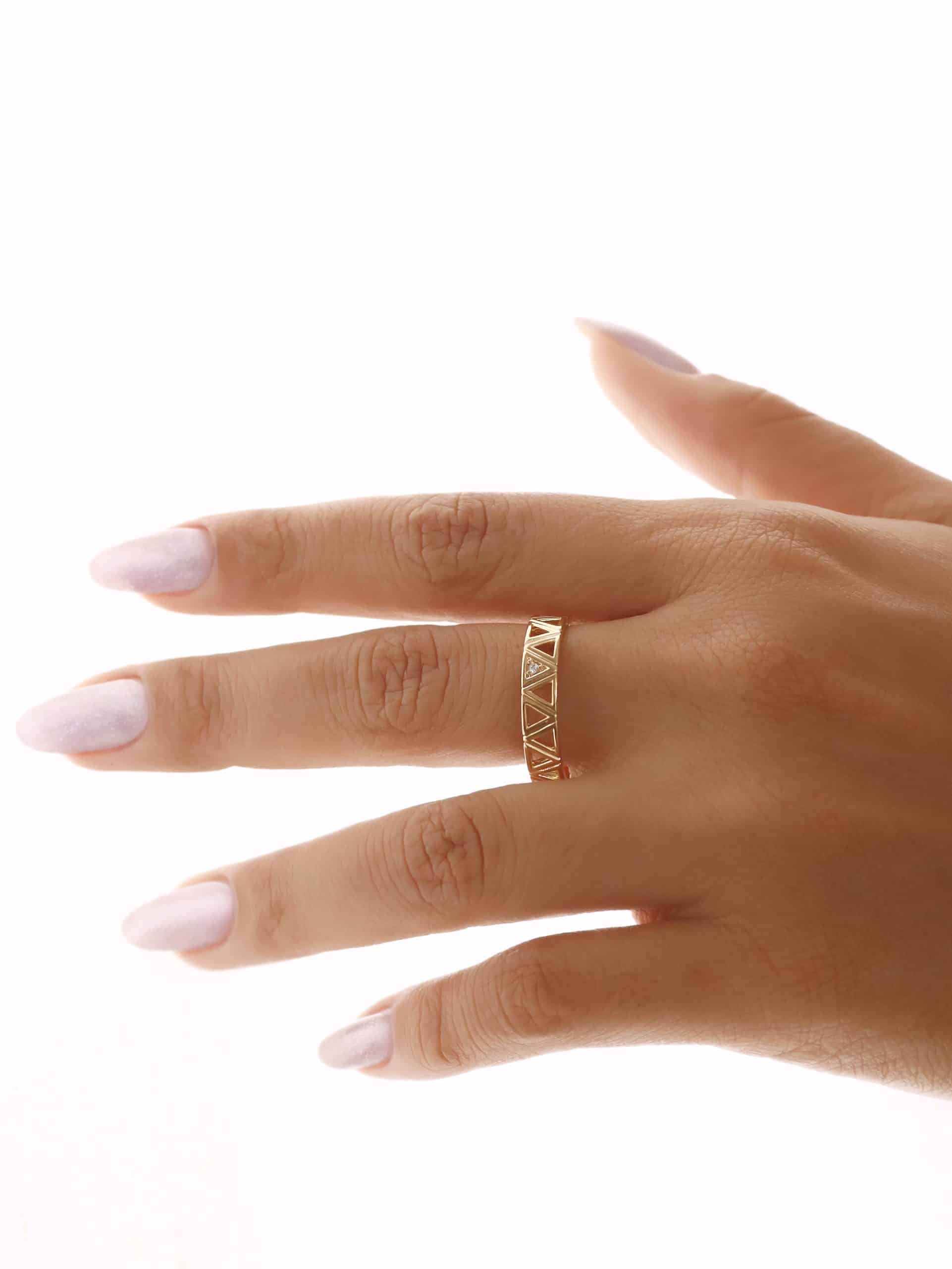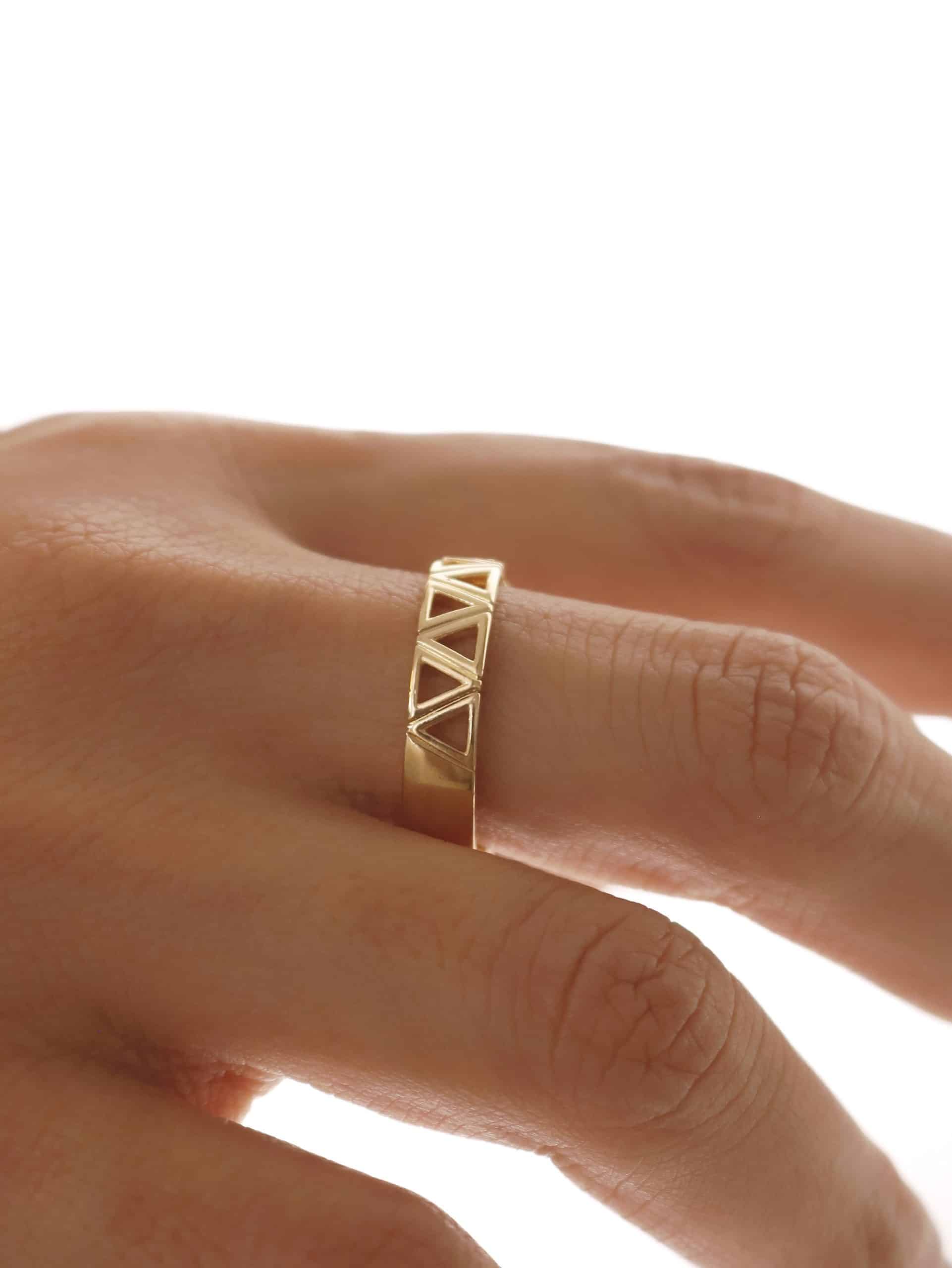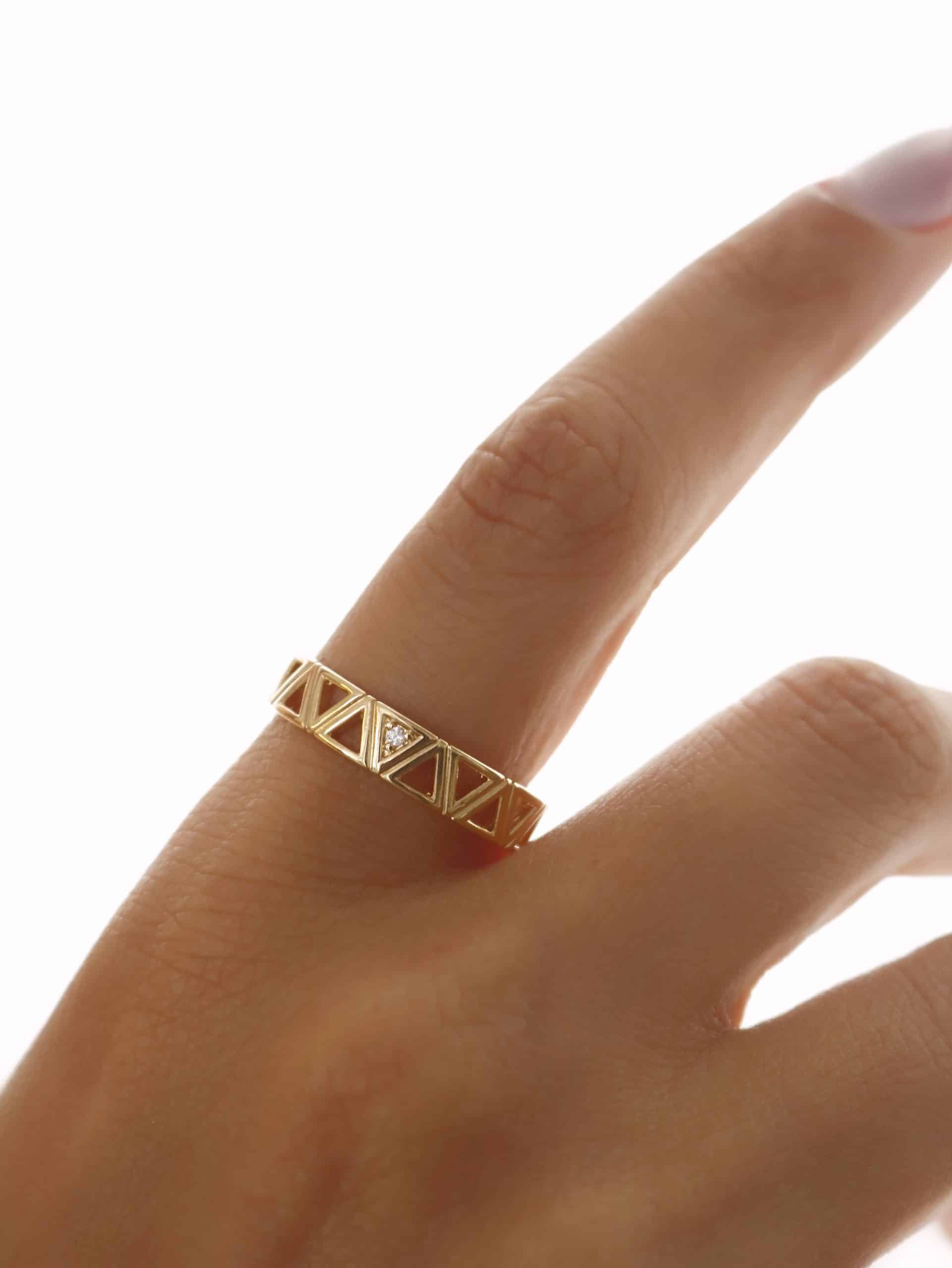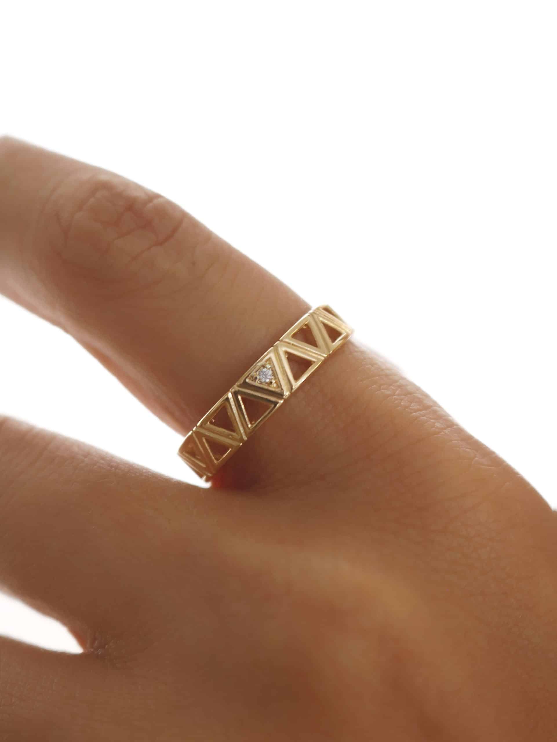 ANEL ZIRCONIA COM TRIANGULOS LISOS VAZADOS E UM TODO CRAVEJADO