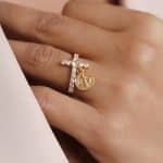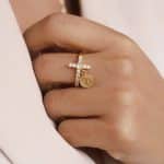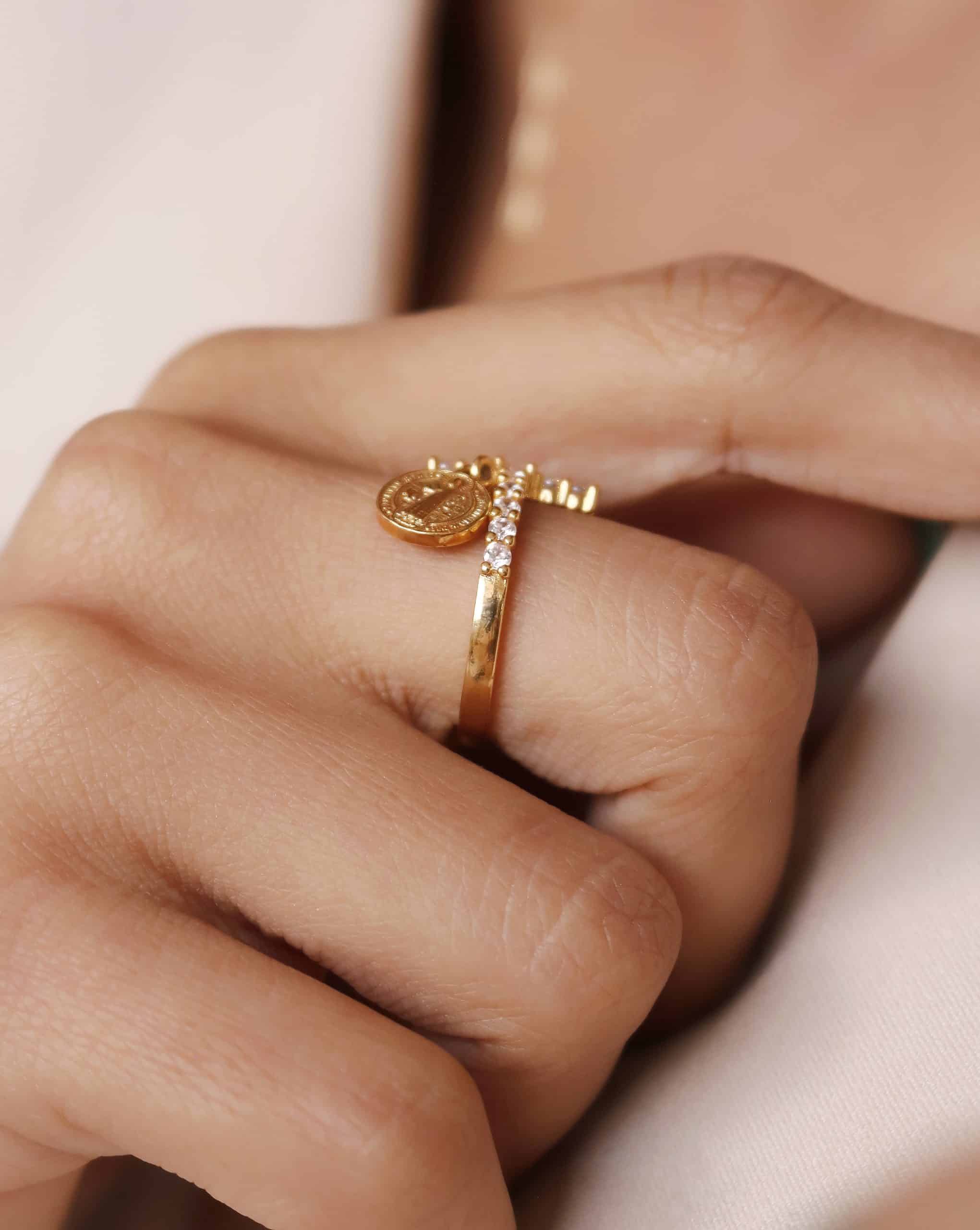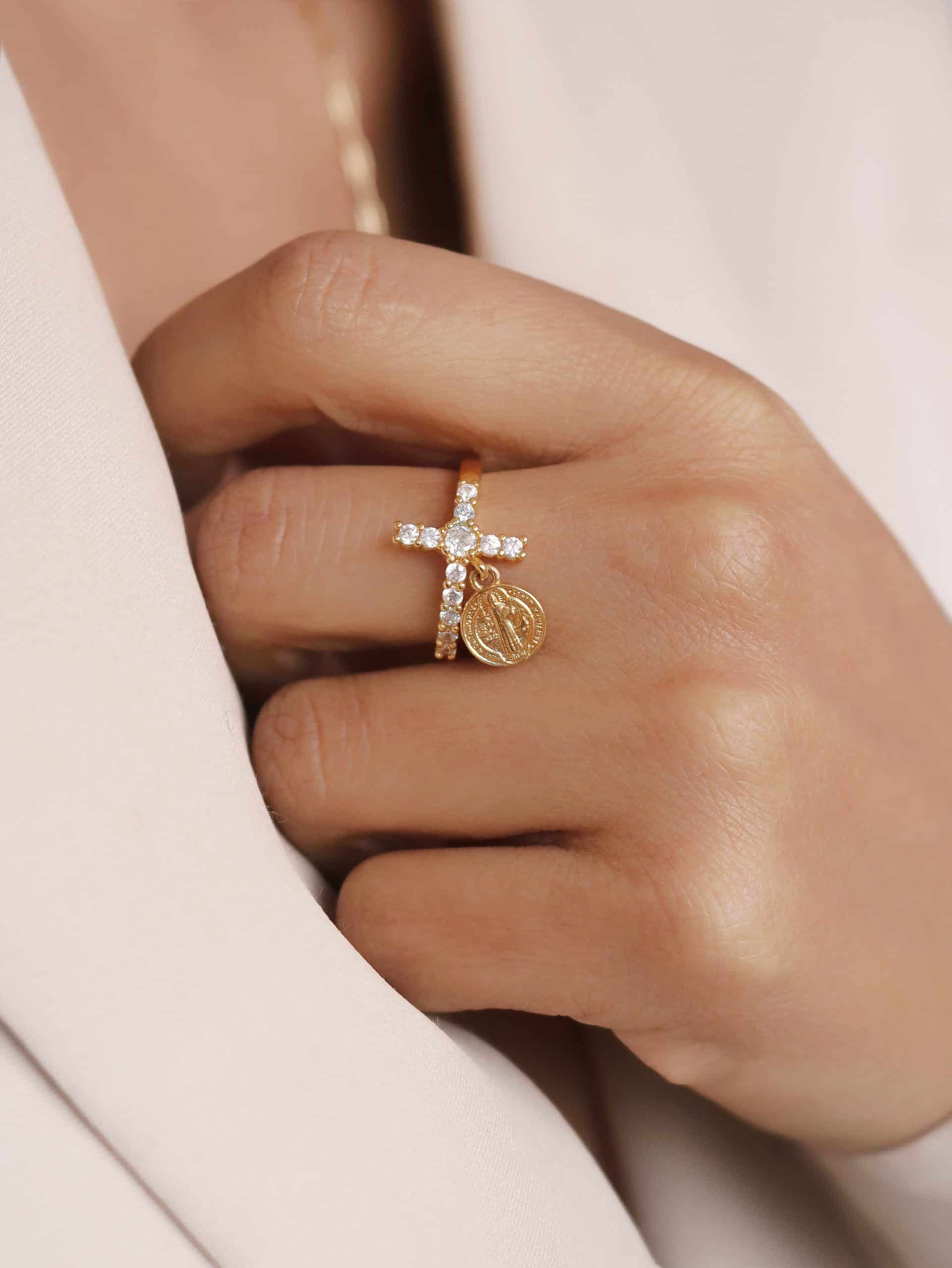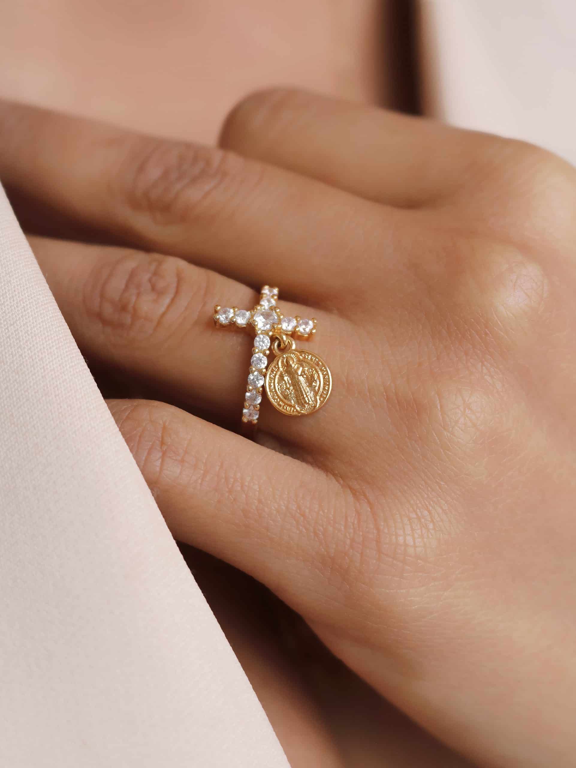 ANEL ZIRCONIA CRUZ COM MEDALHA DE SAO BENTO PENDURADA