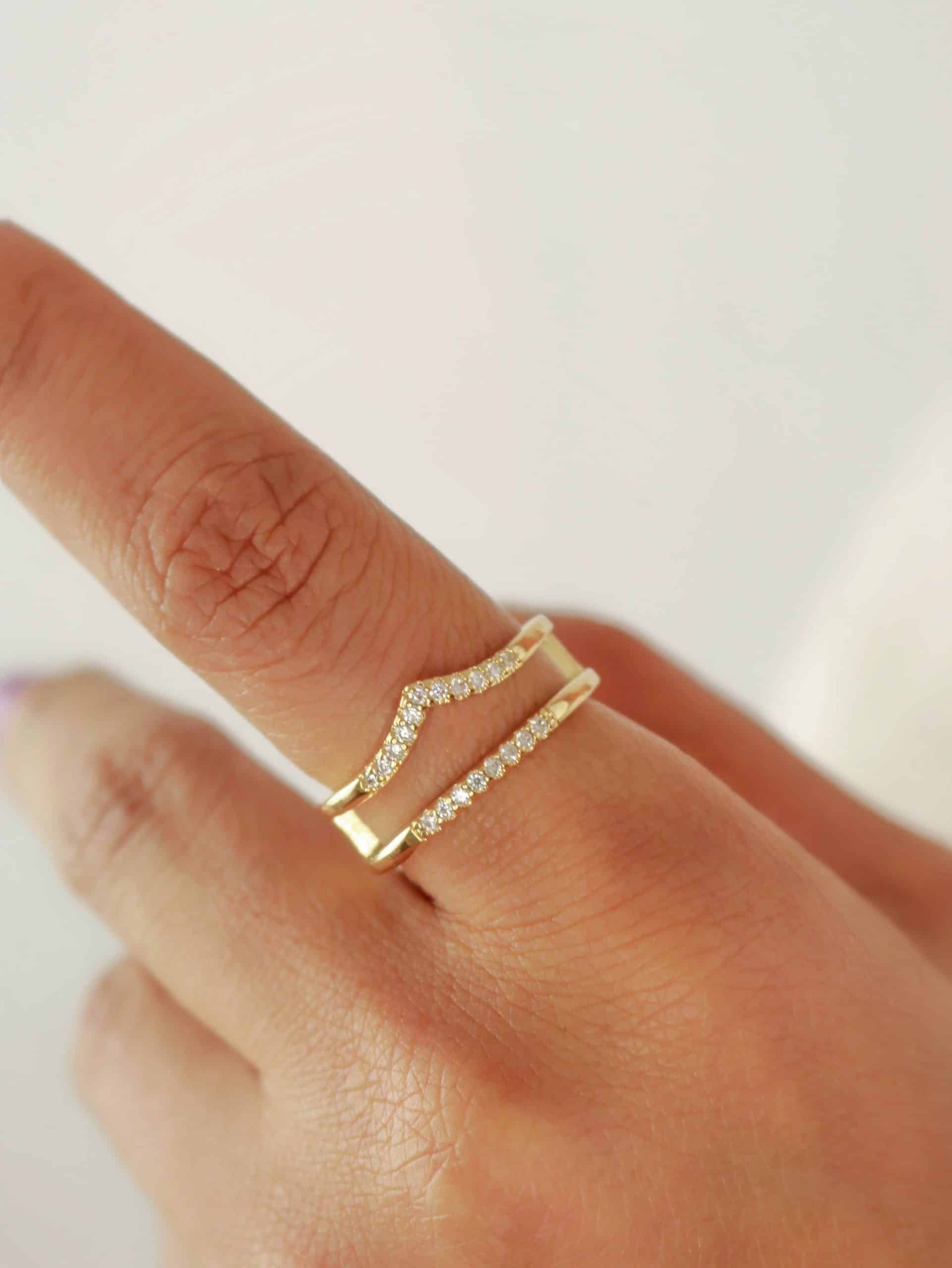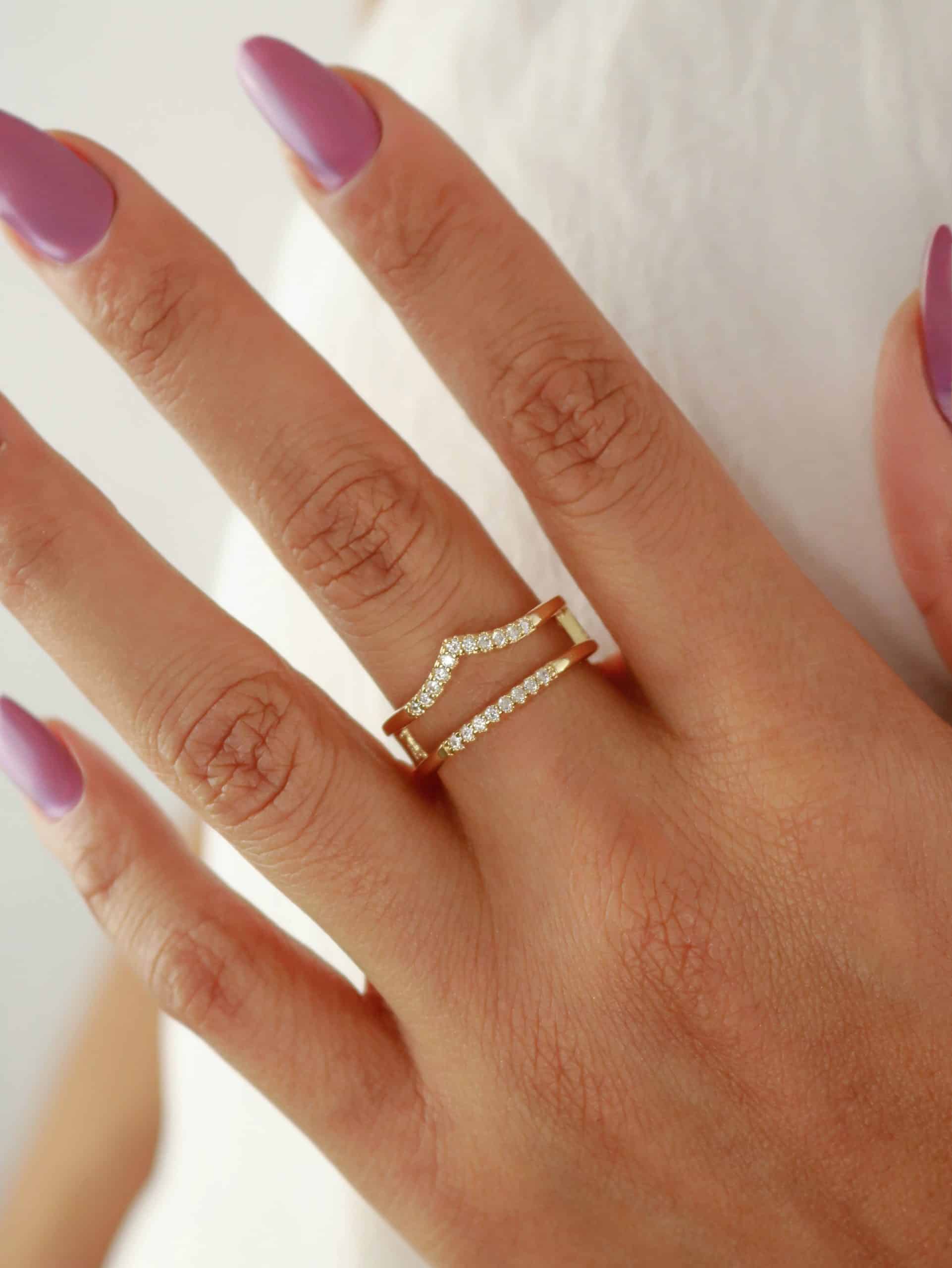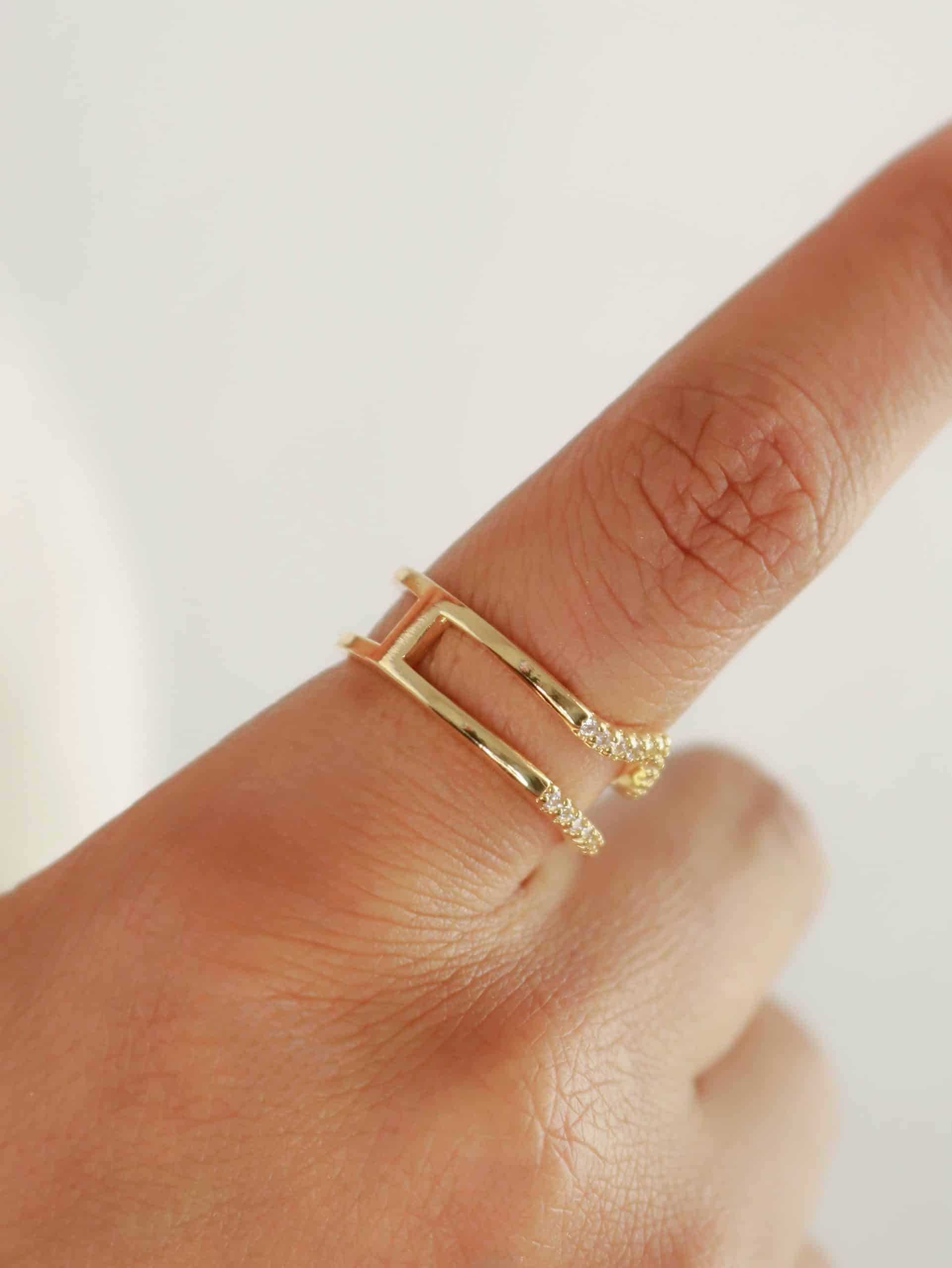 ANEL ZIRCONIA FORMATO X COM UMA FAIXA COM CINCO PONTO DE LUZ E A OUTRA TODA CRAVEJADA