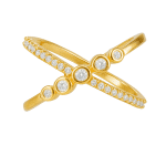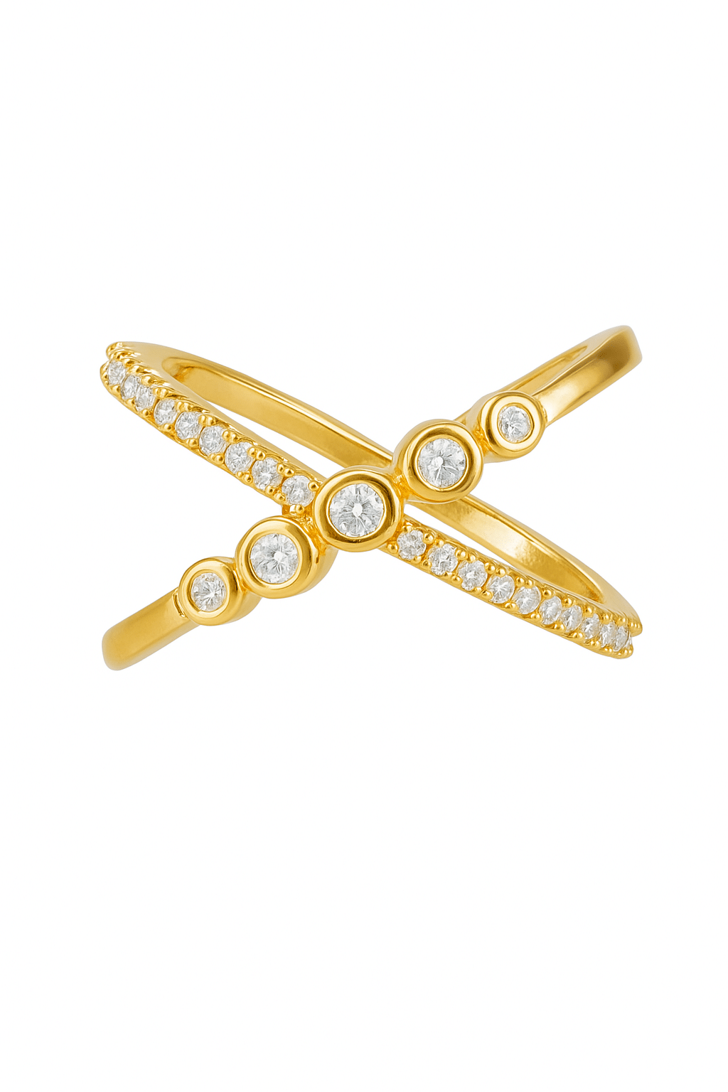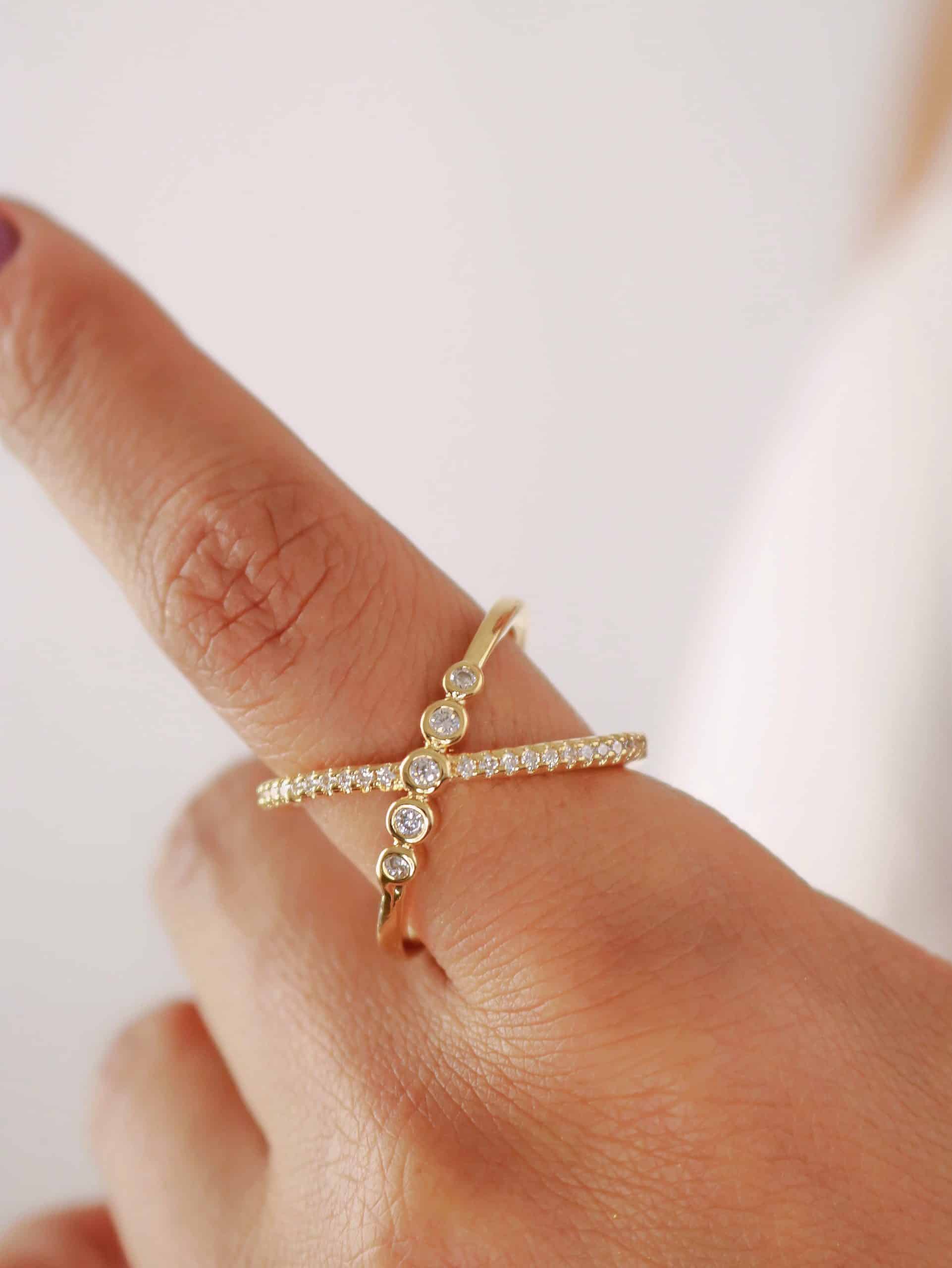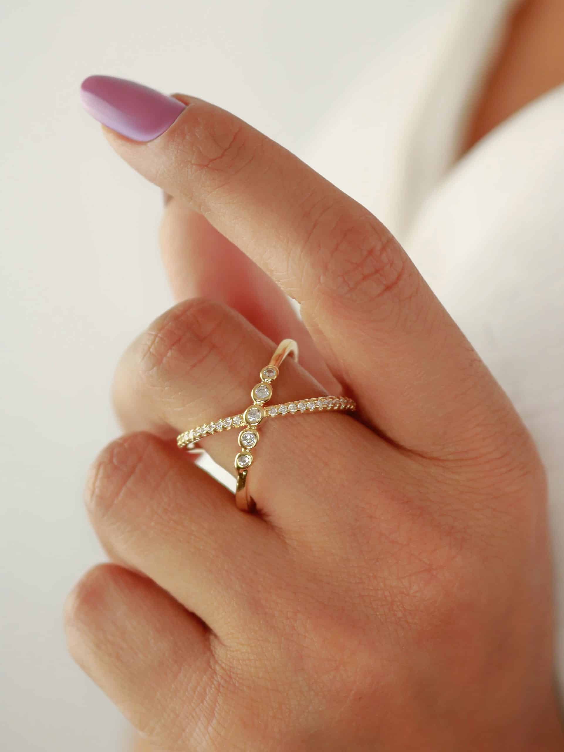 ANEL ZIRCONIA FORMATO X COM UMA FAIXA COM CINCO PONTO DE LUZ E A OUTRA TODA CRAVEJADA