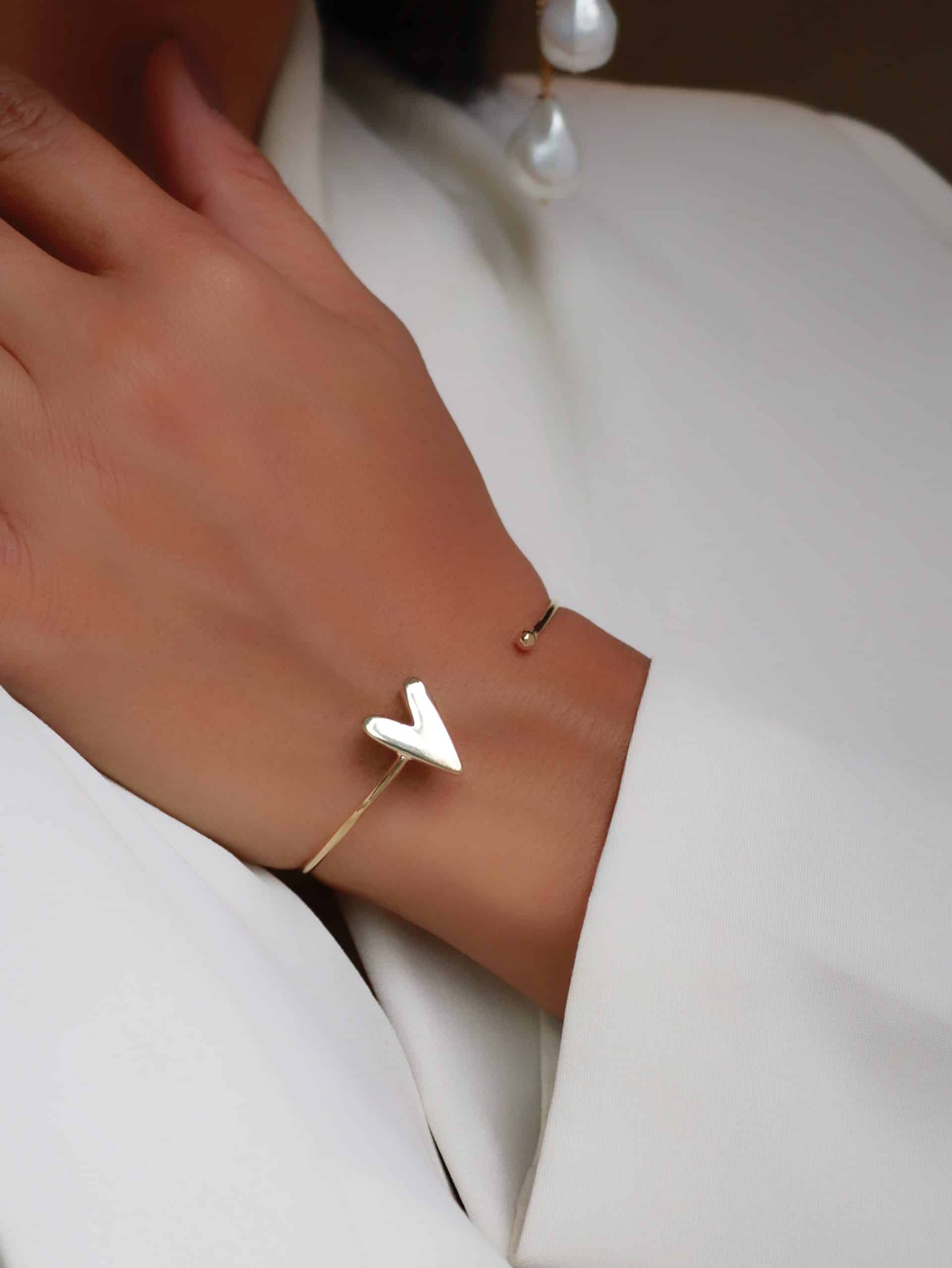 BRACELETE LISO COM CORACAO NA P0NTA E BOLINHA NA OUTRA PONTA ABERTO