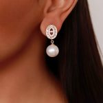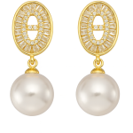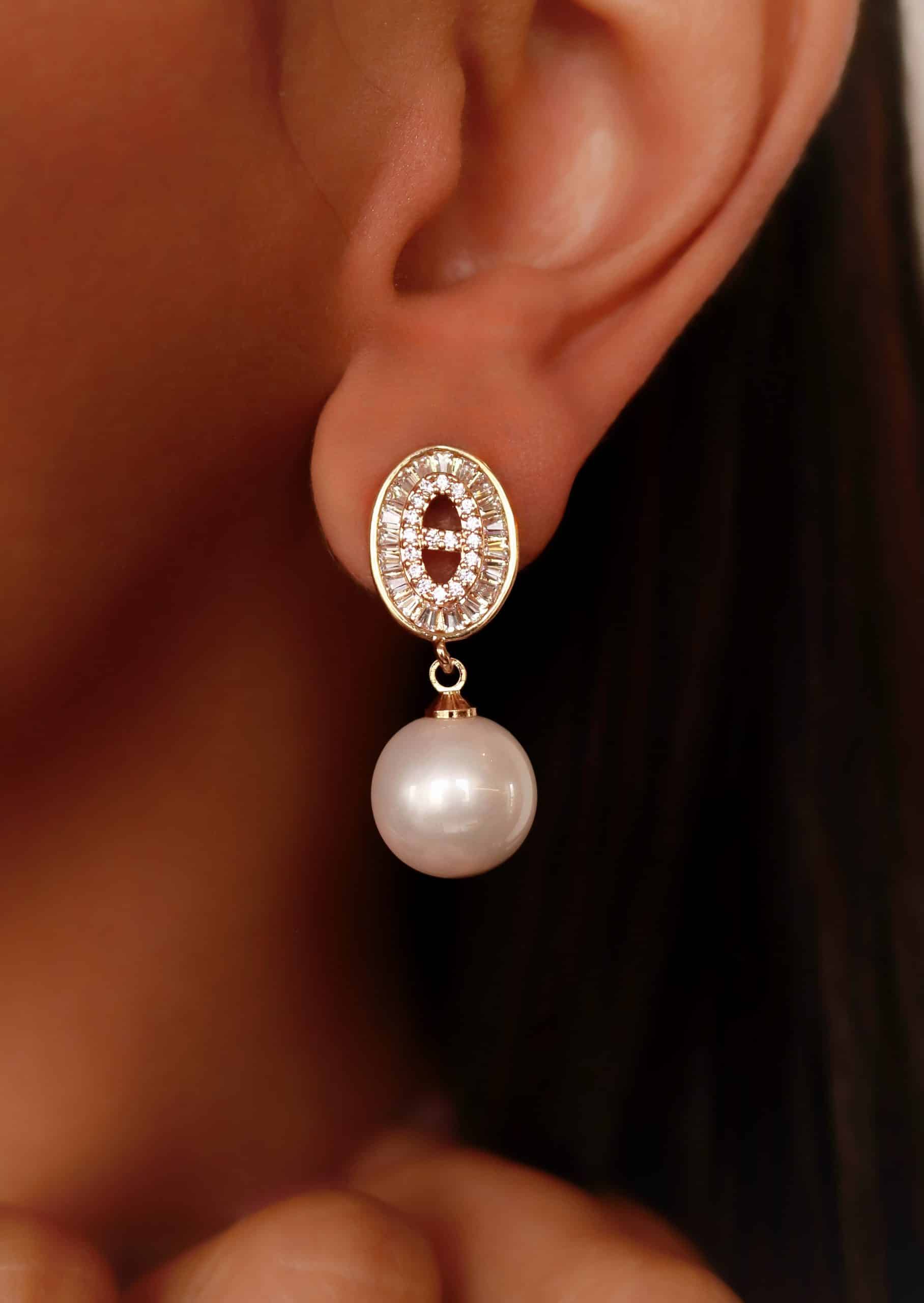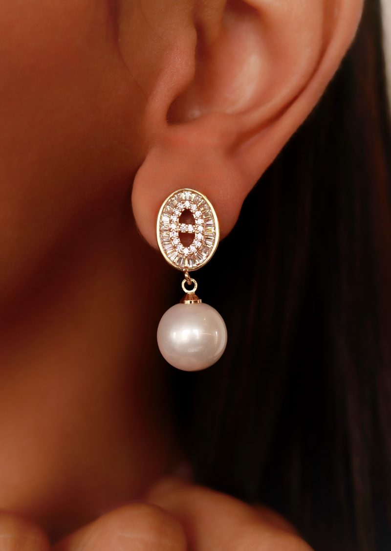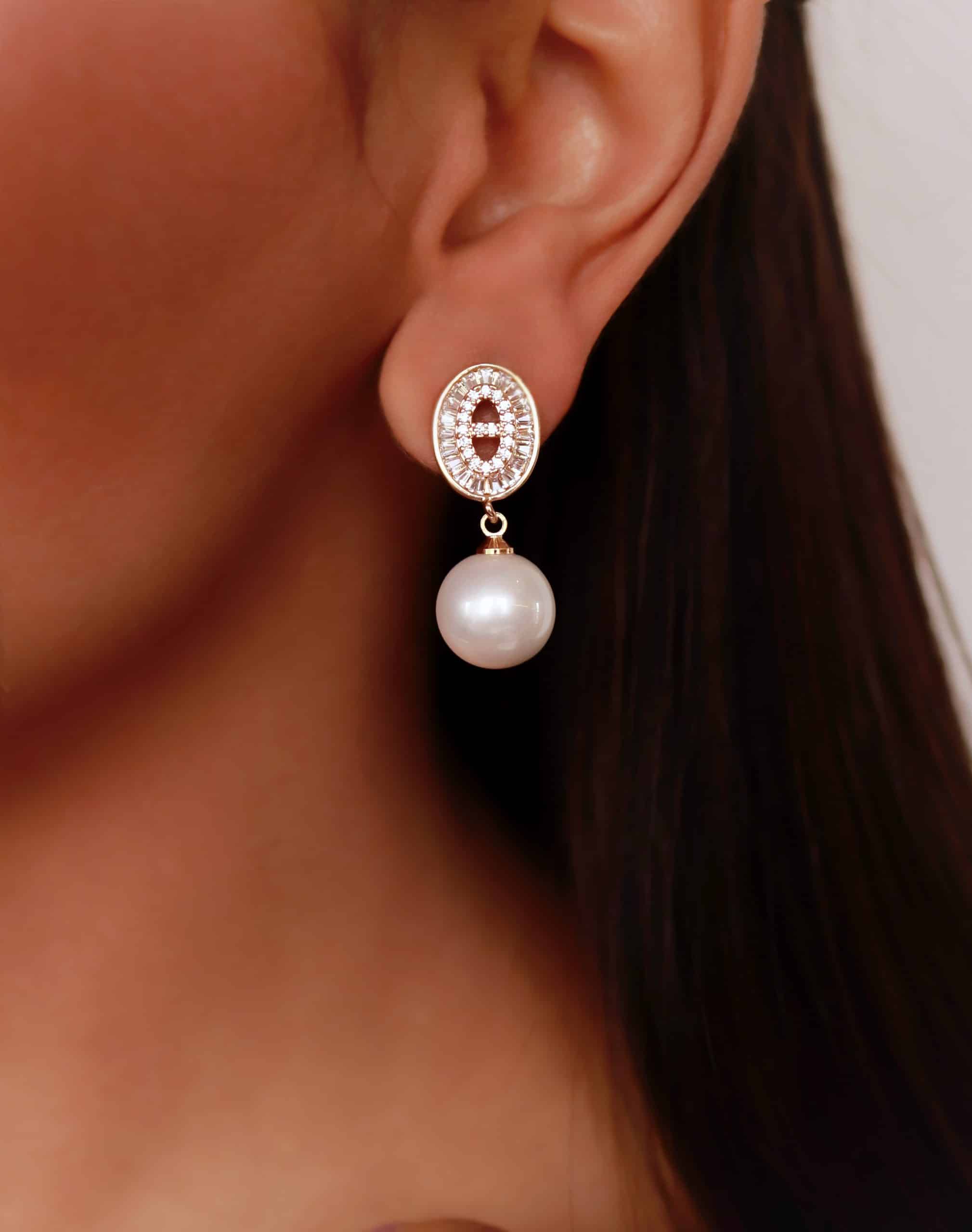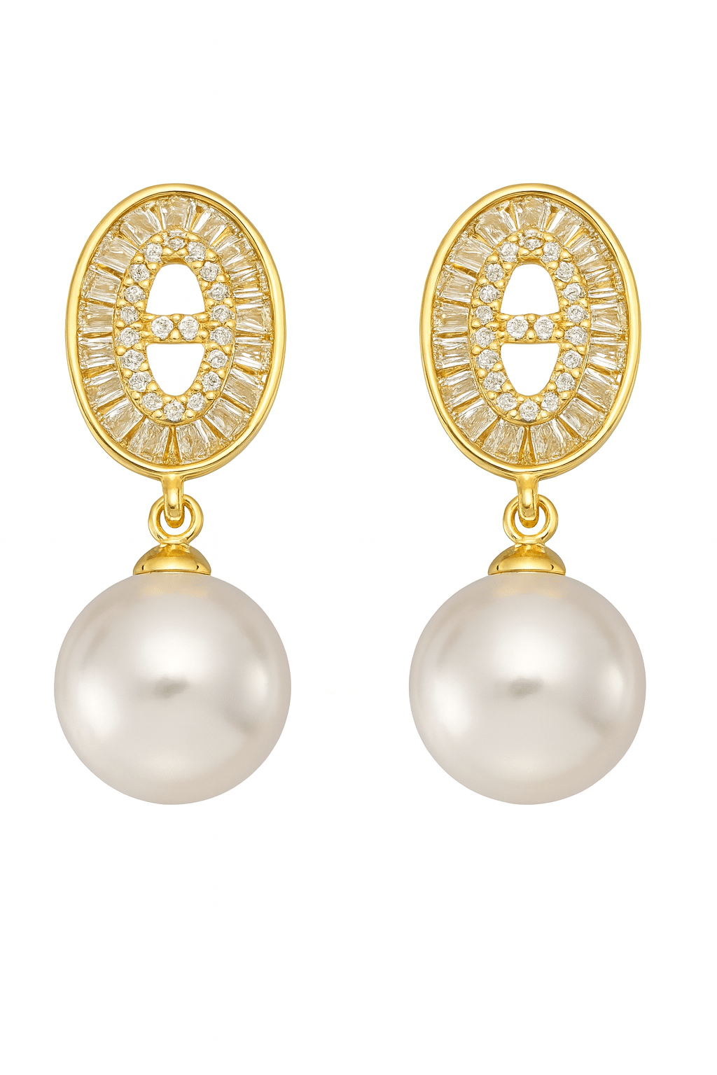 BRINCO PEROLA COM A BASE CRAVEJADA E PEROLA ACHATADA CRAVEJADA EM VOLTA PENDURADA