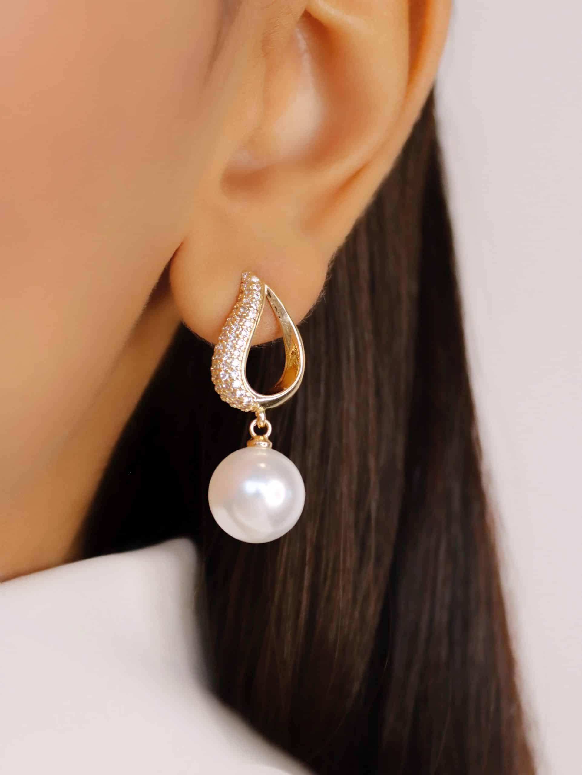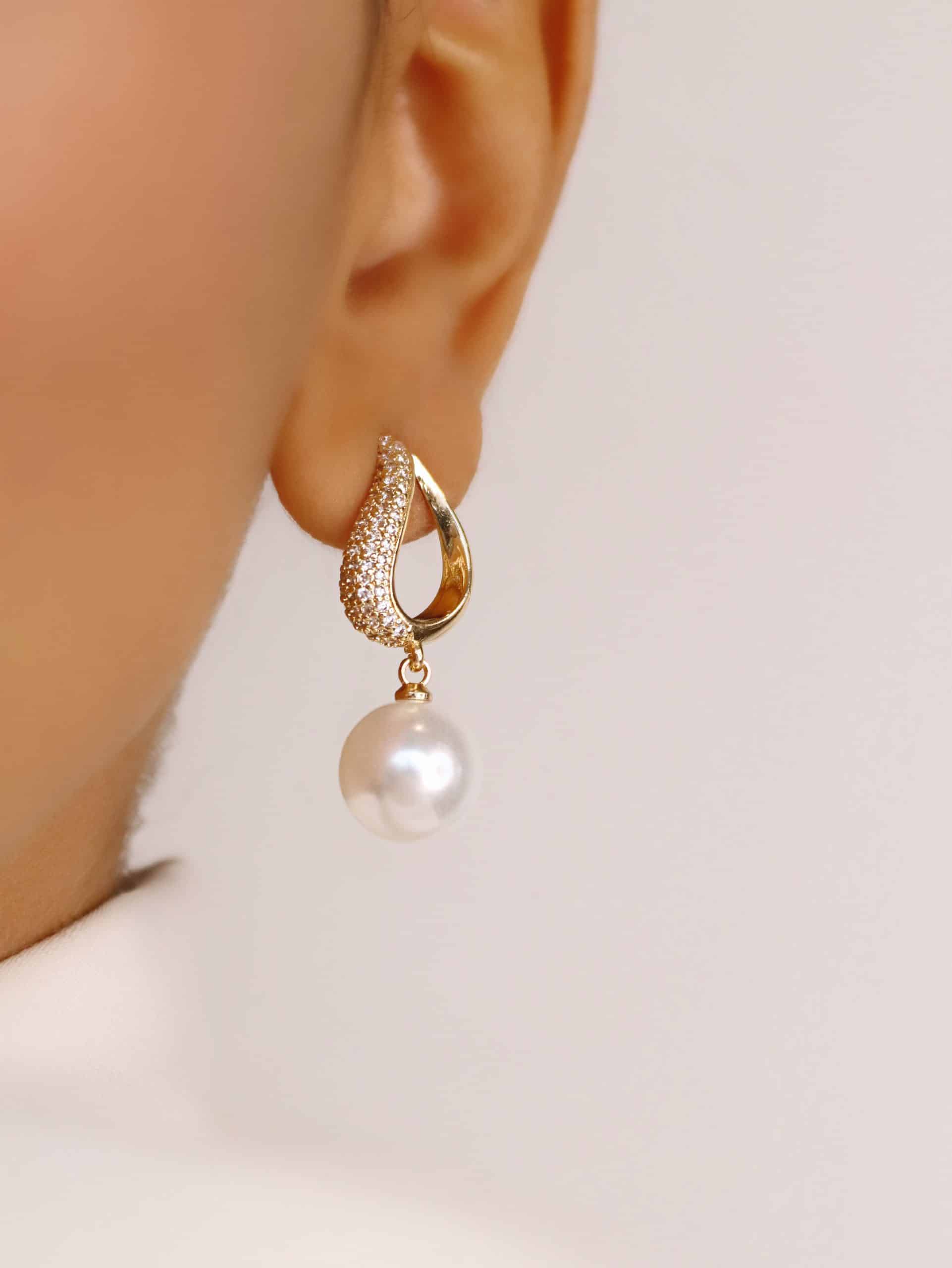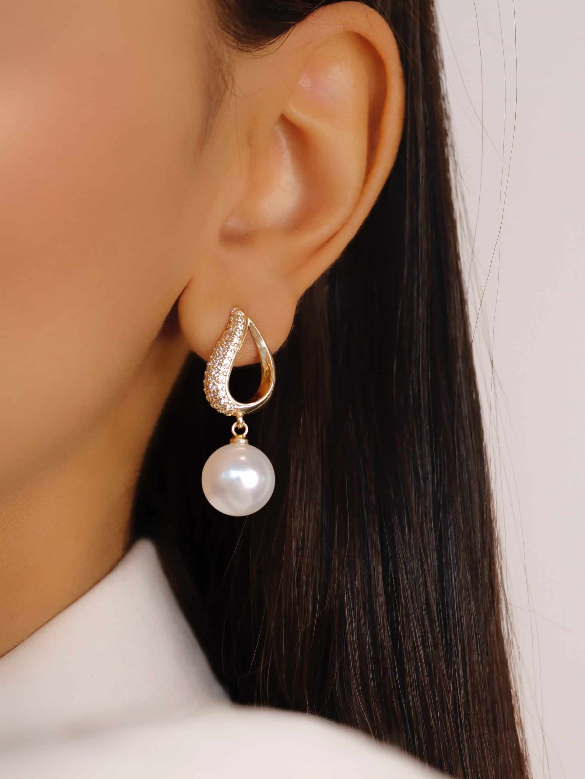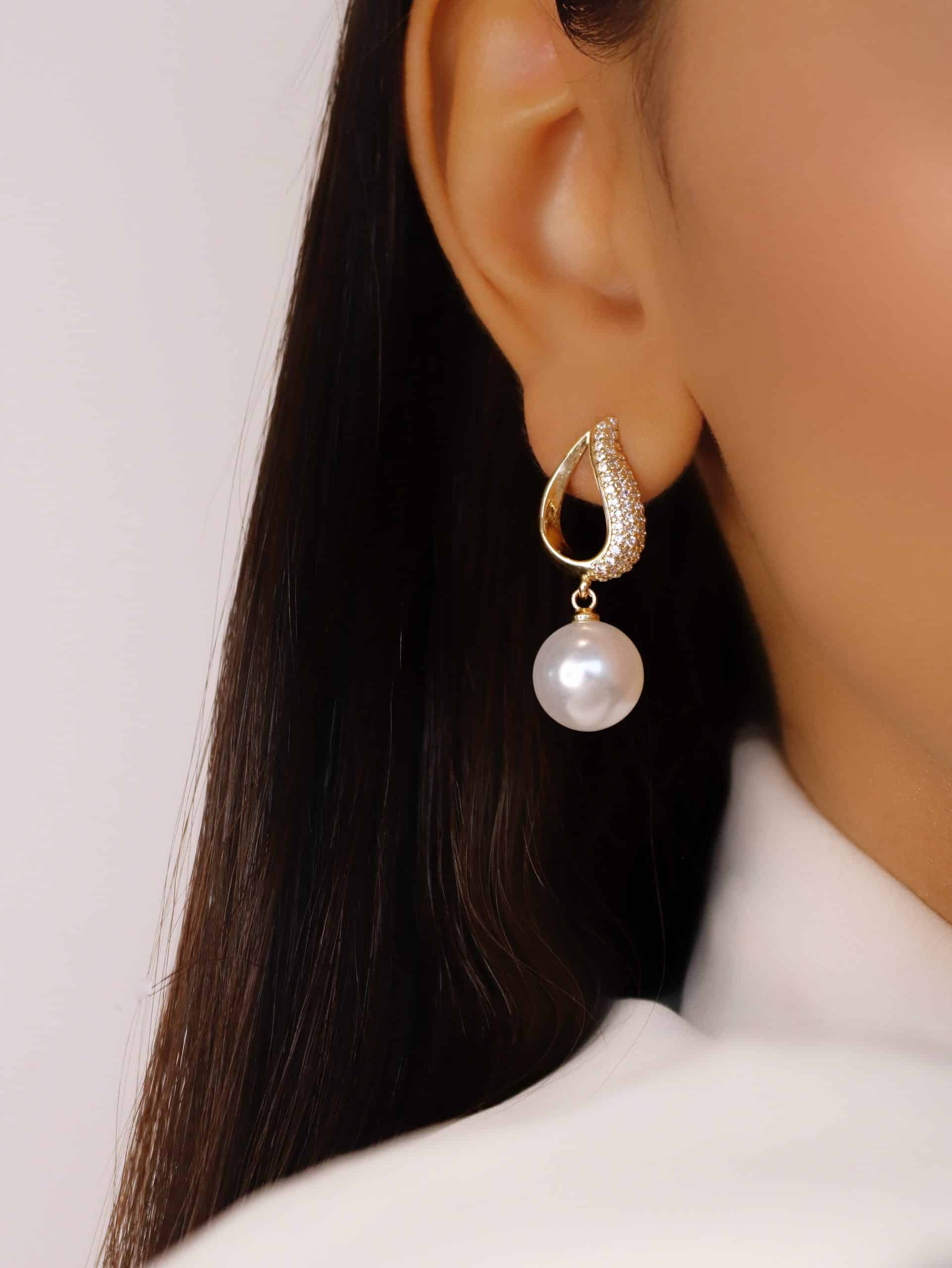 BRINCO PEROLA COM A BASE FORMATO DE GOTA CRAVEJADA E LISA E PEROLA PENDURADA 42.0 MM