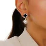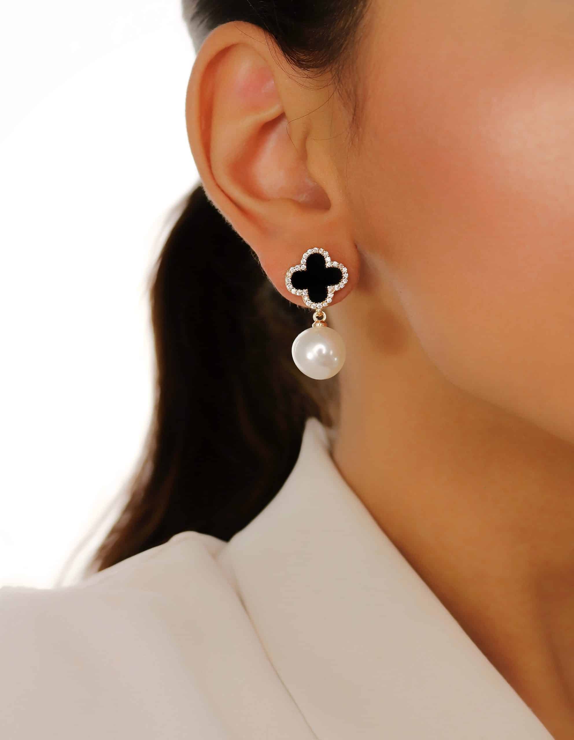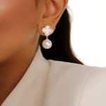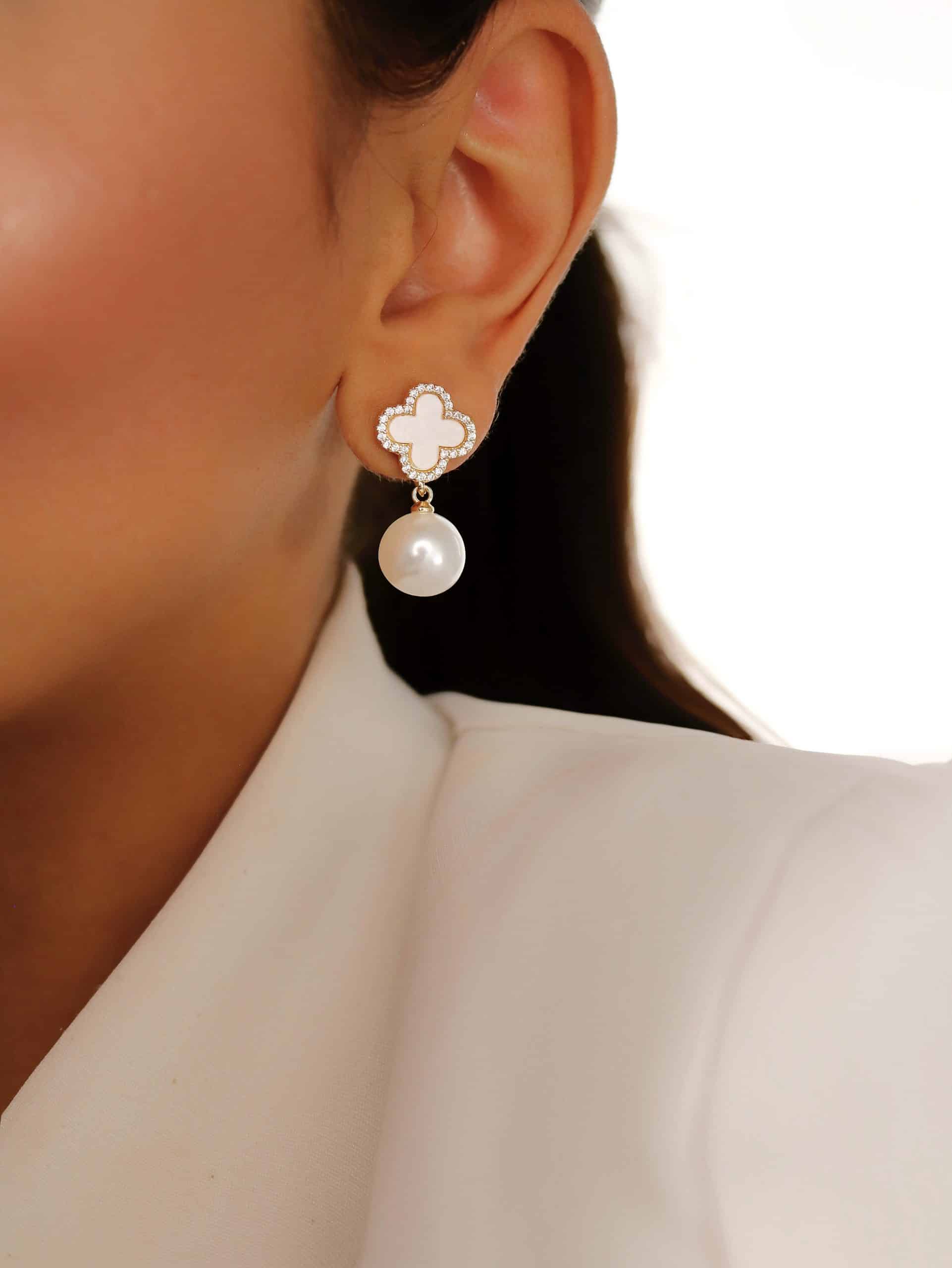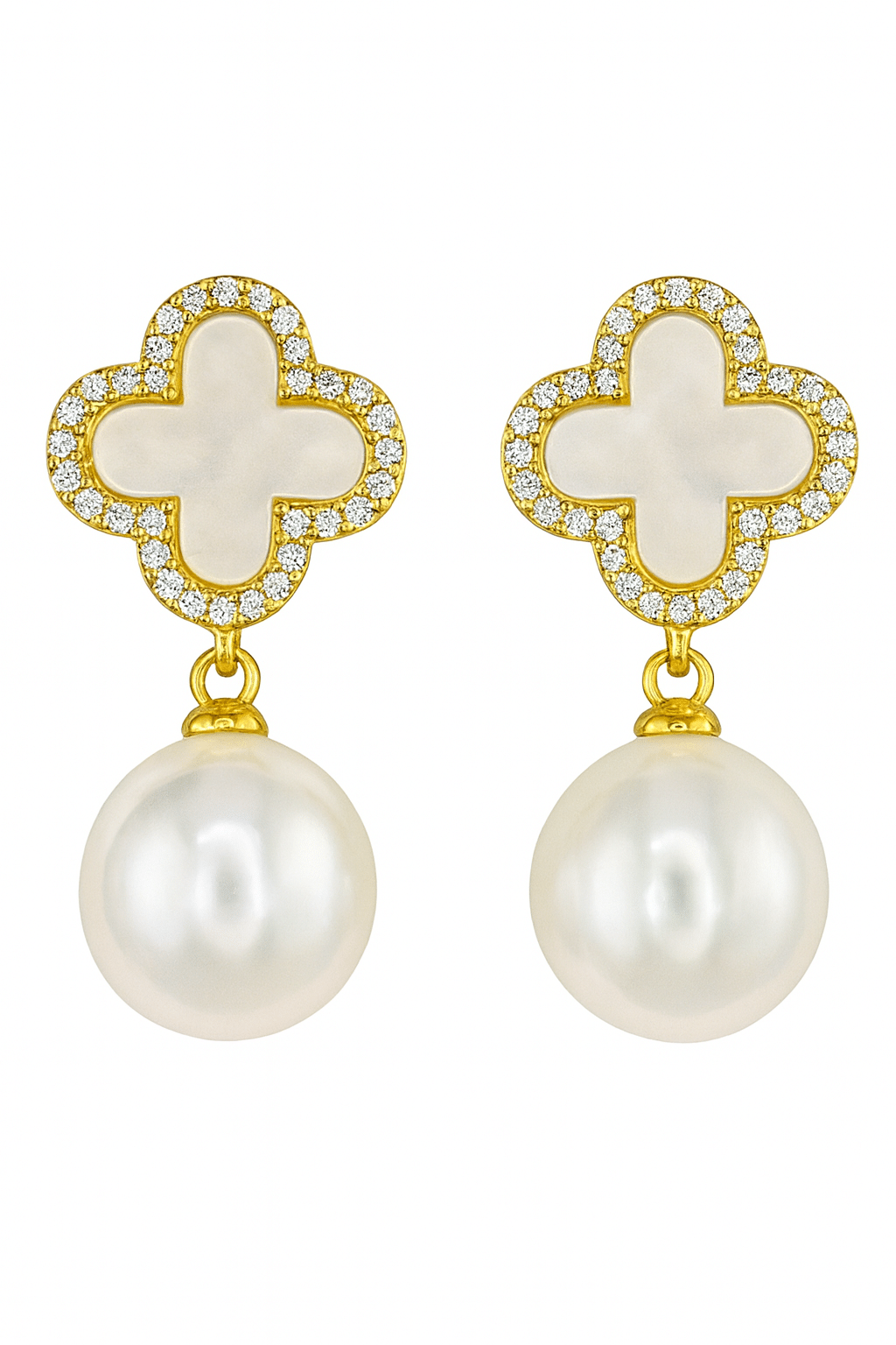 BRINCO PEROLA FLOR CRAVEJADA EM VOLTA E PEROLA PENDURADA CORES 26.0 MM