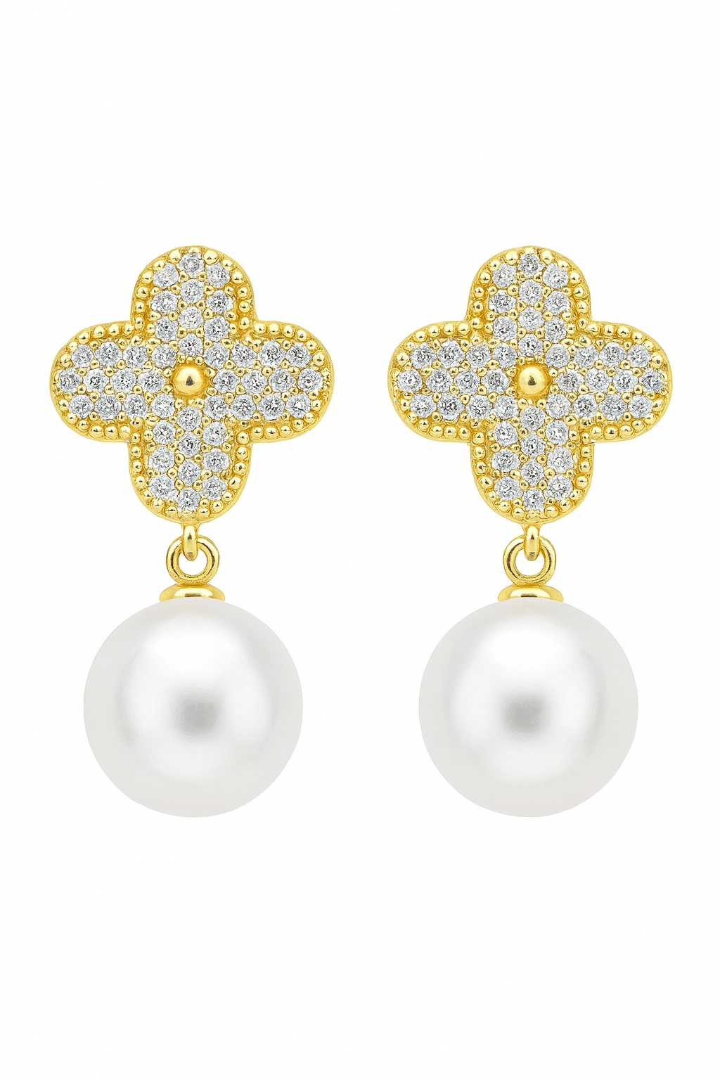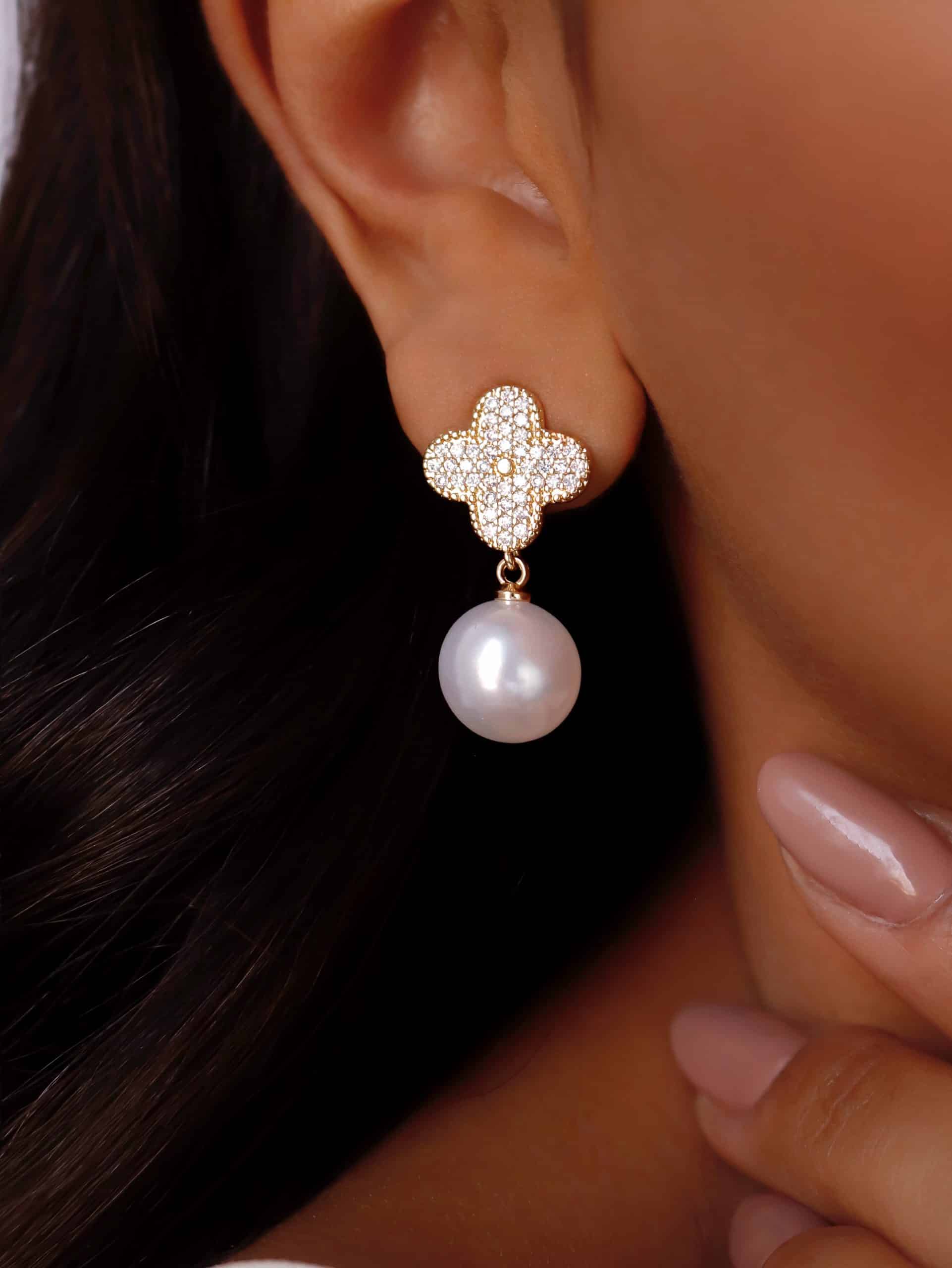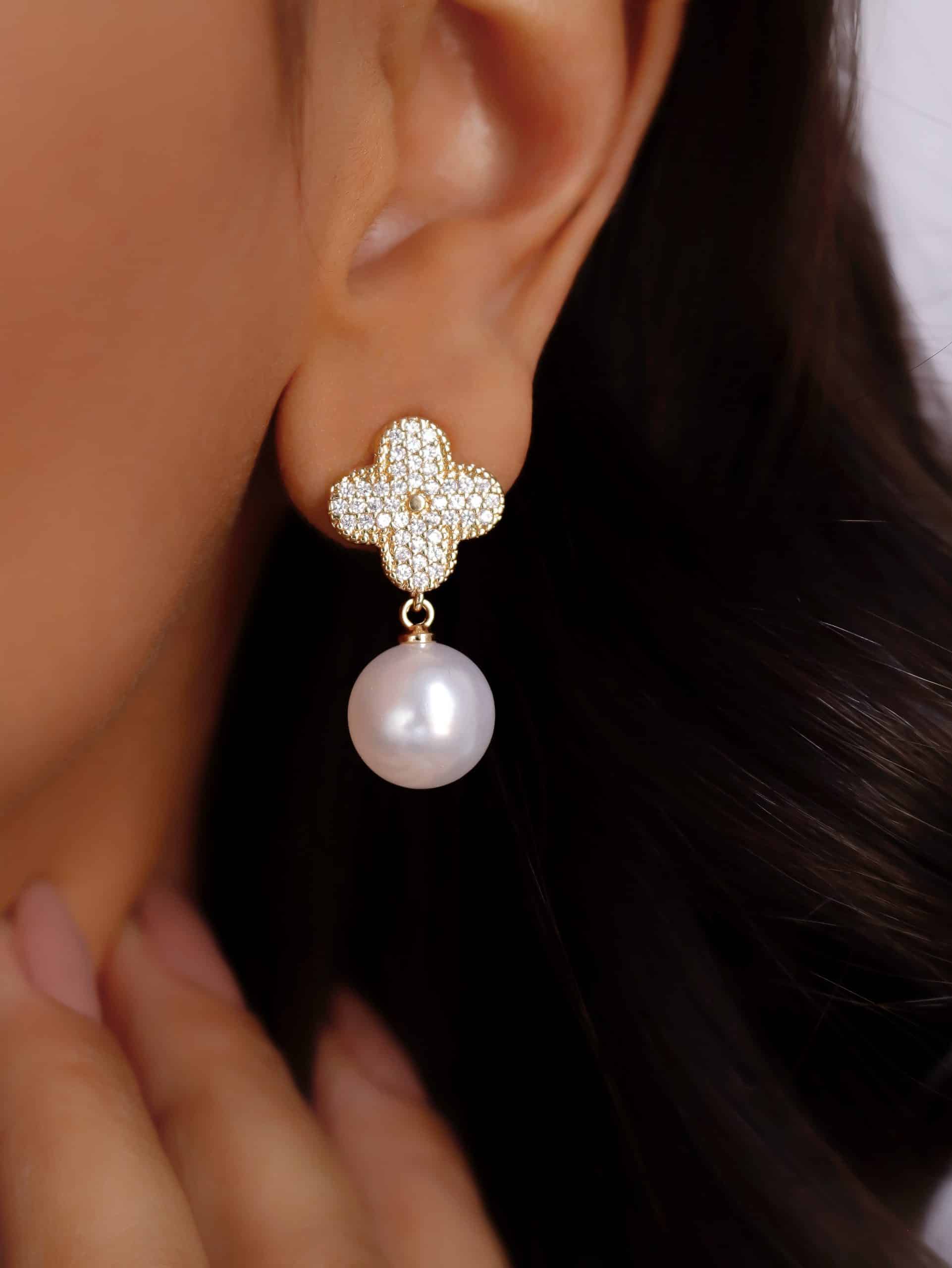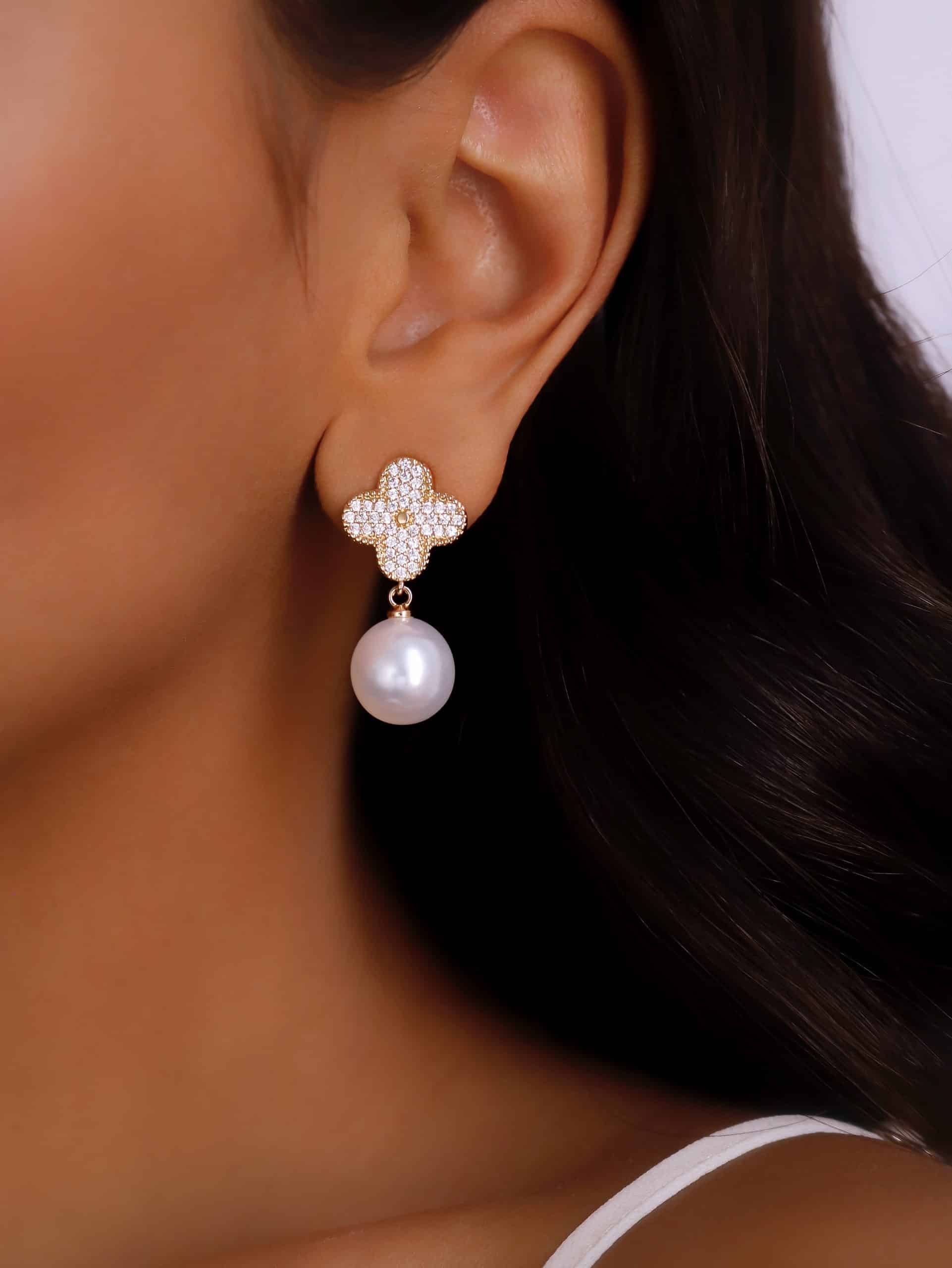 BRINCO PEROLA FLOR TODA CRAVEJADA COM PEROLA PENDURADA