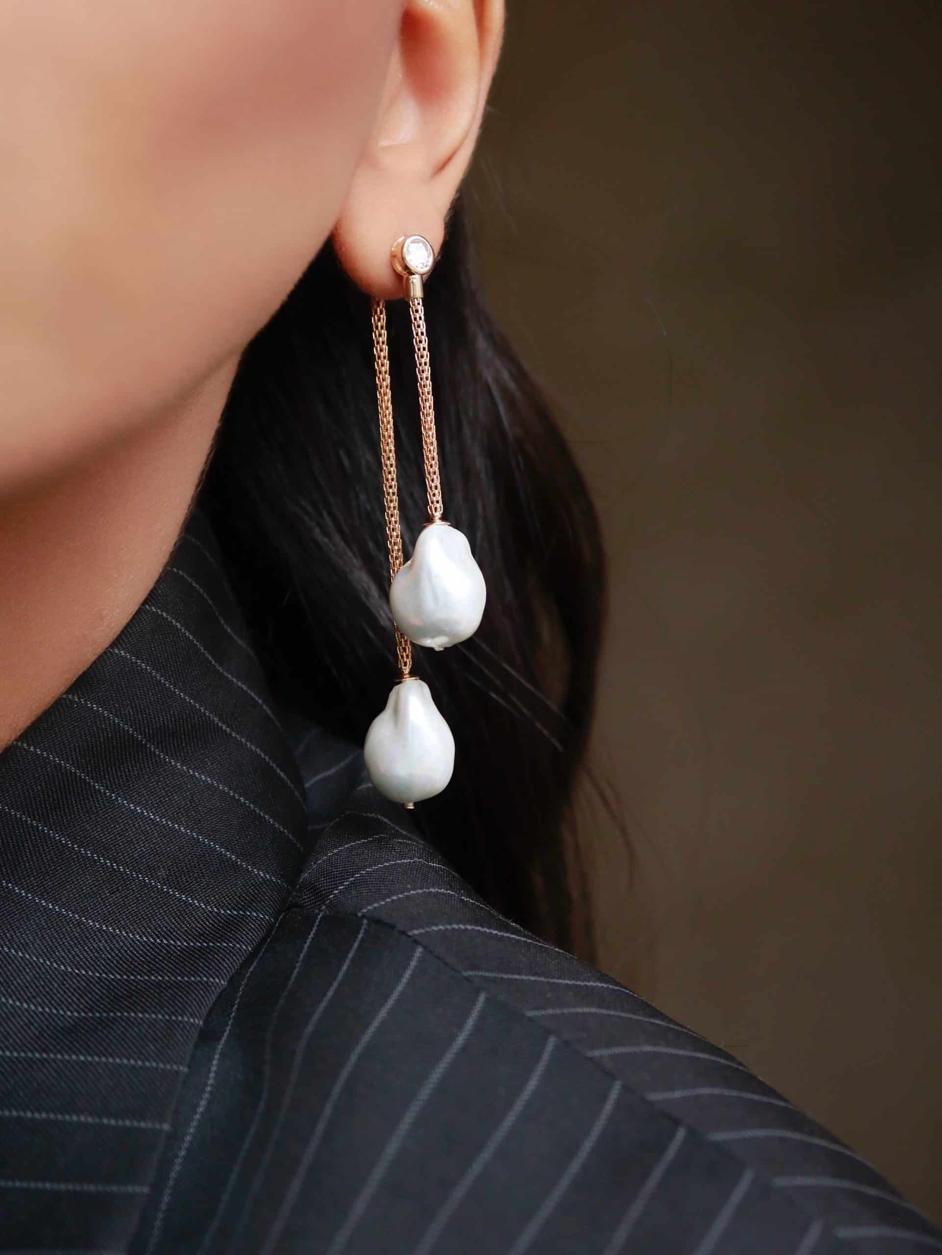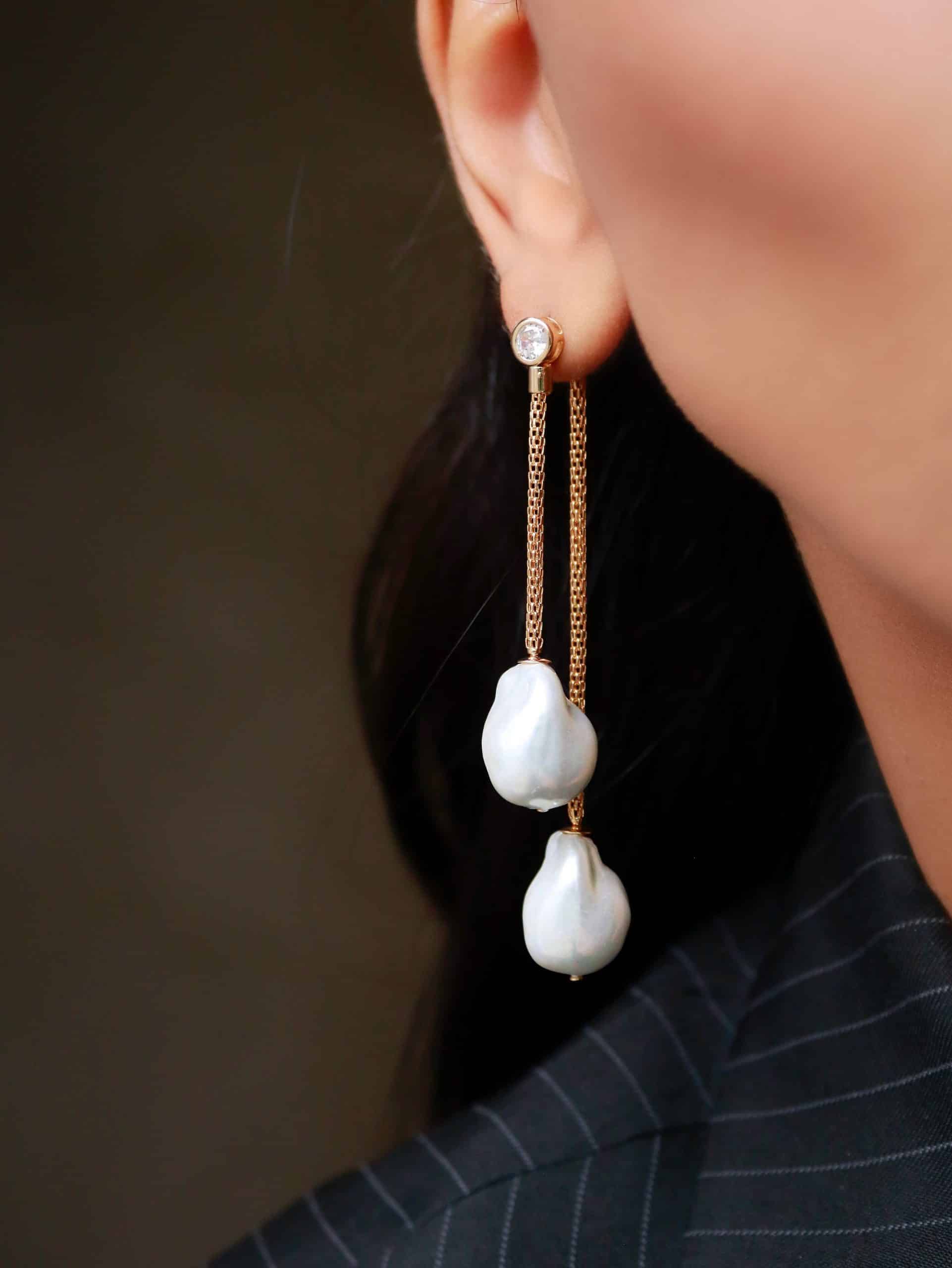 BRINCO PEROLA COM A BASE ONDULADA E COM CANUTILHO E PEROLA NA PONTA LONGO
