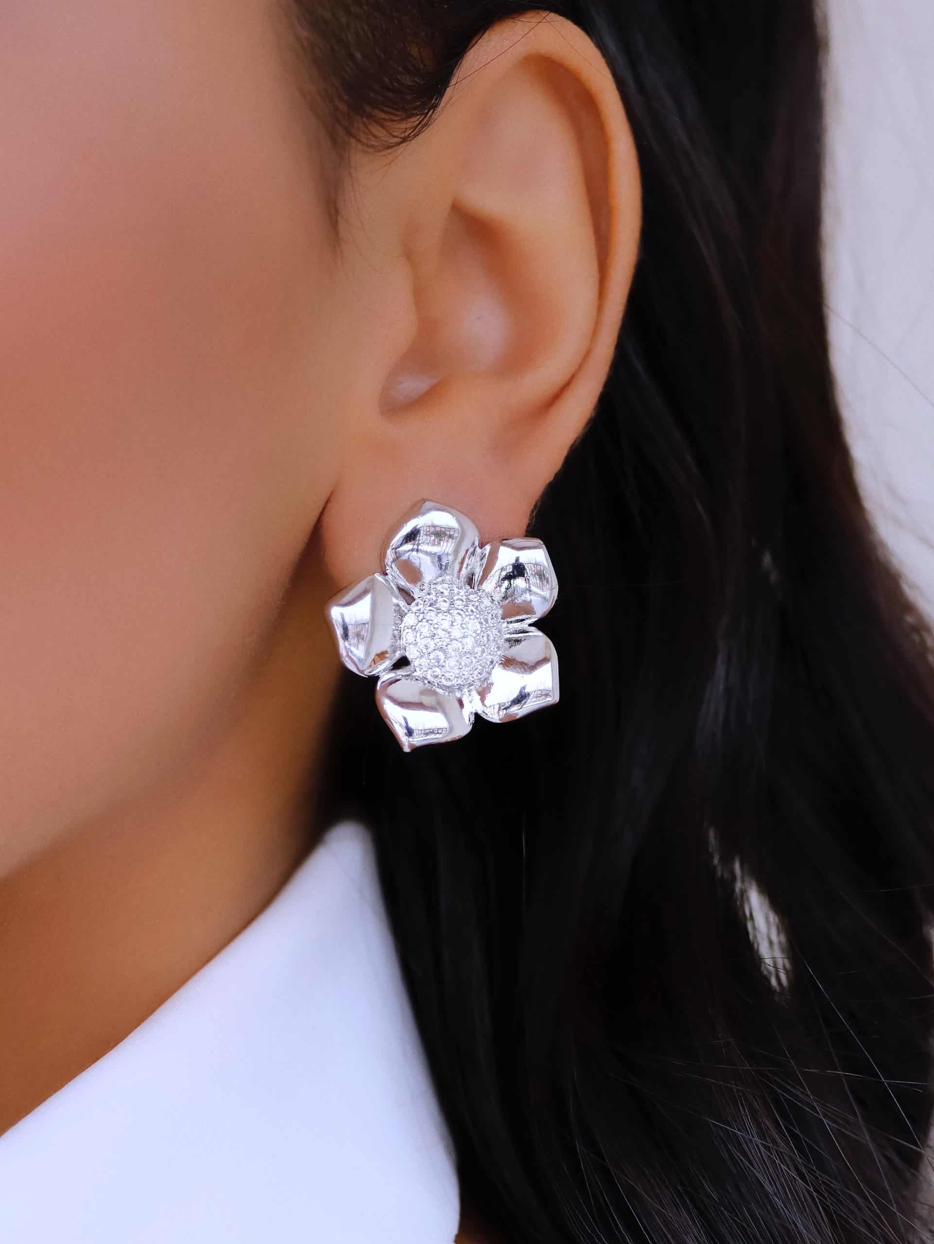 BRINCO ZIRCONIA FLOR COM AS CINCO PETALAS LISAS E O MIOLO CRAVEJADO 24.8MM