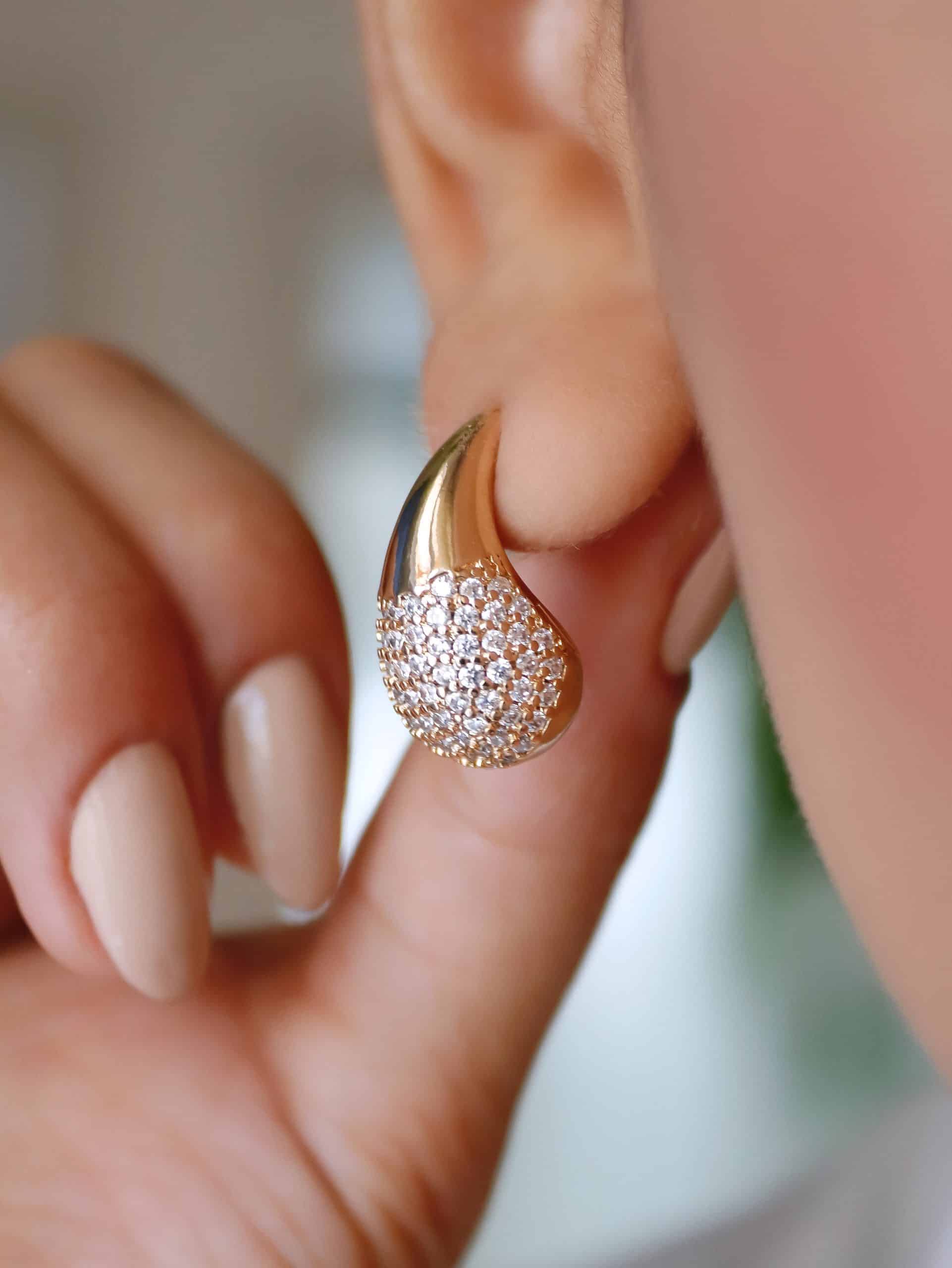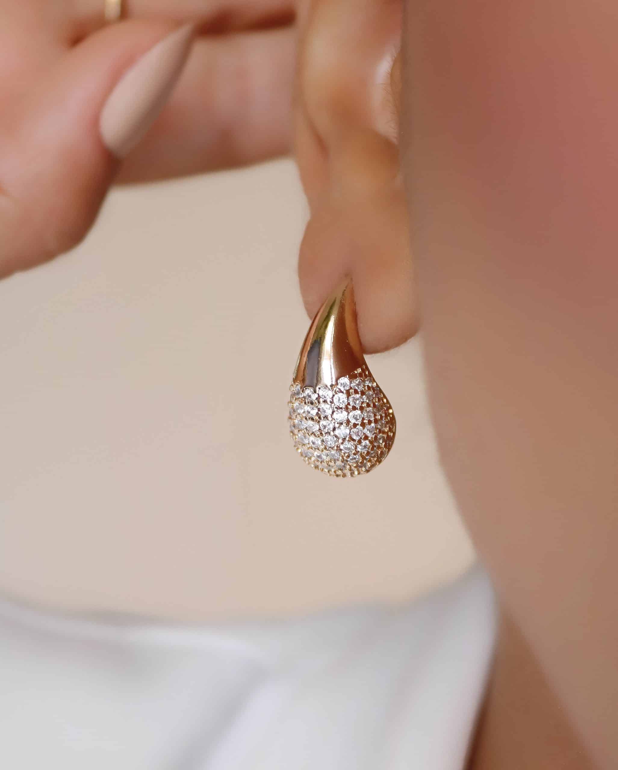 BRINCO ZIRCONIA GOTA CRAVEJADA DETALHE GOTINHA VAZADA