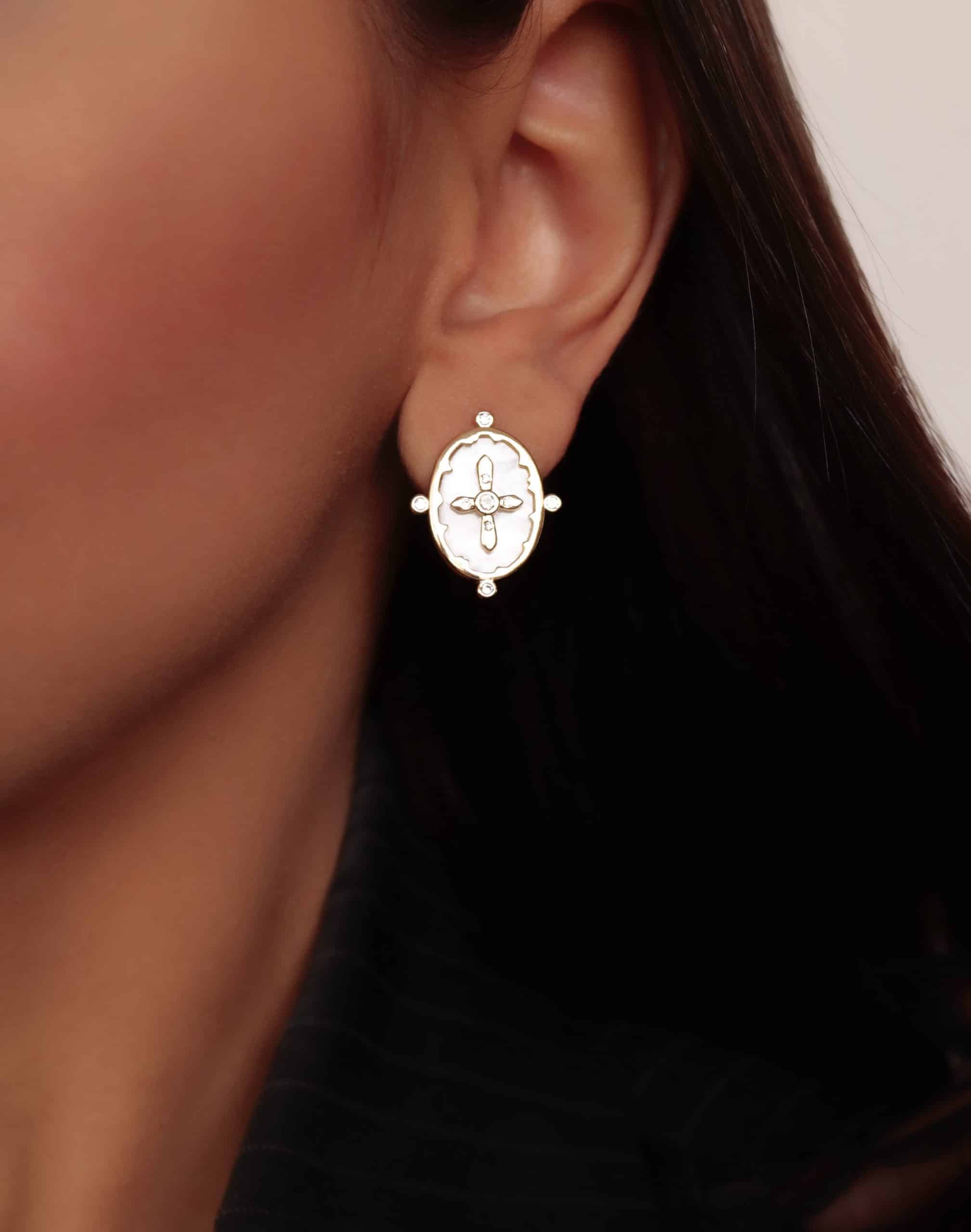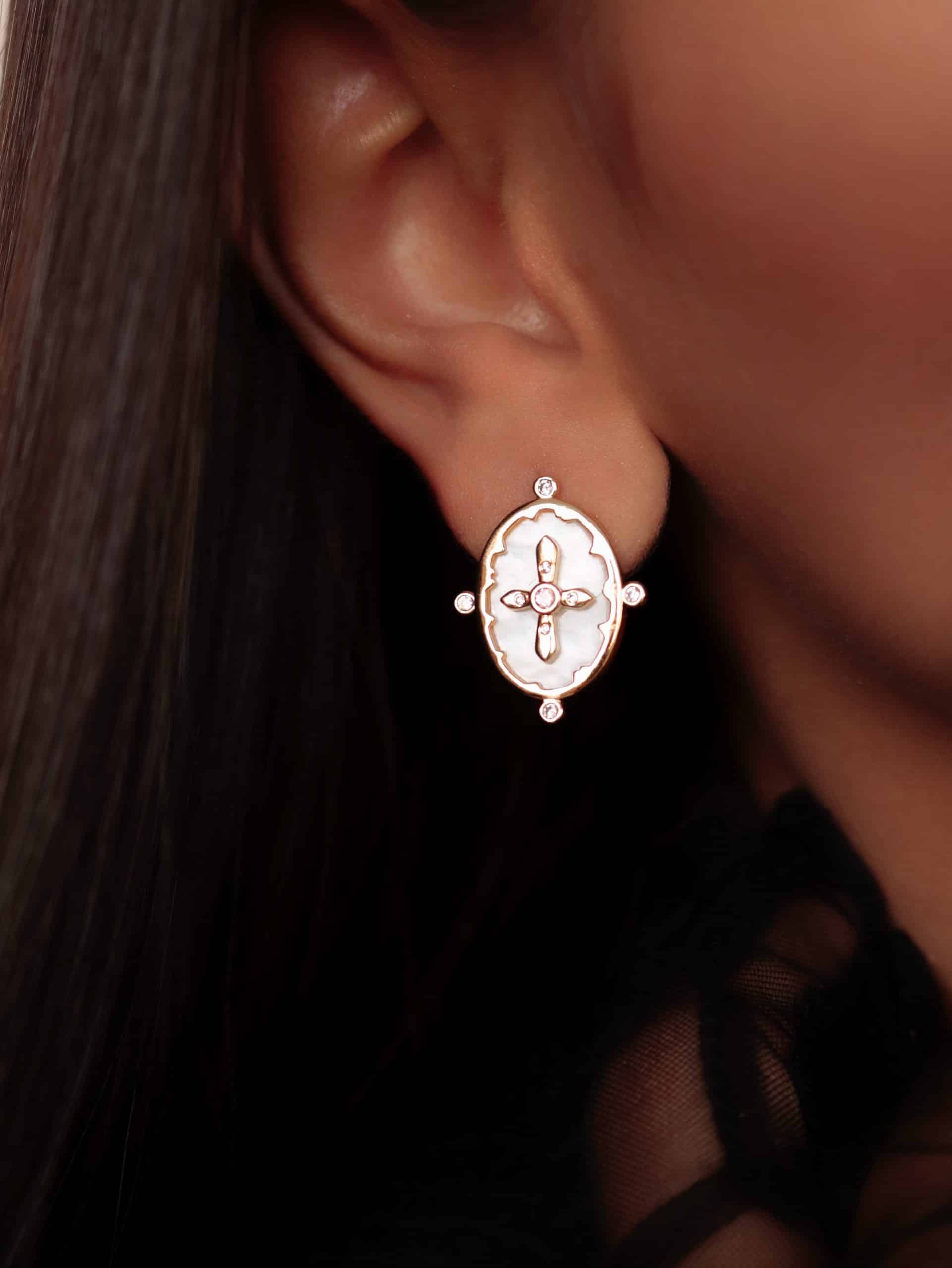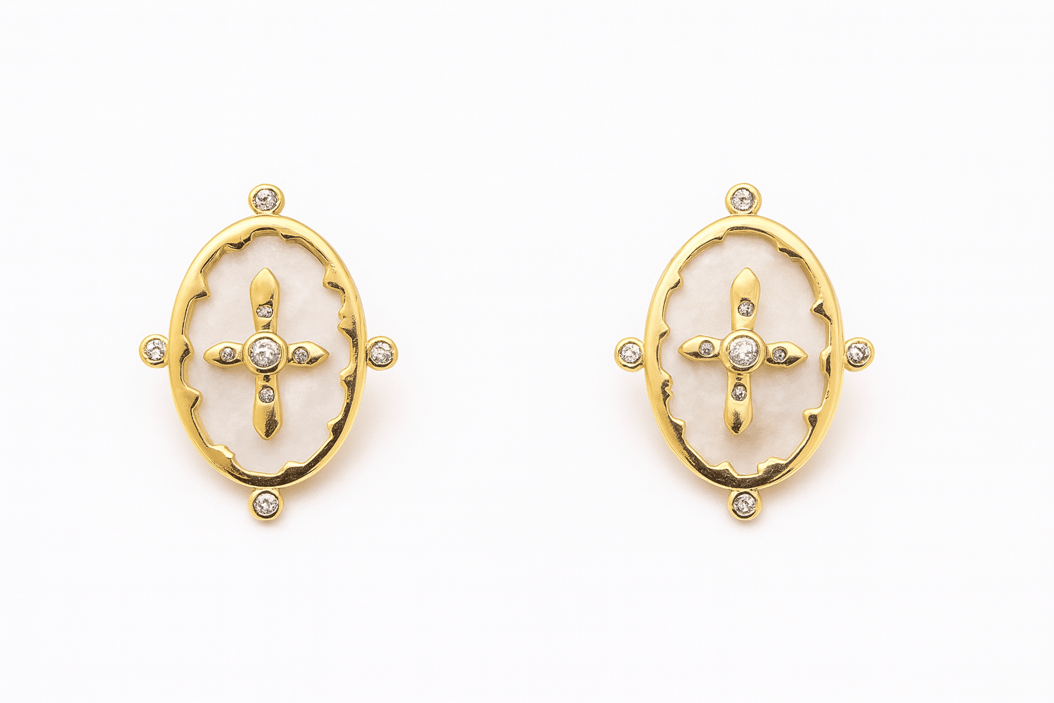 BRINCO ZIRCONIA MEDALHA RESINA OVAL COM UMA CRUZ COM PONTOS DE ZIRCONIAS