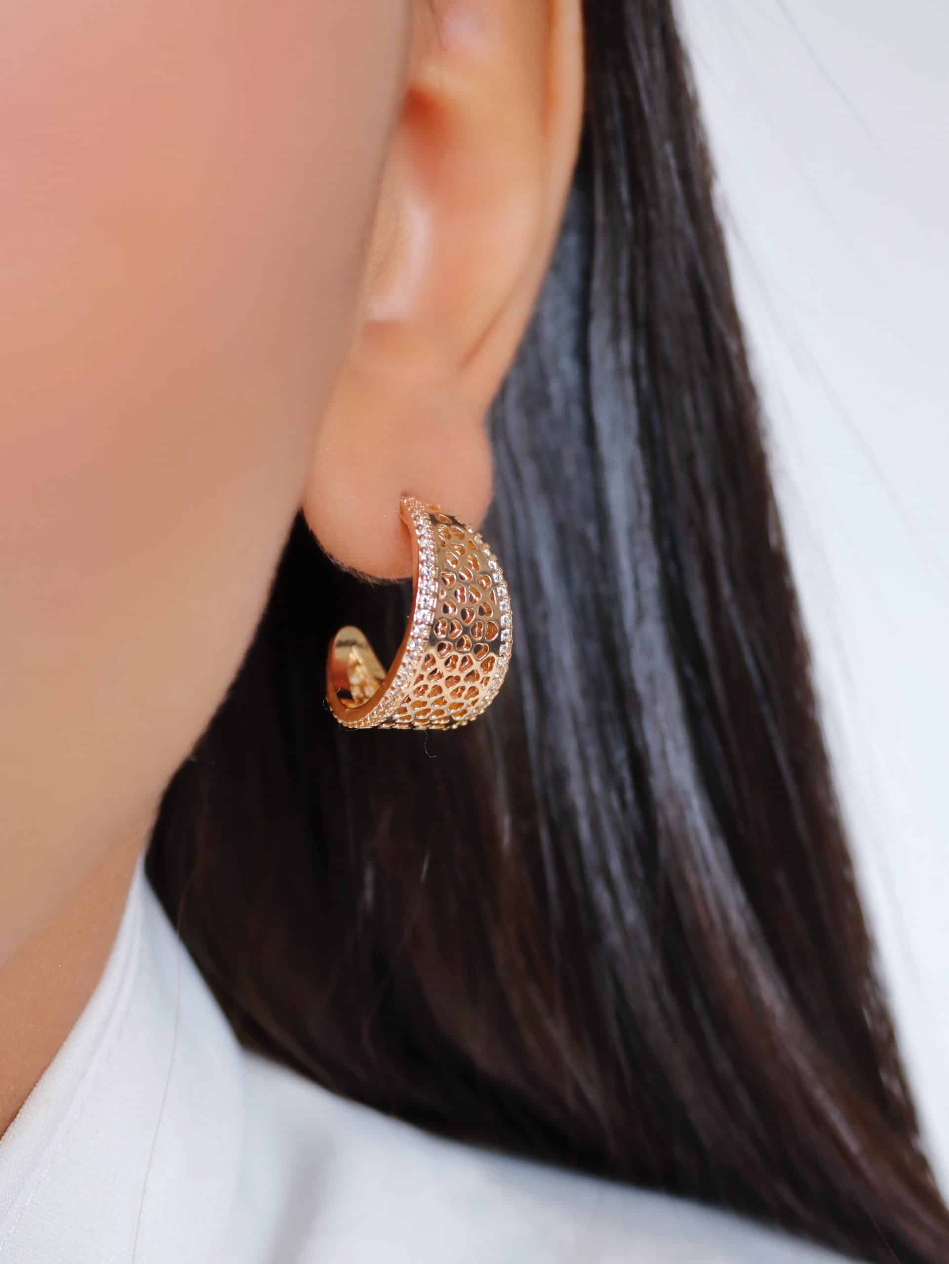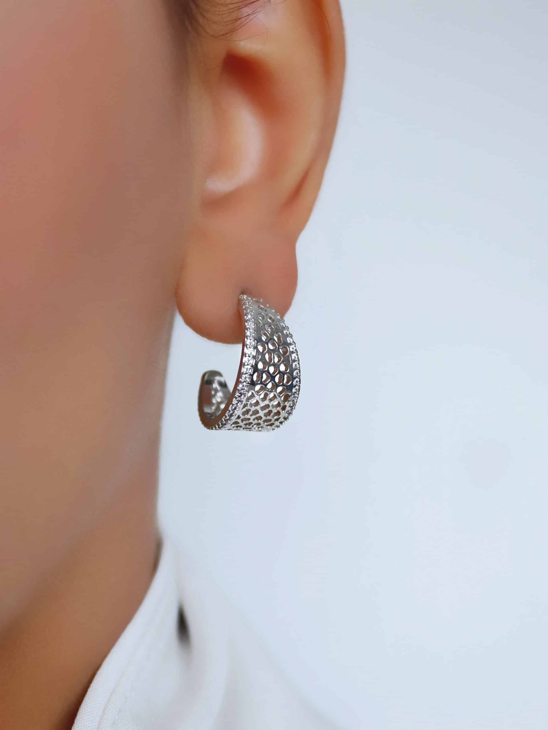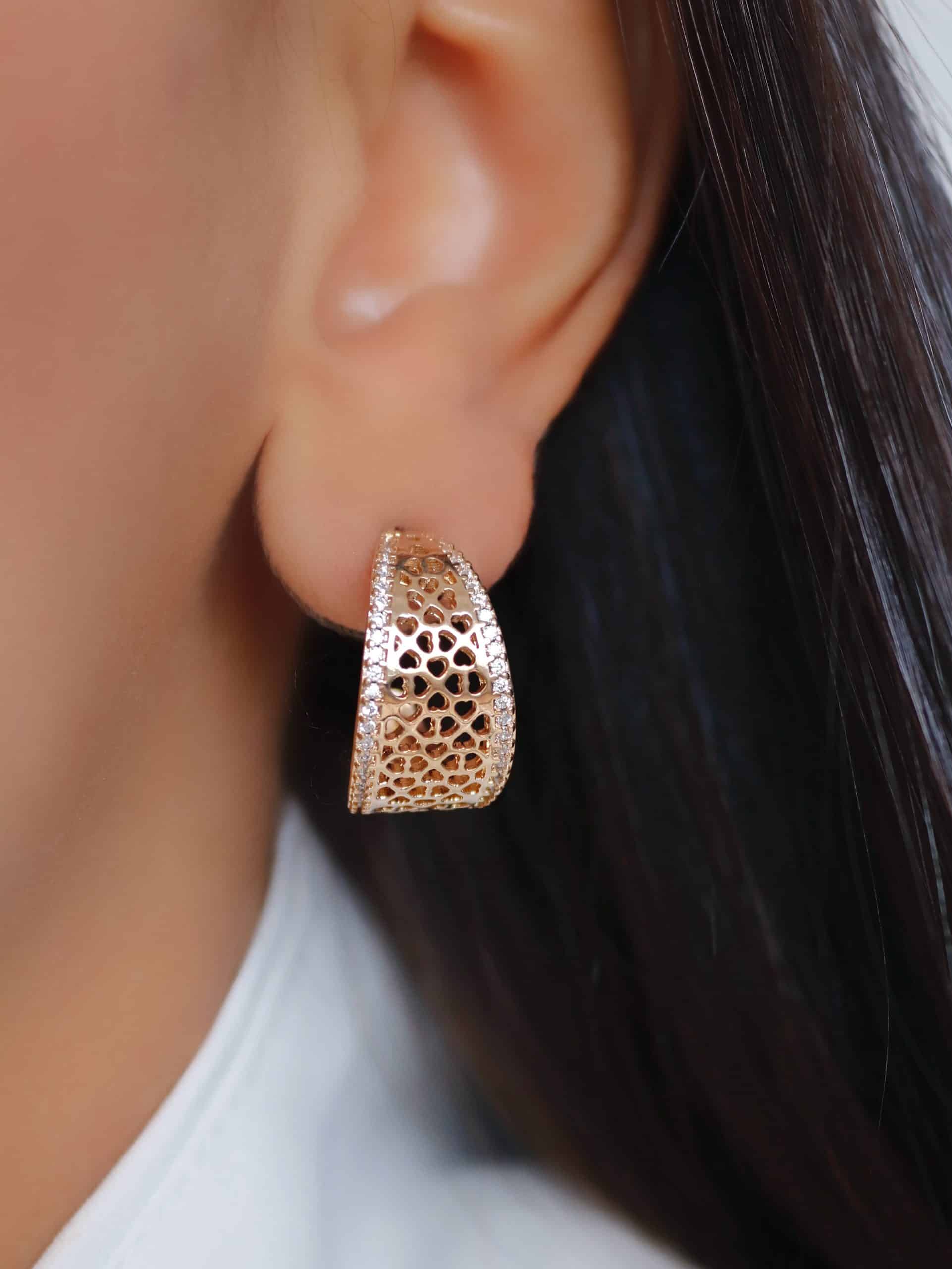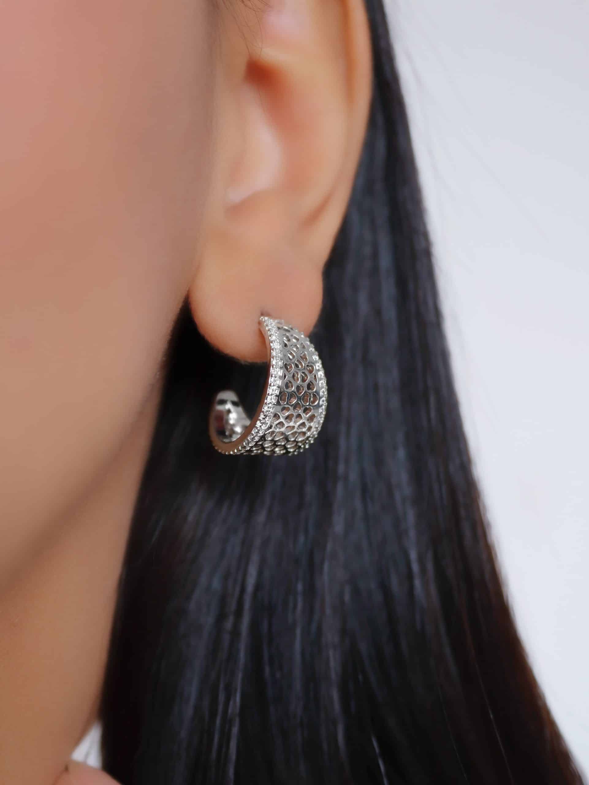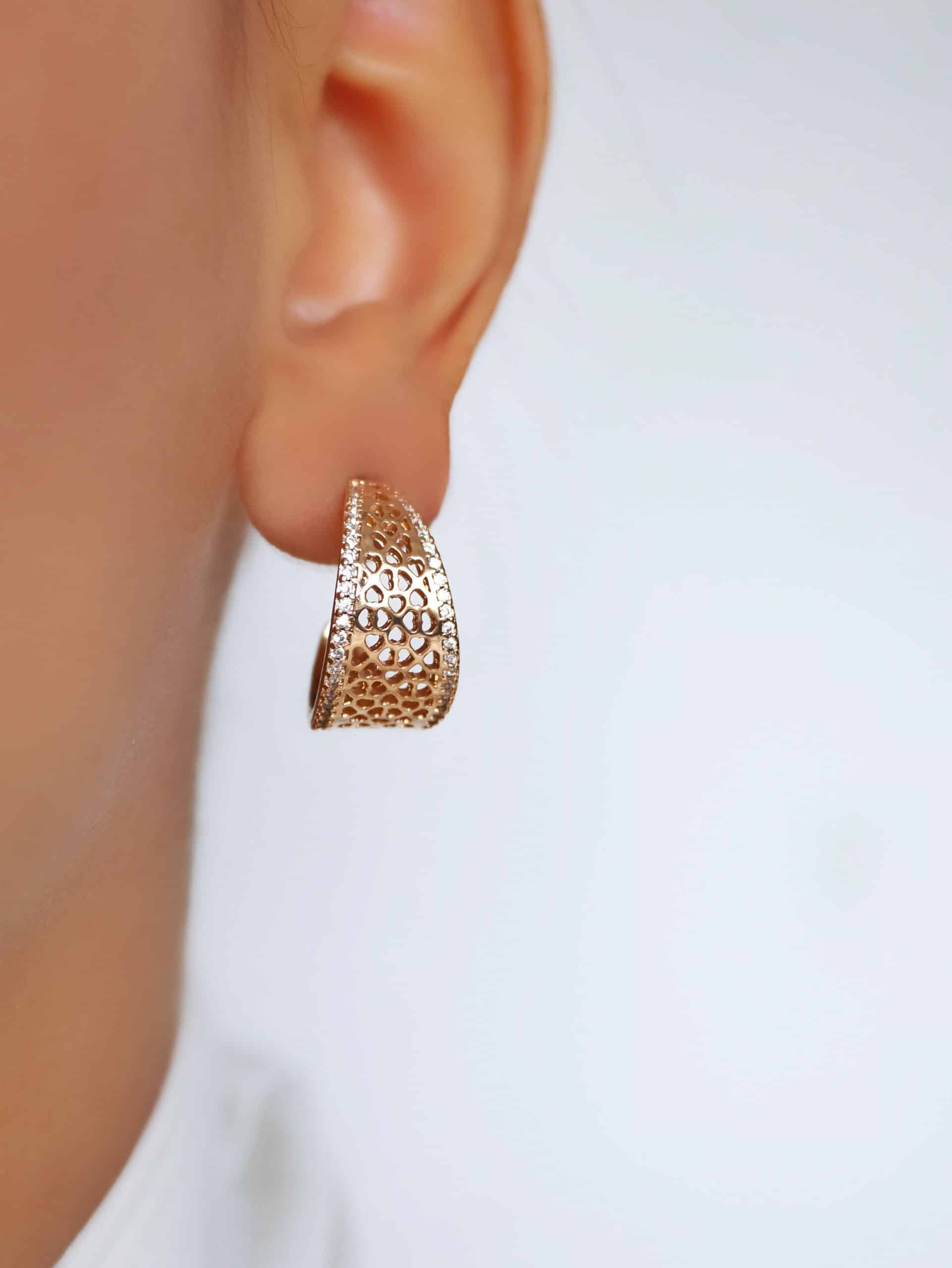 BRINCO ZIRCONIA MEIA ARGOLA CRAVEJADO NAS LATERAIS COM DETALHES LISOS VAZADOS NO MEIO FORMATO CORACAO