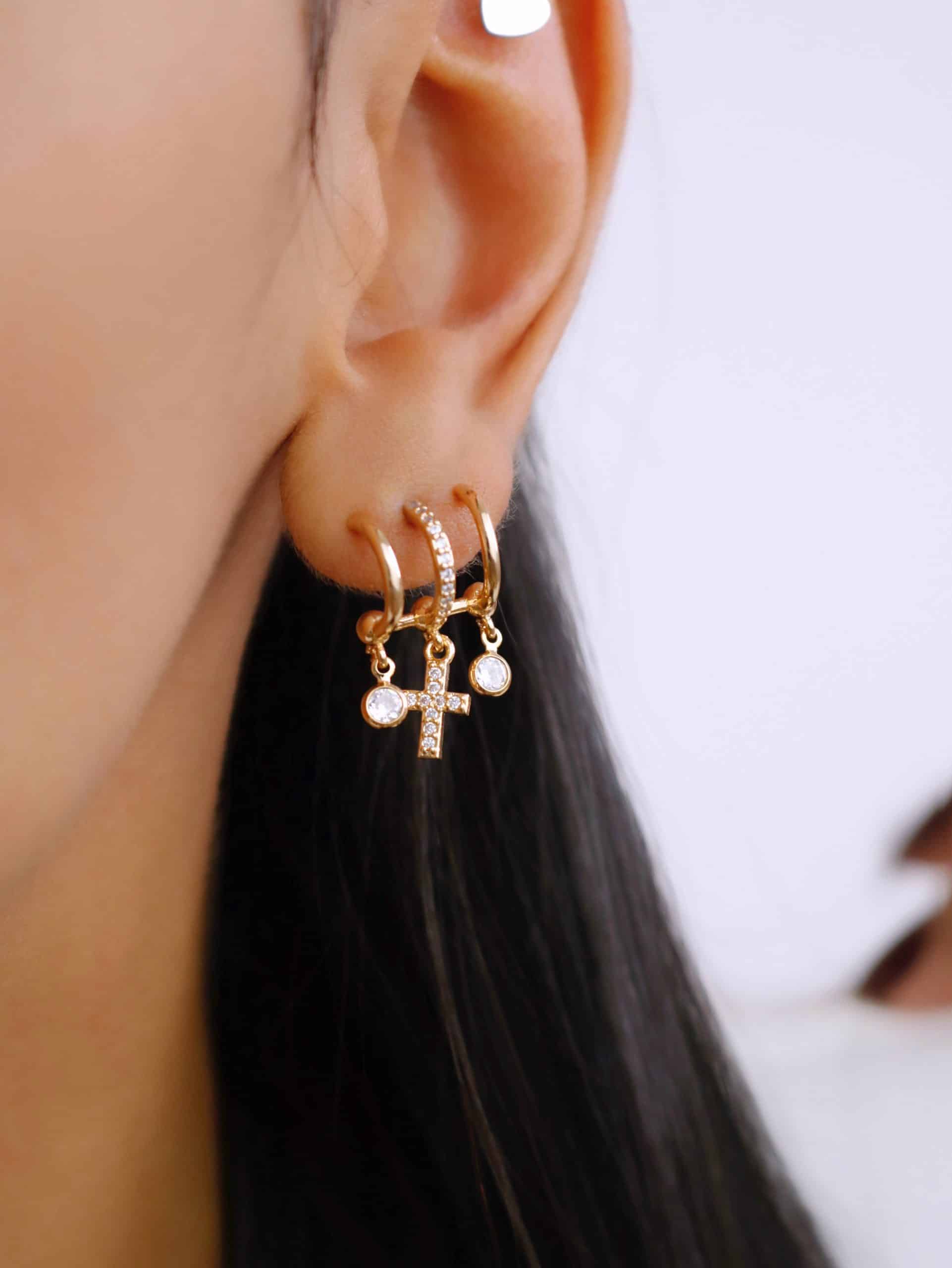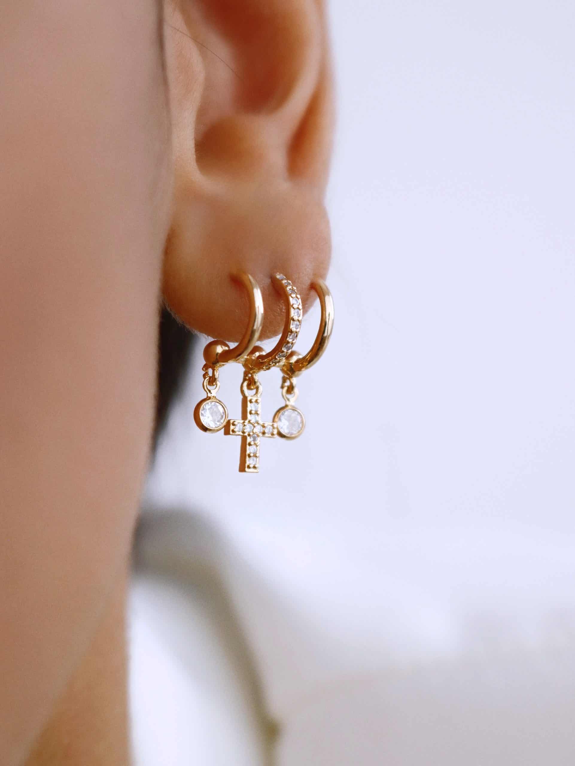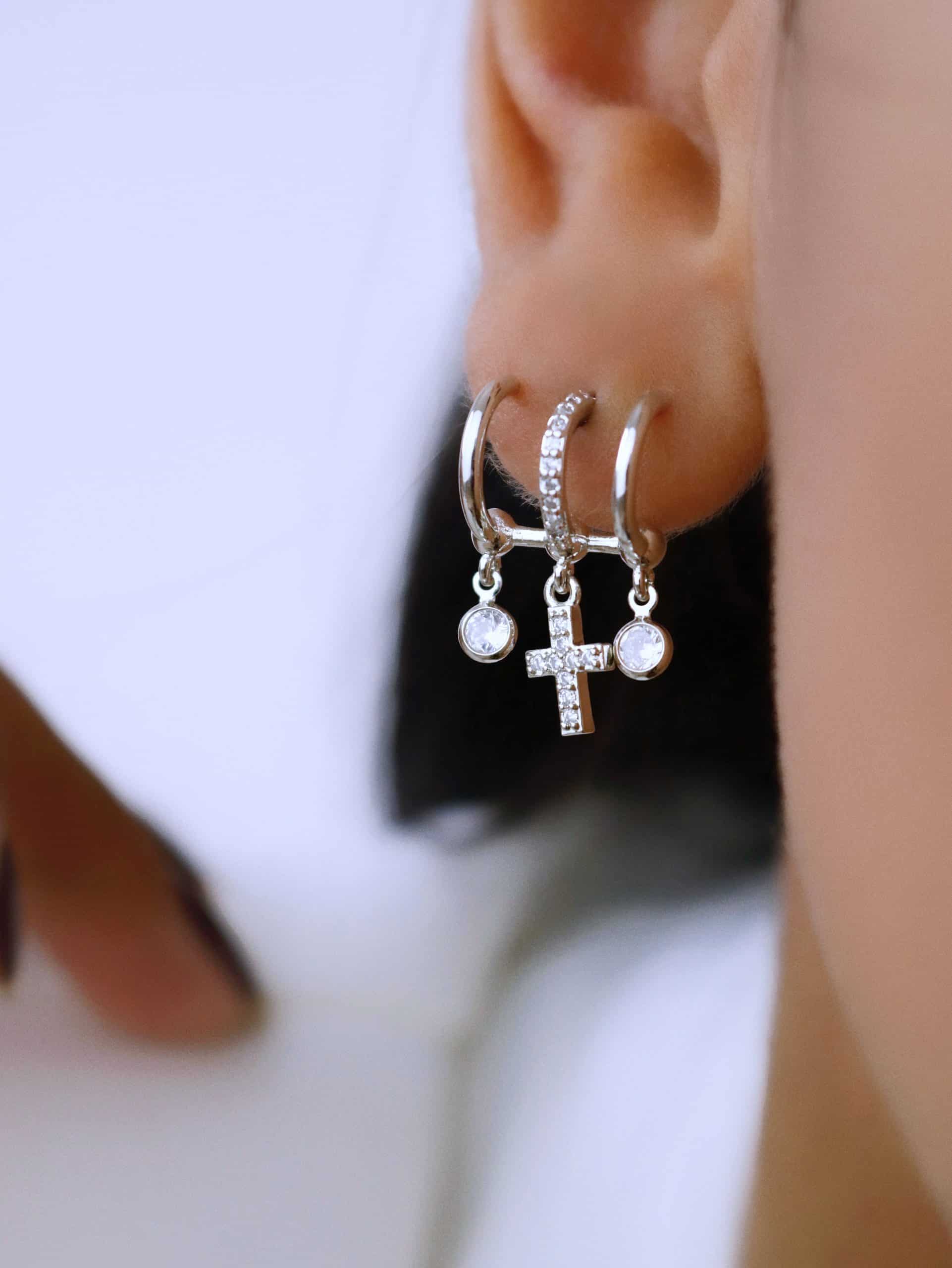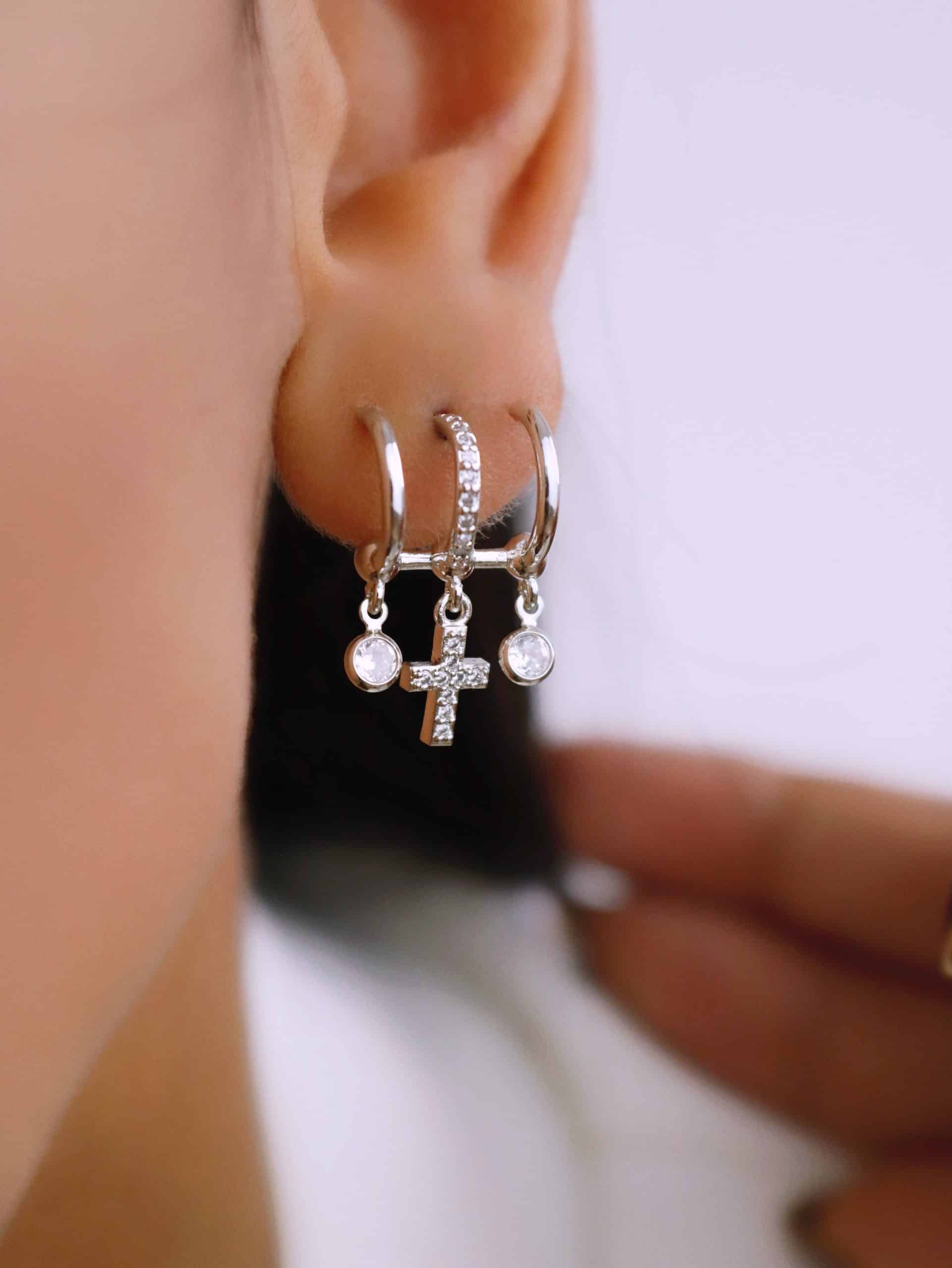 BRINCO ZIRCONIA TRES FAIXAS CRUZ CRAVEJADA E DOIS PONTOS DE LUZ