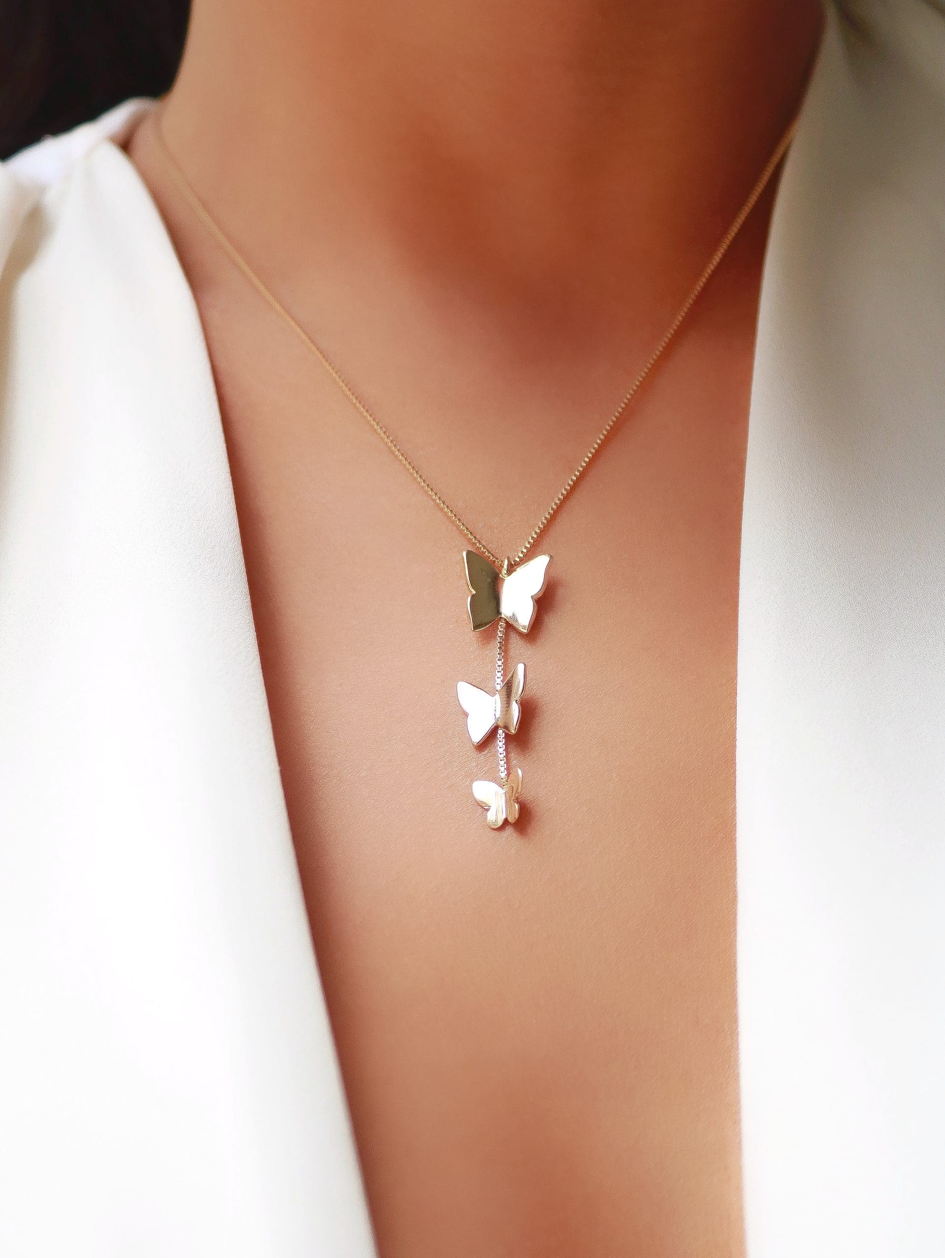 GARGANTILHA LISA GRAVATA COM TRES BORBOLETAS TAMANHOS DIFERENTES 45CM