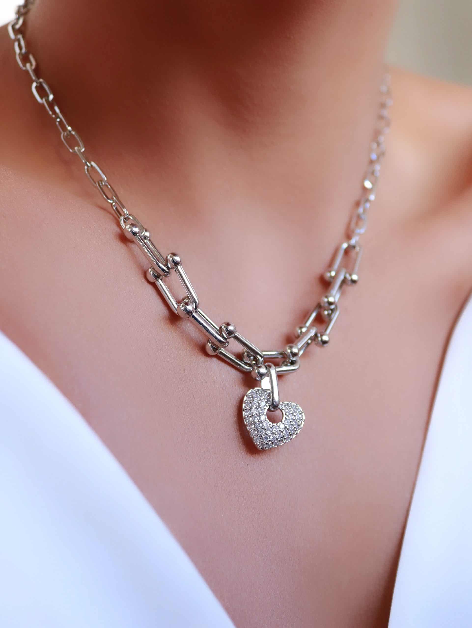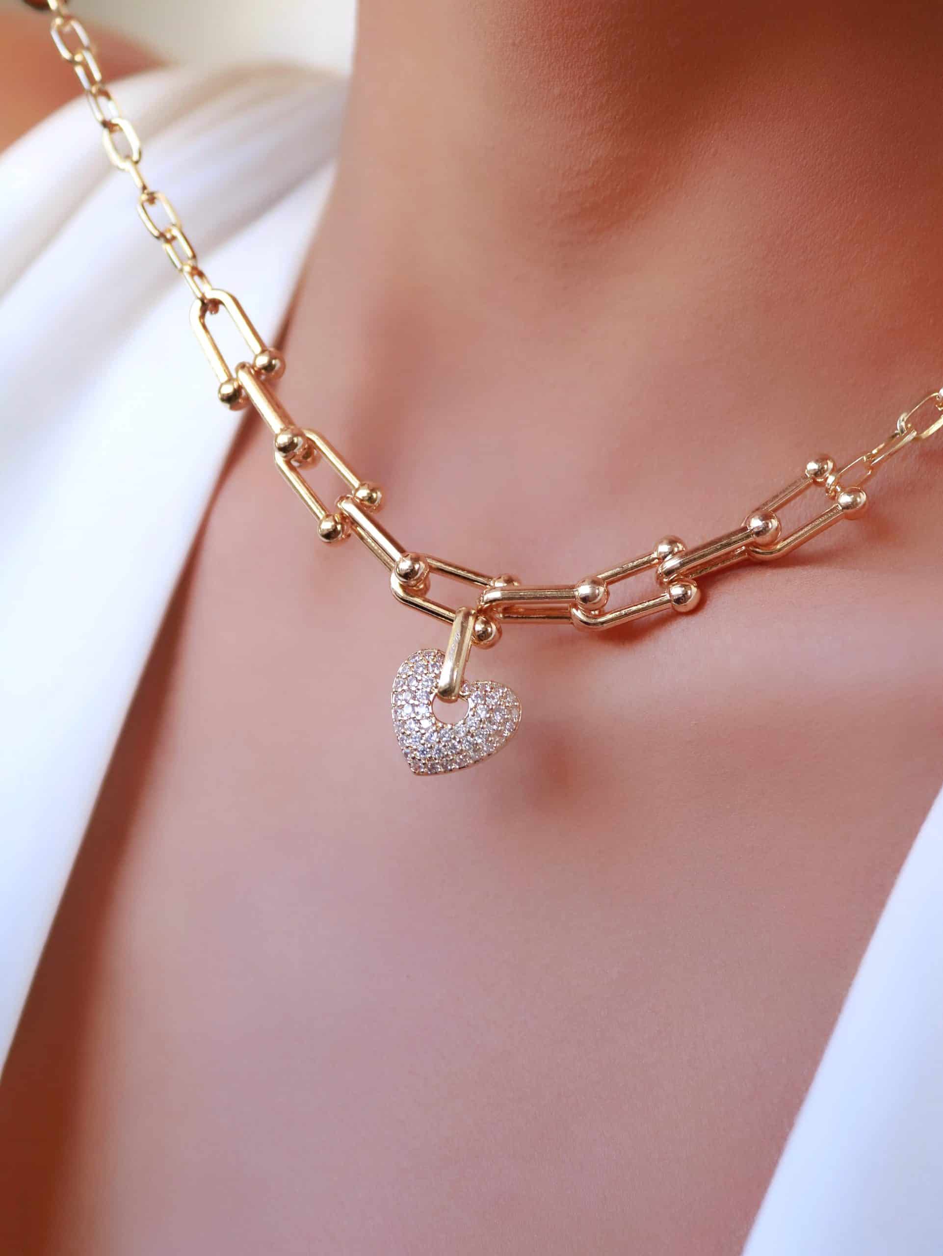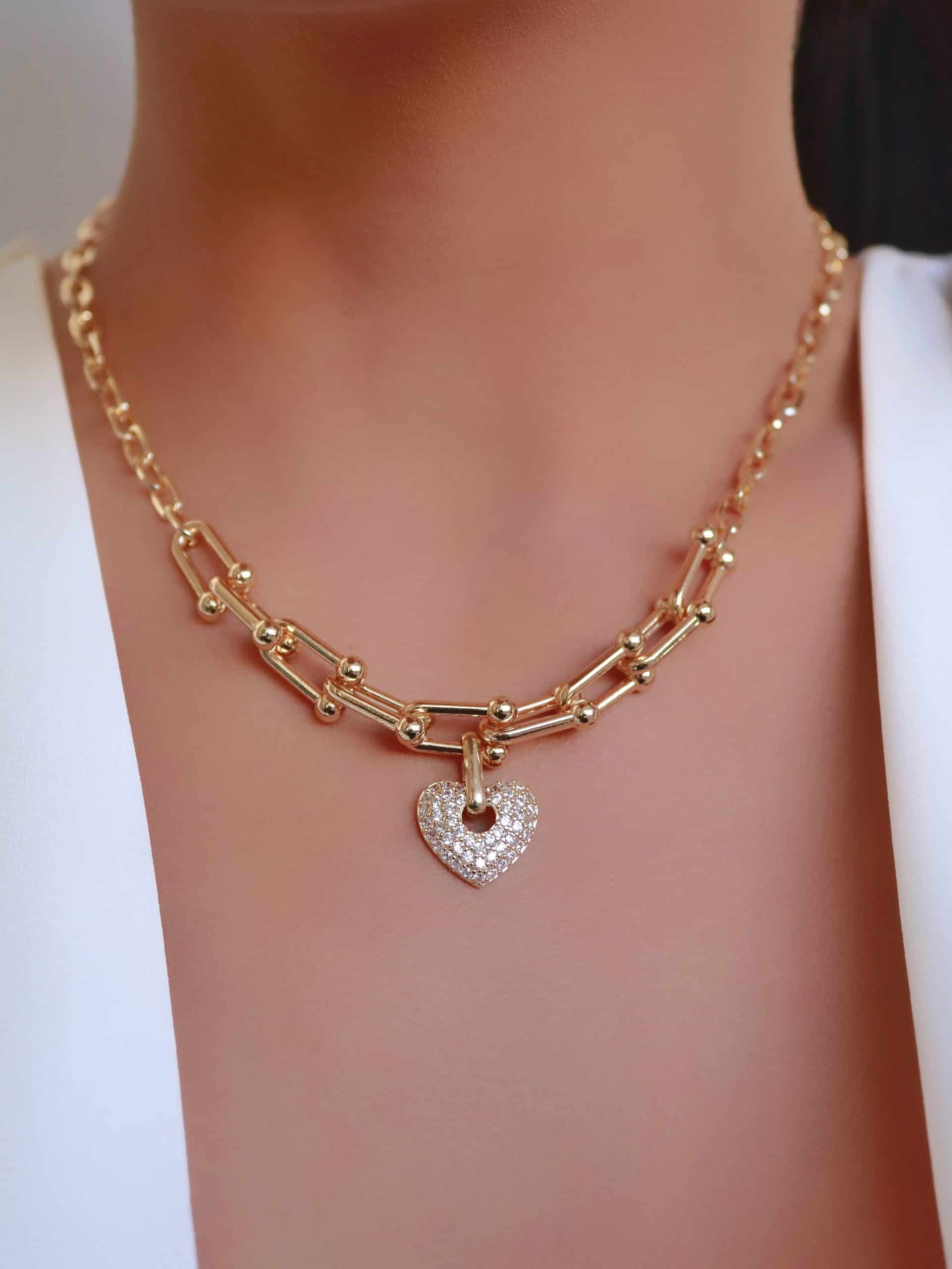 GARGANTILHA ZIRCONIA COM ELOS MAIORES E MENORES E CORACAO CRAVEJADO PENDURADO 45CM (PINGENTE 11.5 MM)