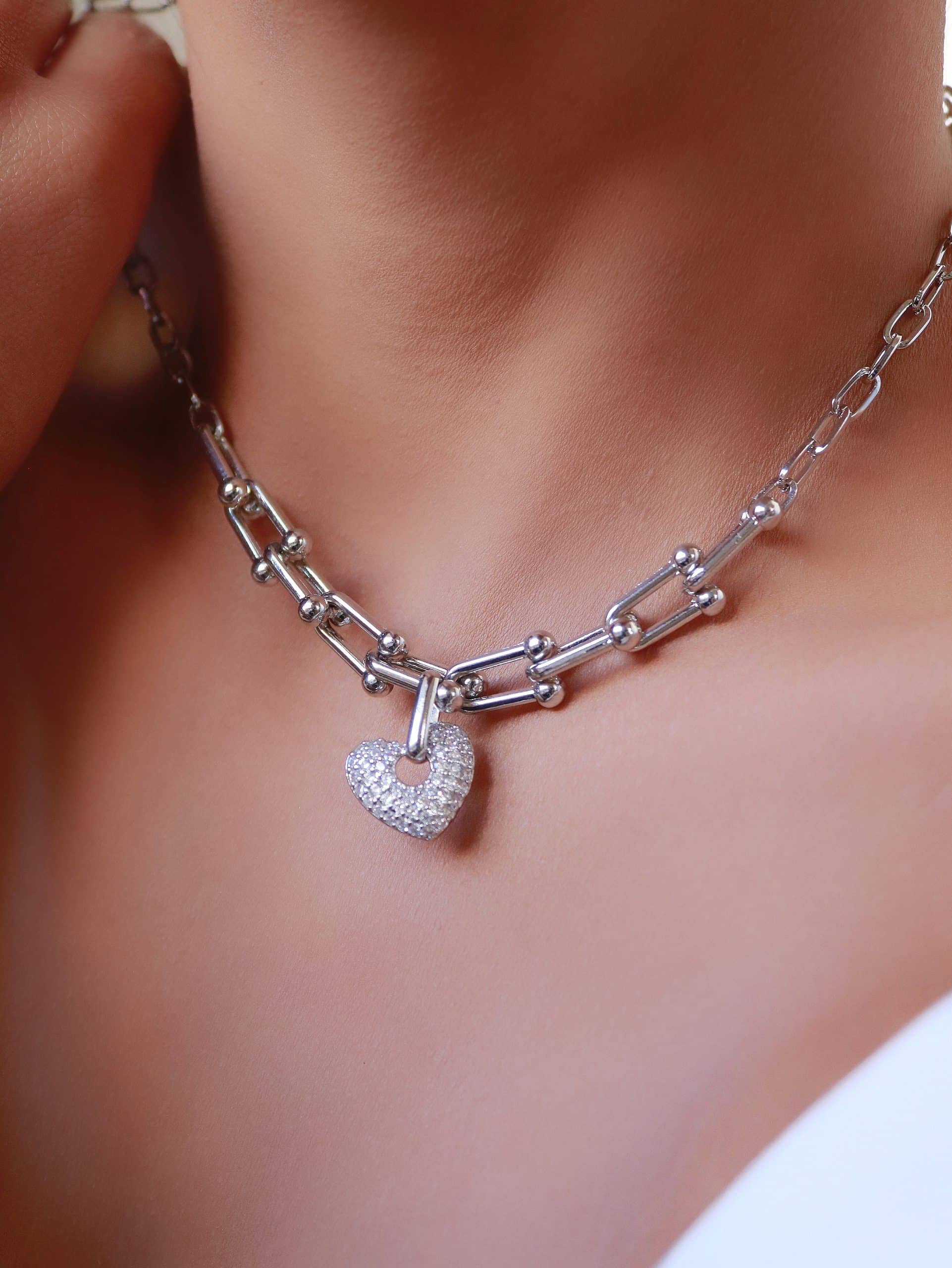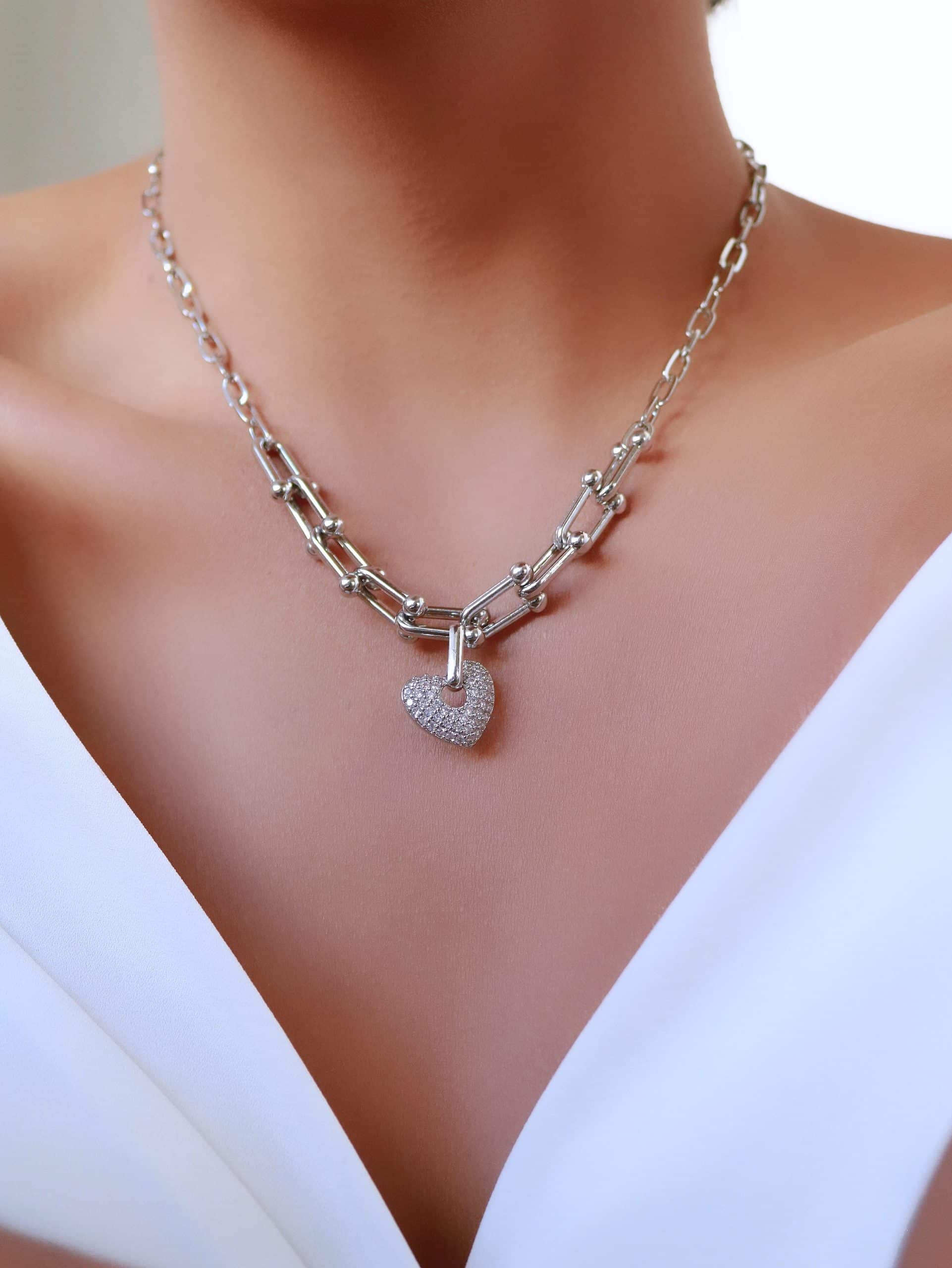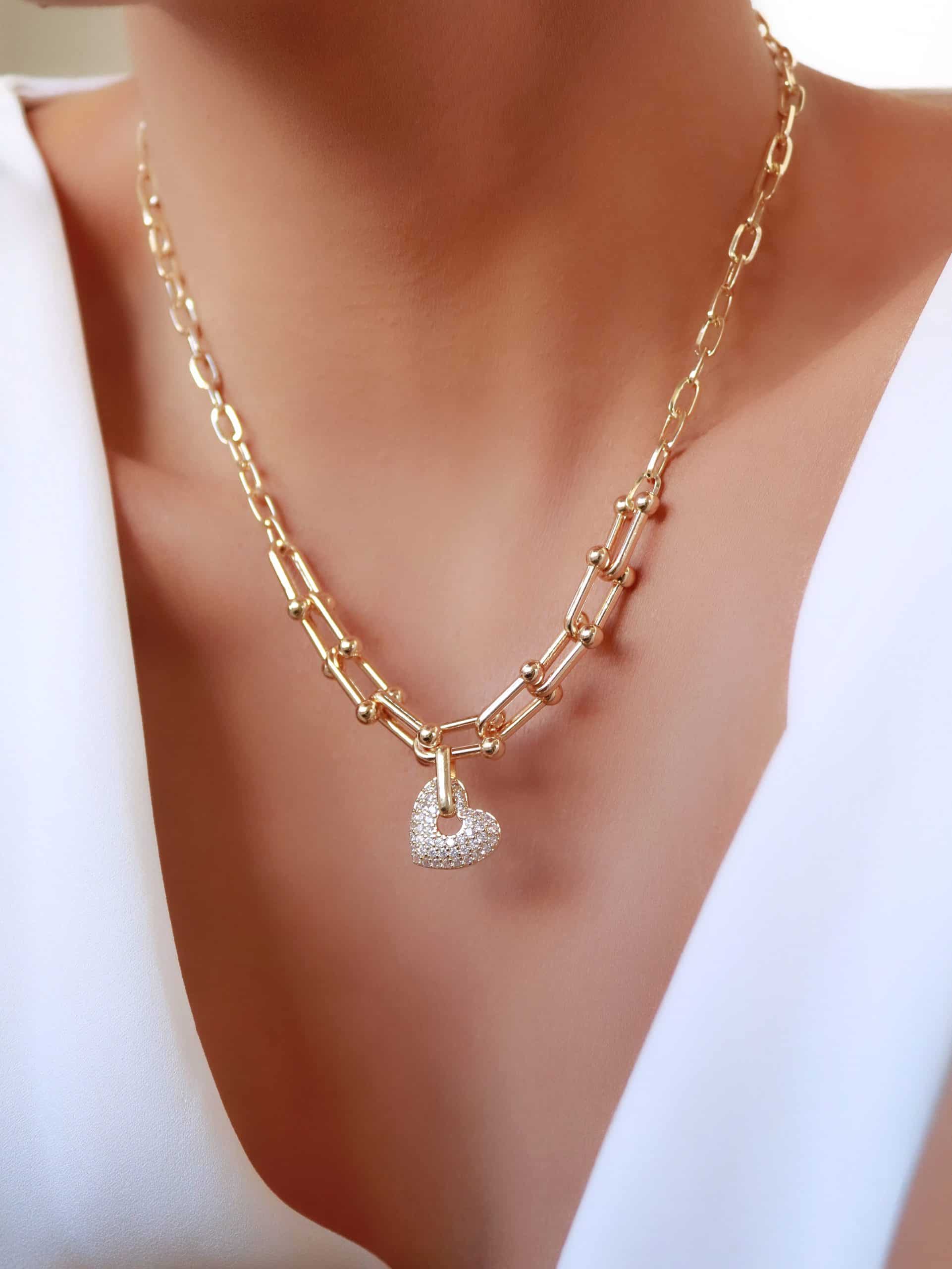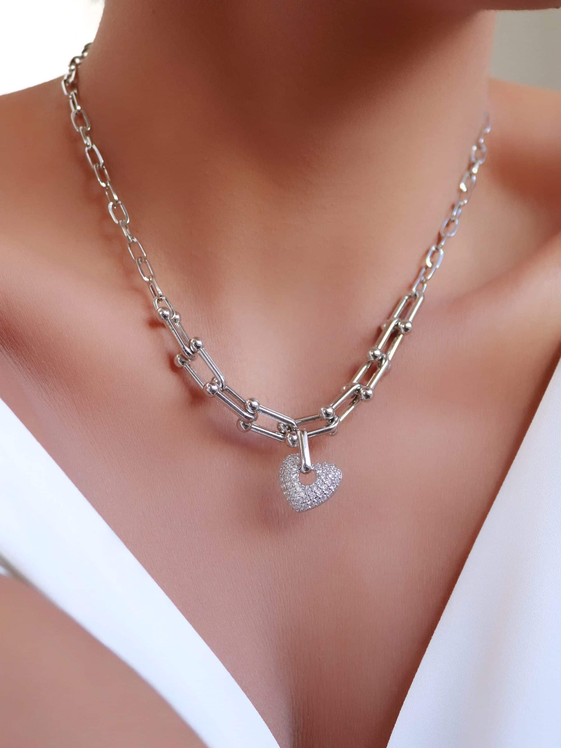 GARGANTILHA ZIRCONIA COM ELOS MAIORES E MENORES E CORACAO CRAVEJADO PENDURADO 45CM (PINGENTE 11.5 MM)