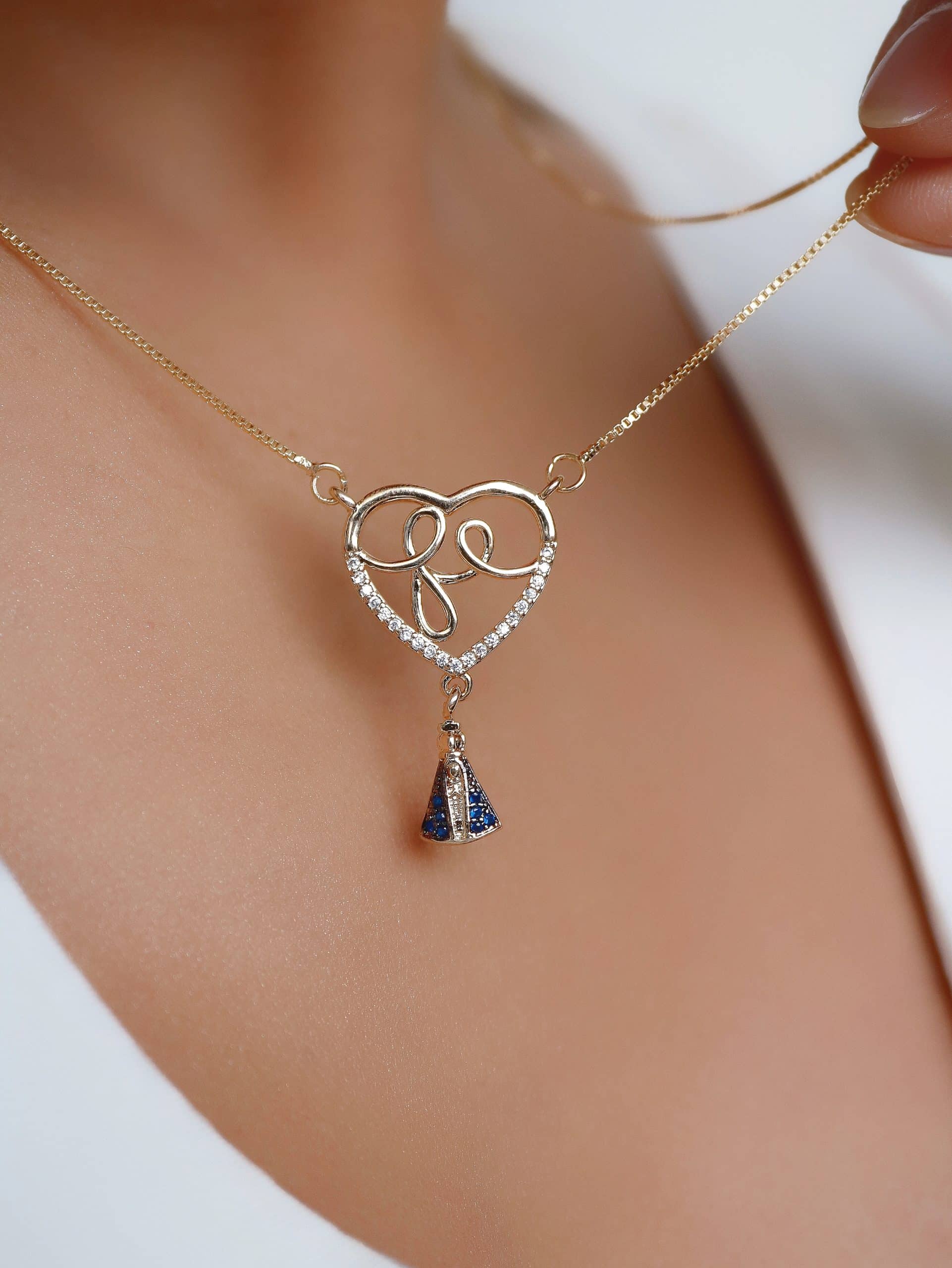 GARGANTILHA ZIRCONIA ESCRITO FE DENTRO DO CORACAO E A NOSSA SENHORA PENDURADA 40CM