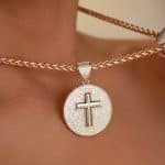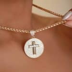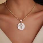 GARGANTILHA ZIRCONIA MEDALHA COM CRUZ DENTRO RÓDIO BRANCO E CORRENTE LISA ENTRELACADA 40CM
