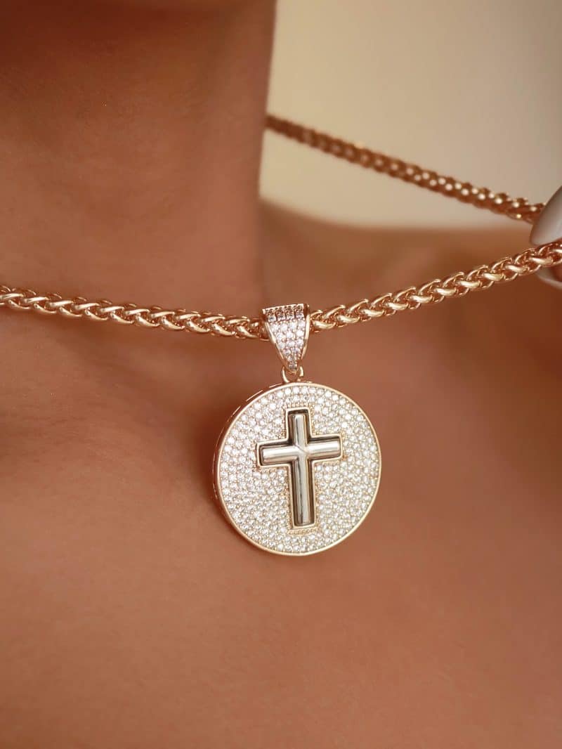 GARGANTILHA ZIRCONIA MEDALHA COM CRUZ DENTRO RÓDIO BRANCO E CORRENTE LISA ENTRELACADA 40CM