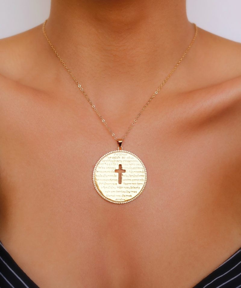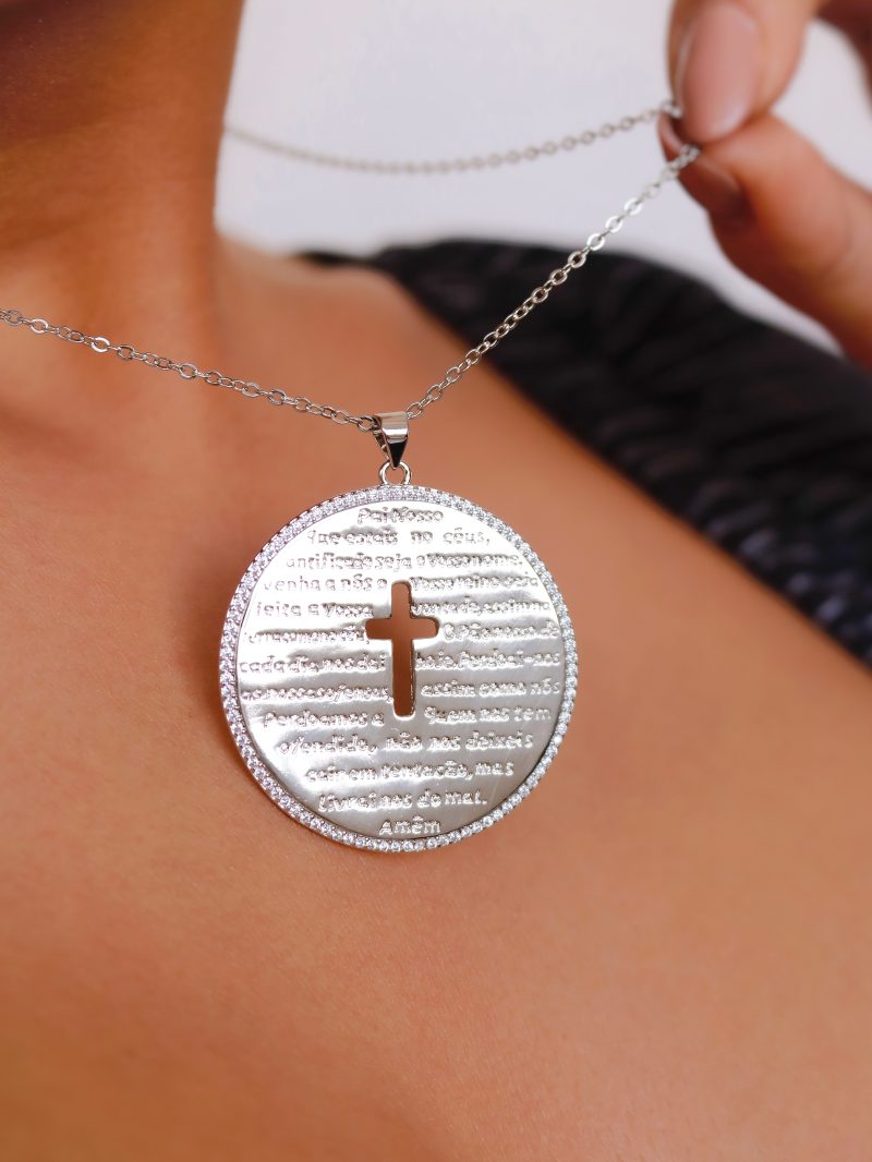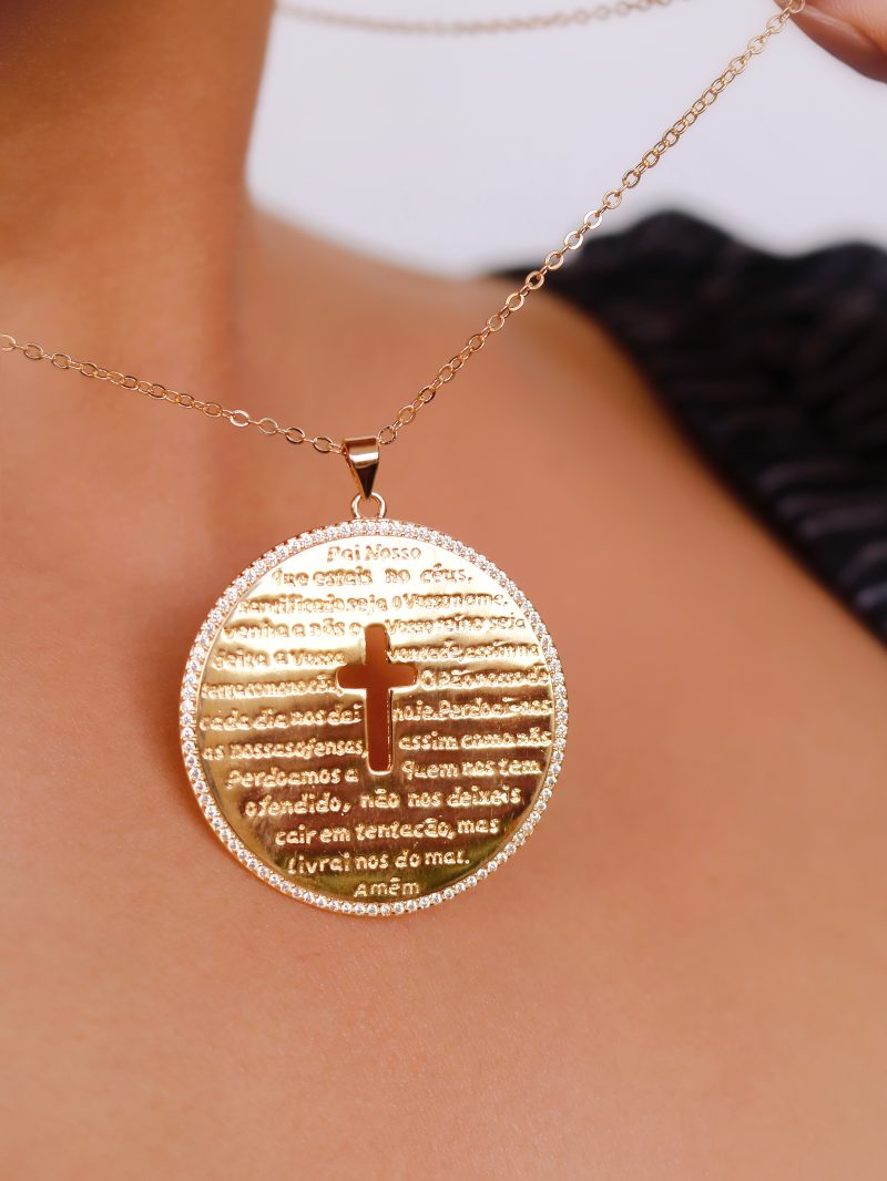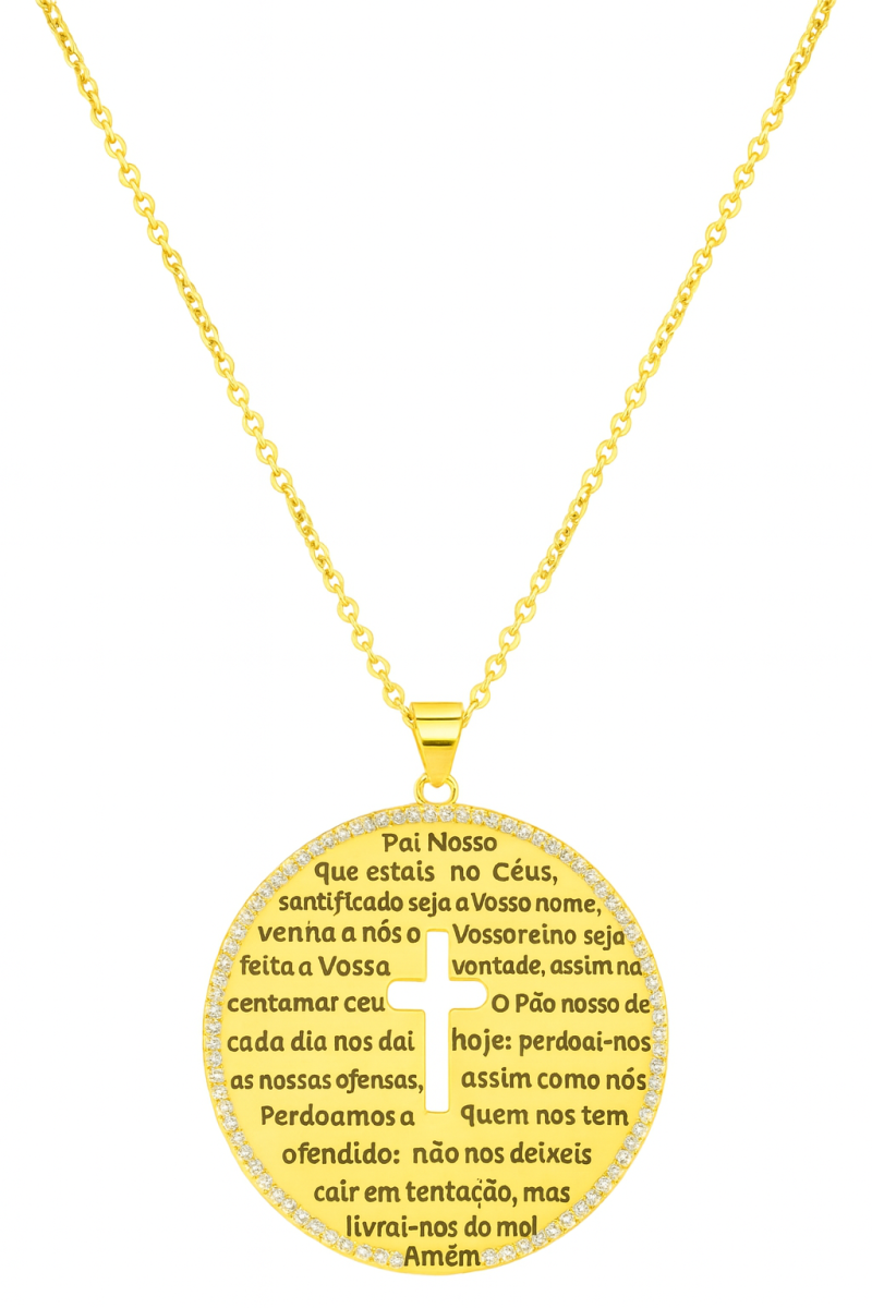 GARGANTILHA ZIRCONIA MEDALHA COM ORACAO PAI NOSSO E CRUZ VAZADA NO MEIO 45CM