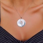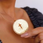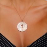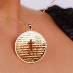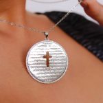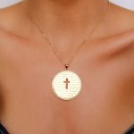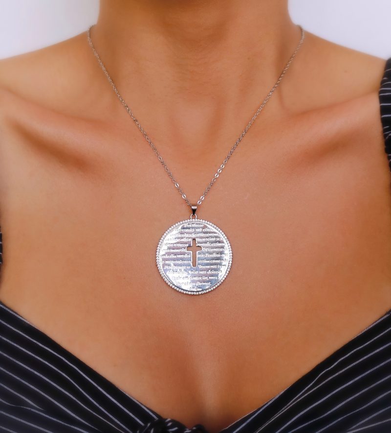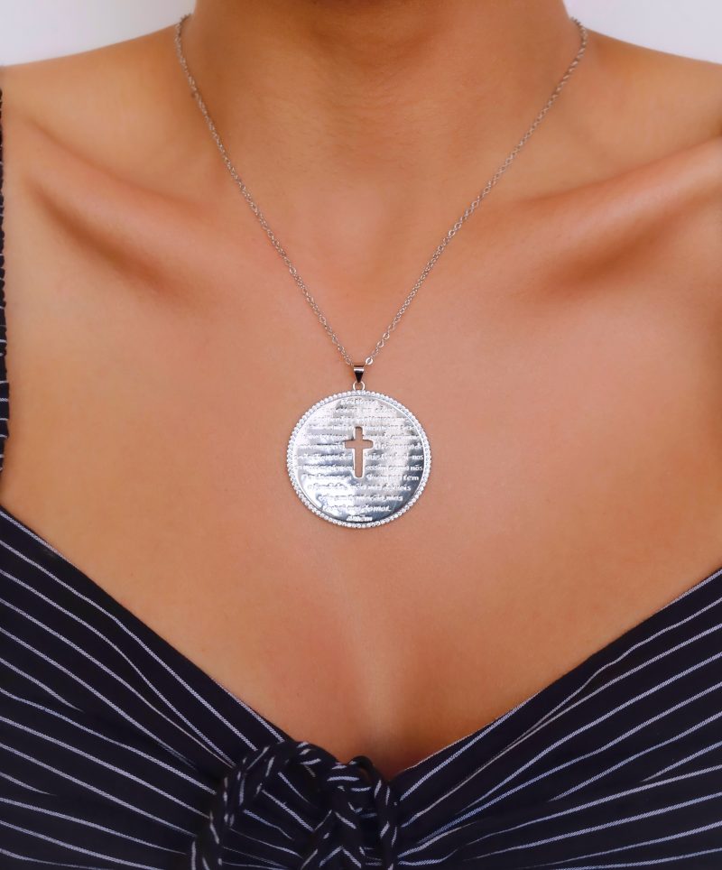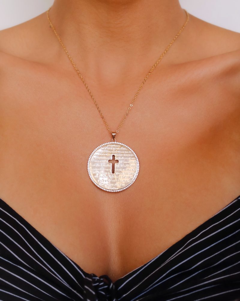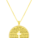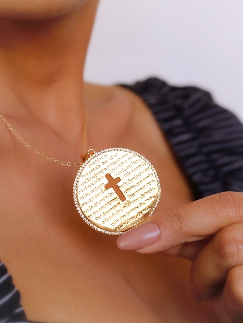 GARGANTILHA ZIRCONIA MEDALHA COM ORACAO PAI NOSSO E CRUZ VAZADA NO MEIO 45CM