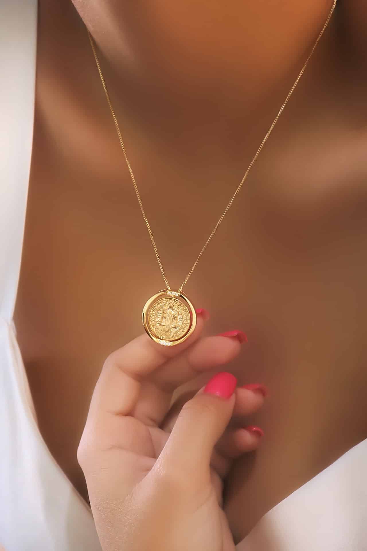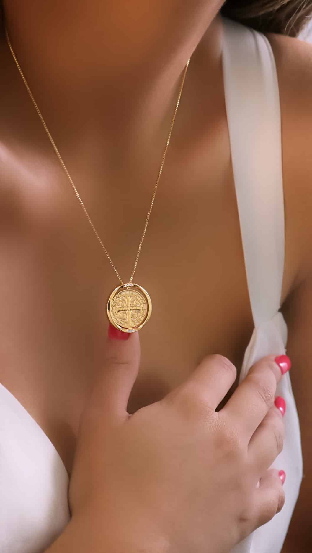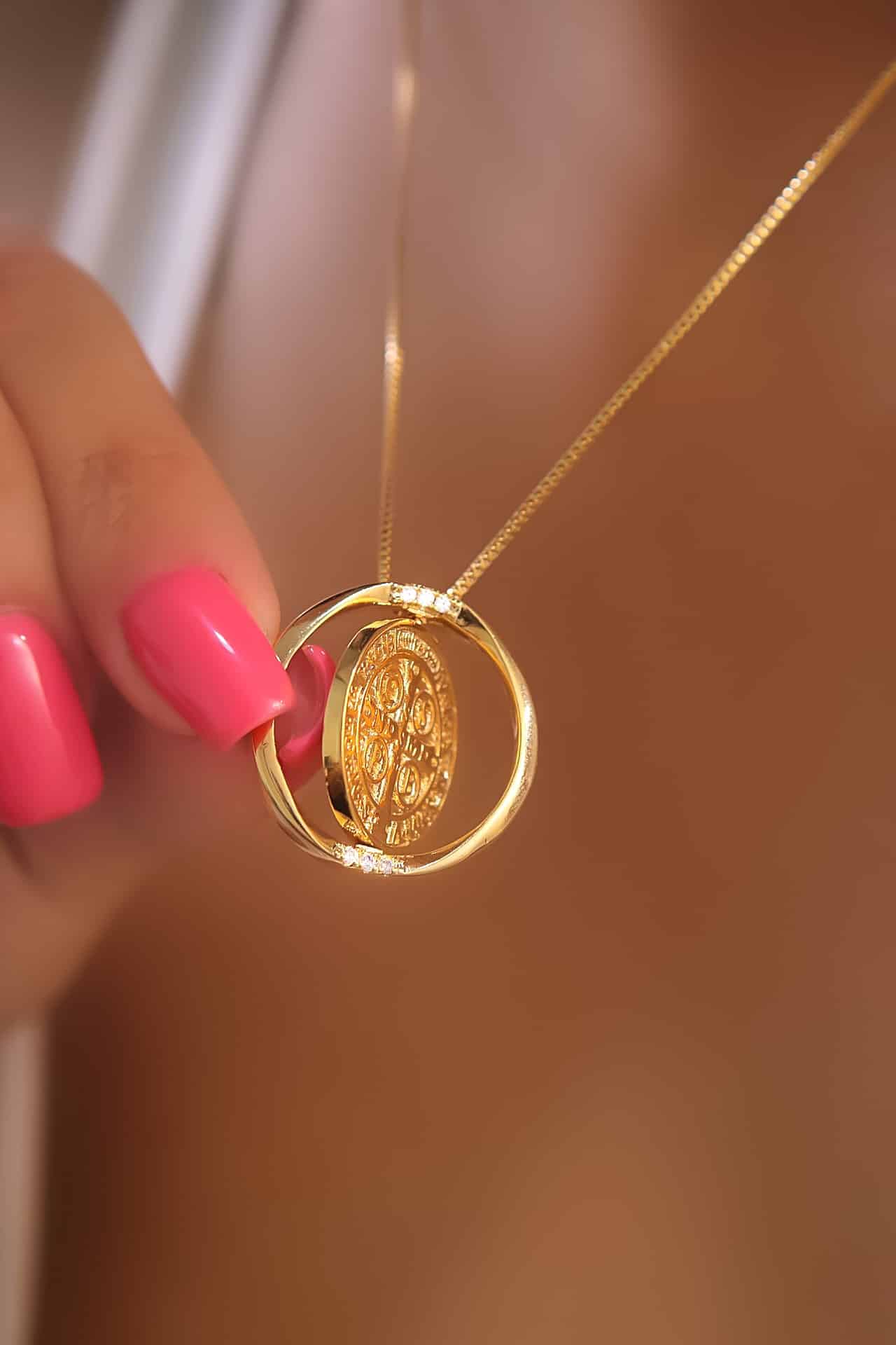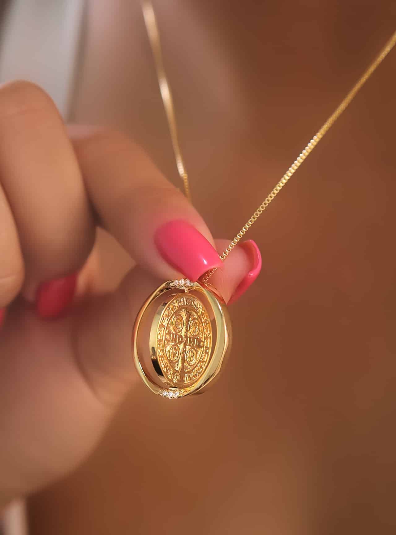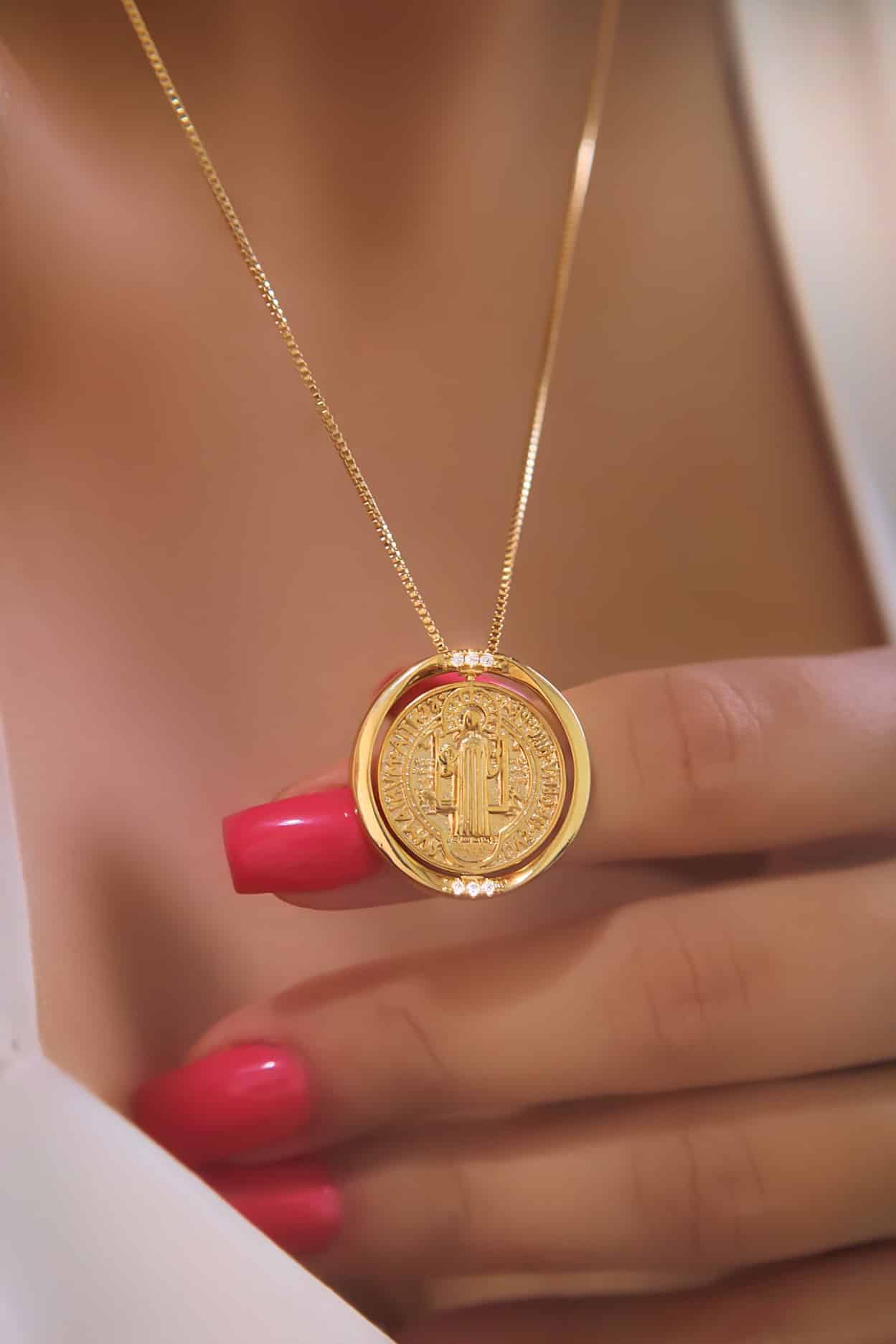 GARGANTILHA ZIRCONIA MEDALHA SAO BENTO QUE GIRA