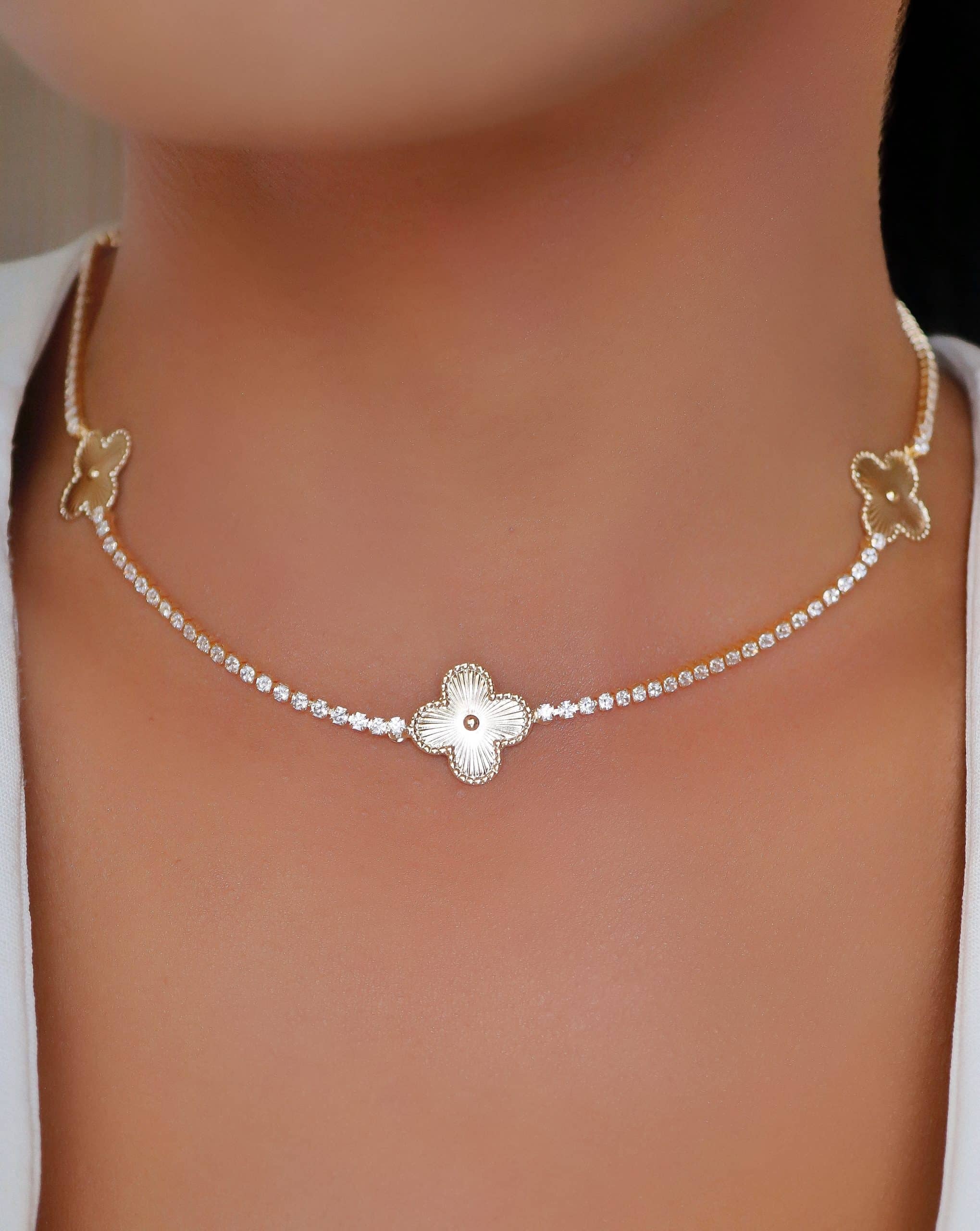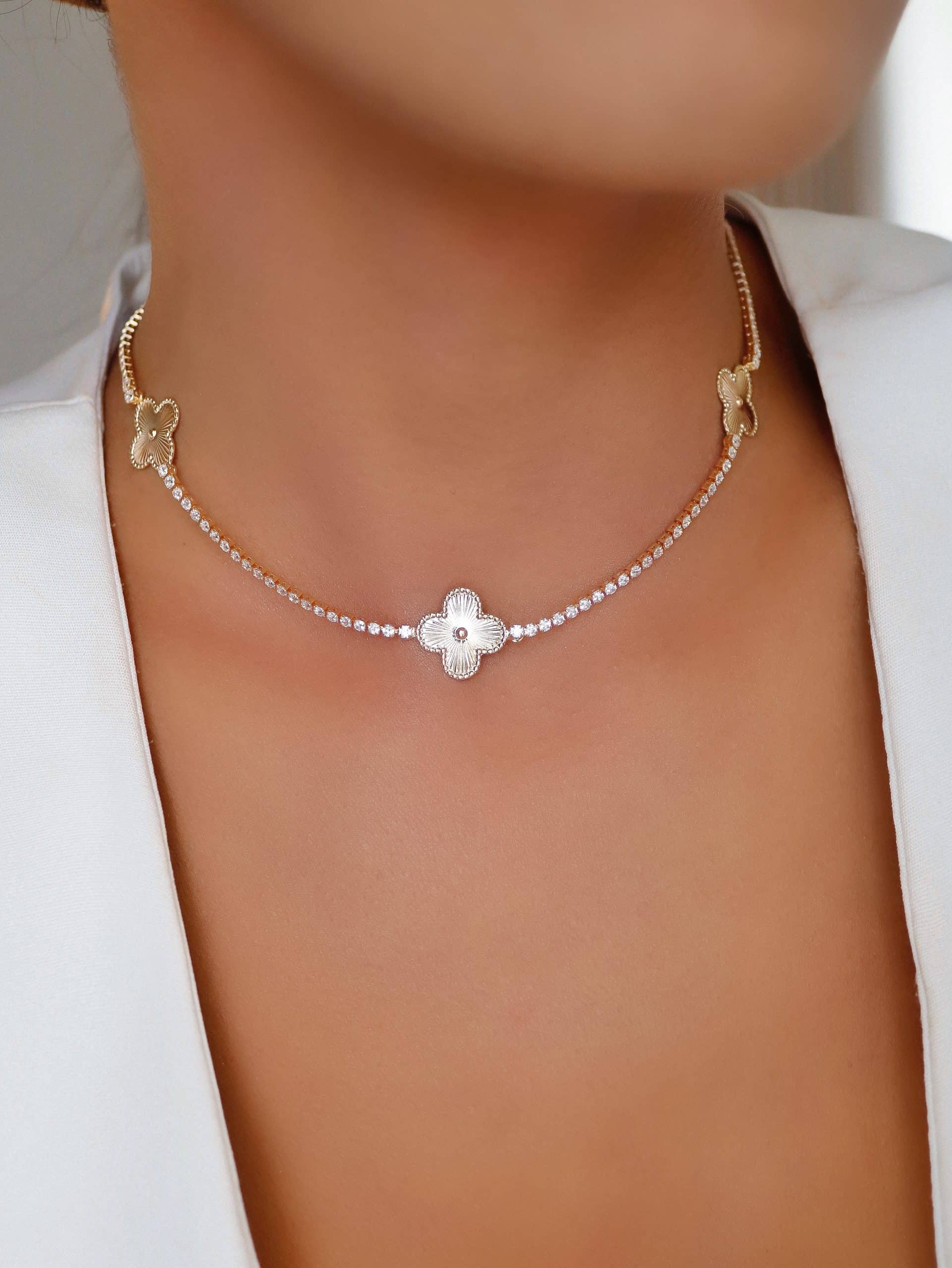 GARGANTILHA ZIRCONIA RIVIERA COM CINCO FLORES 35 CM 14.7 MM