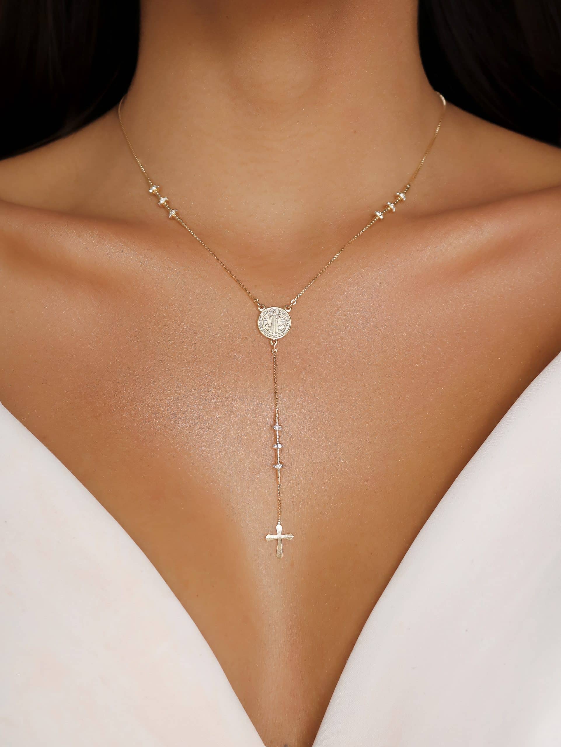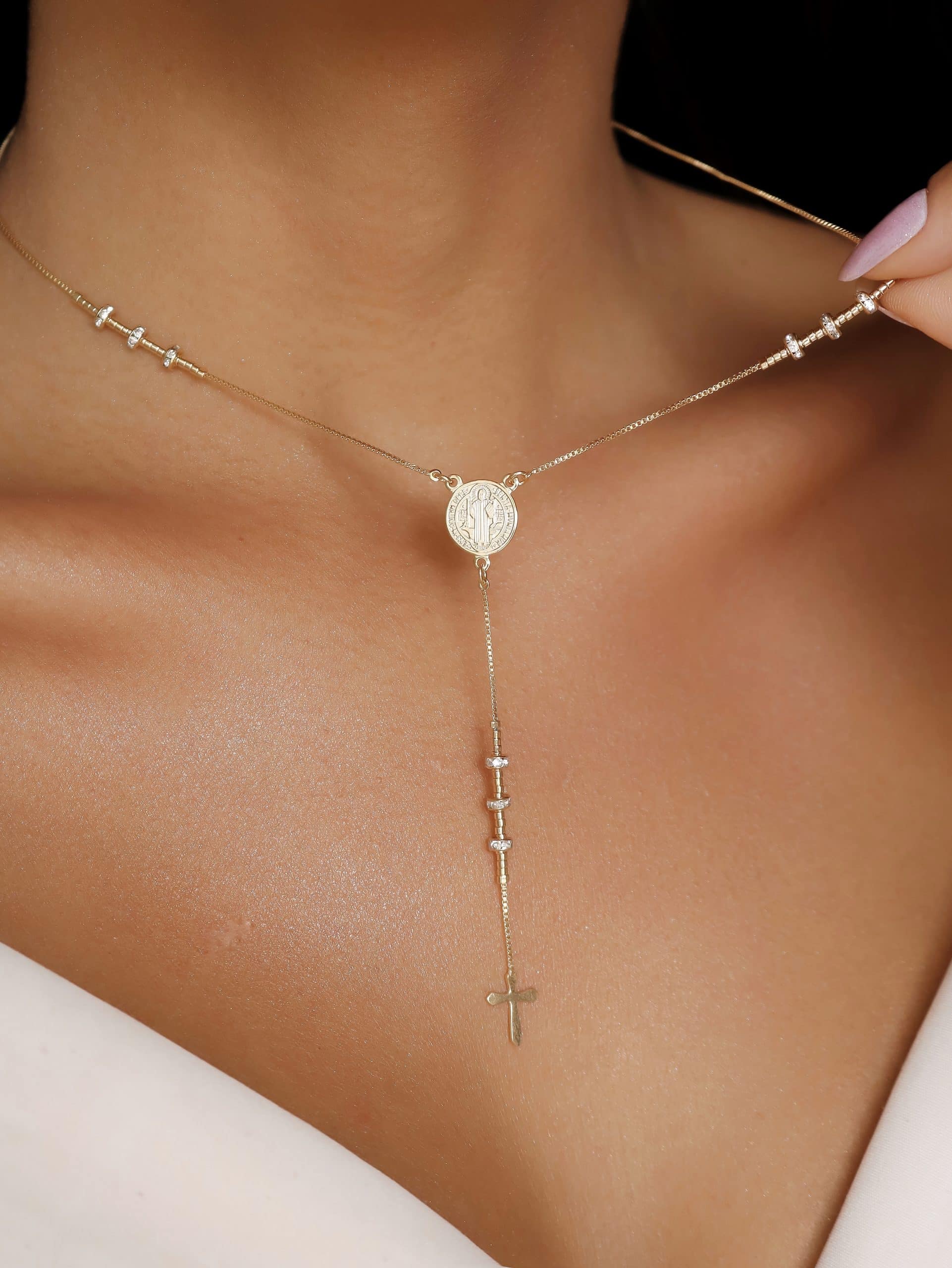 GARGANTILHA ZIRCONIA SAO BENTO COM CANUTILHOS E RODINHA TERÇO 40CM