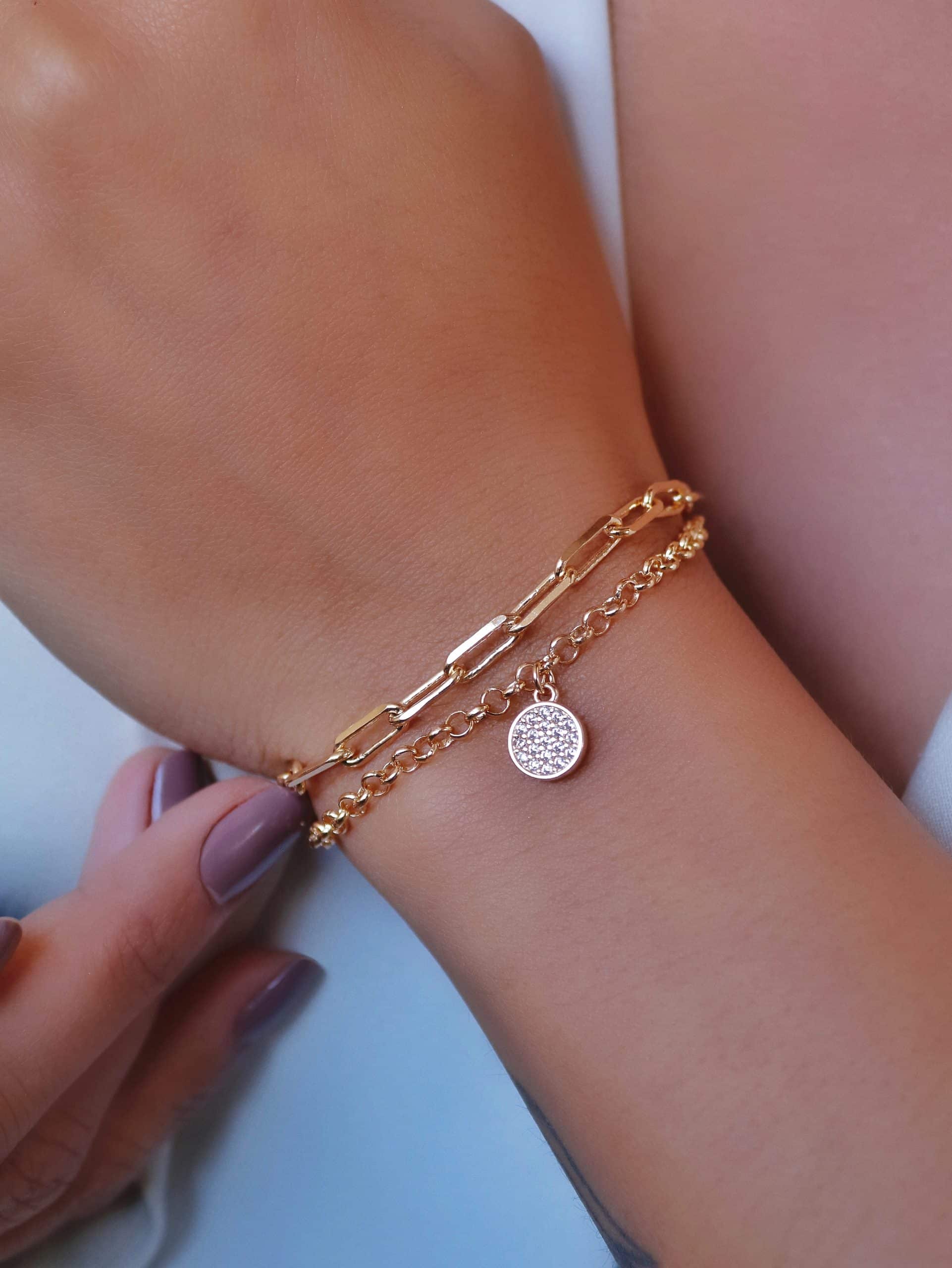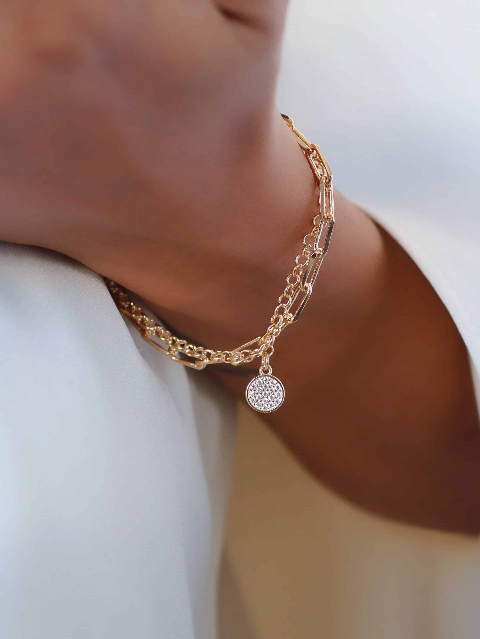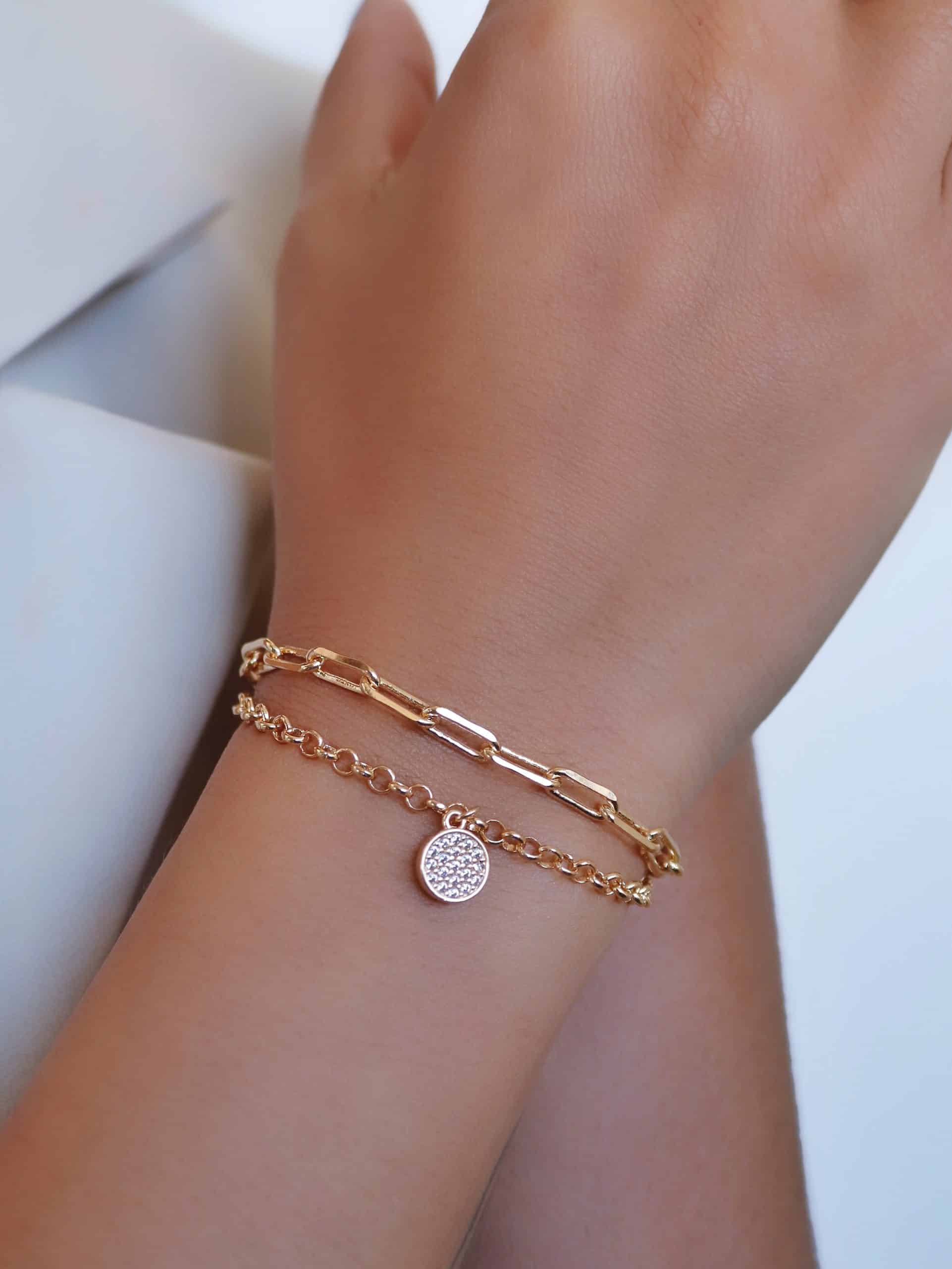 PULSEIRA ZIRCONIA METADE COM ELOS RETANGULARES E ELOS PORTUGUES COM PINGENTE REDONDO CRAVEJADO